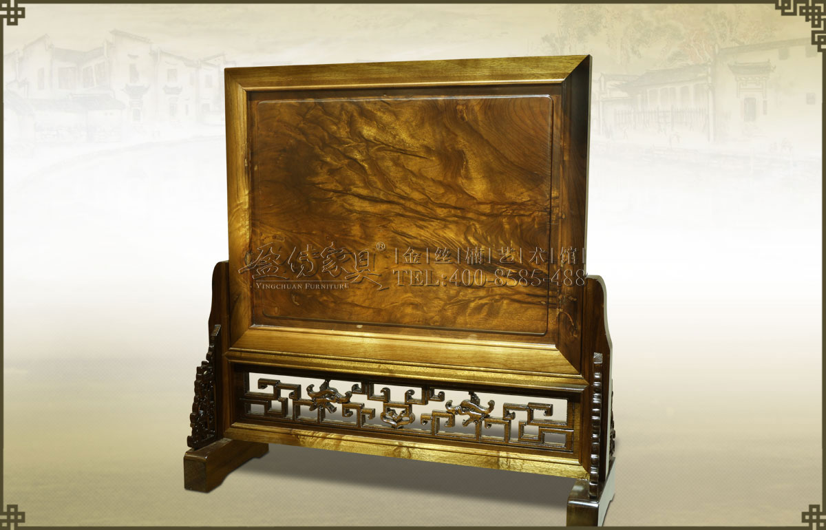 此金絲楠插屏做工考究。屏座以精湛的工藝透雕經典的逥紋圖案,精致細膩。屏扇無任何雕刻,也不需任何雕刻,因為上面有著奇特罕見的天然閃電云彩紋,像一朵朵云彩,又像雷鳴閃電。紋...