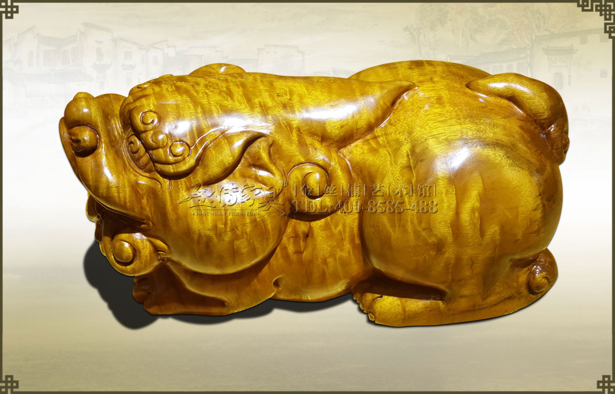 貔貅是中國古代神話傳說中的一種神獸,龍頭、馬身、麟腳,形似獅,喜歡金錢之味,能吞金錢而從不泄,故有納食四方之財的寓意。 此金絲楠貔貅伏在錢袋上,強壯健碩,神態威風凜凜...