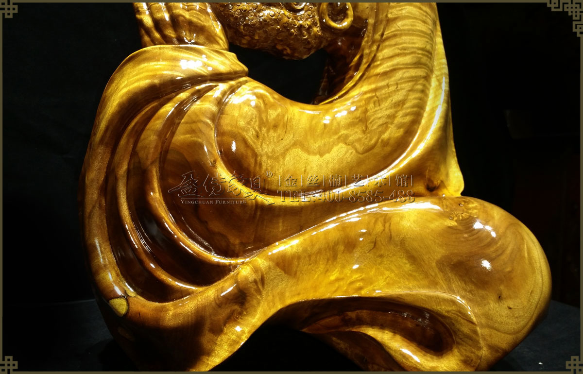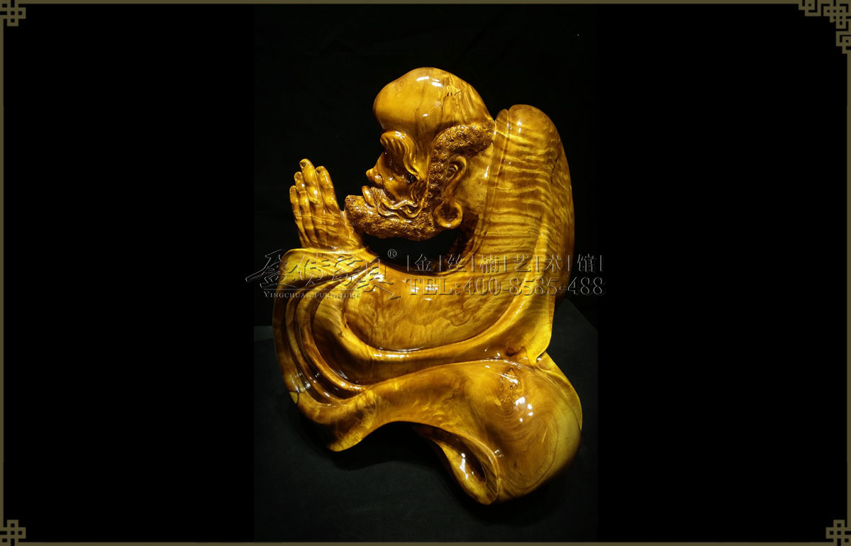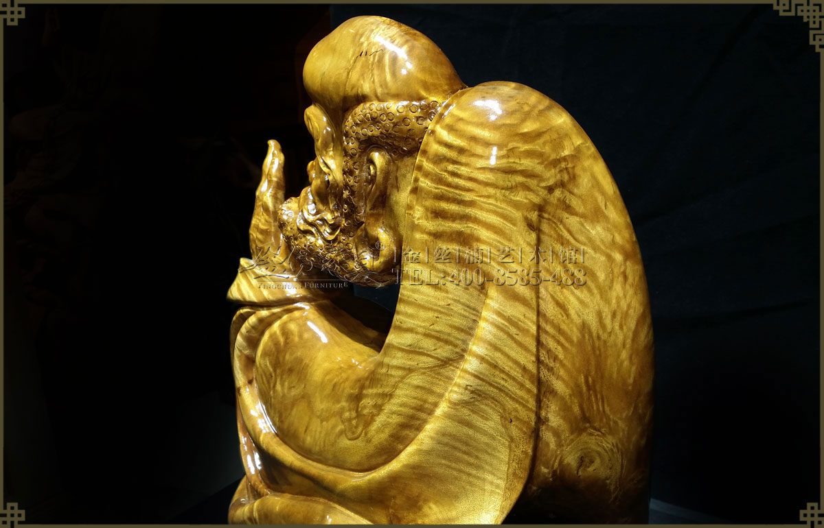 此金絲楠達摩雕刻十分精細,面部表情入木三分,惟妙惟肖,工藝家將其面壁枯坐九年的精神形象完美展示出來。且水波紋非常豐富清晰,整體十分華麗尊貴,具有很高的藝術價值和欣賞價值。