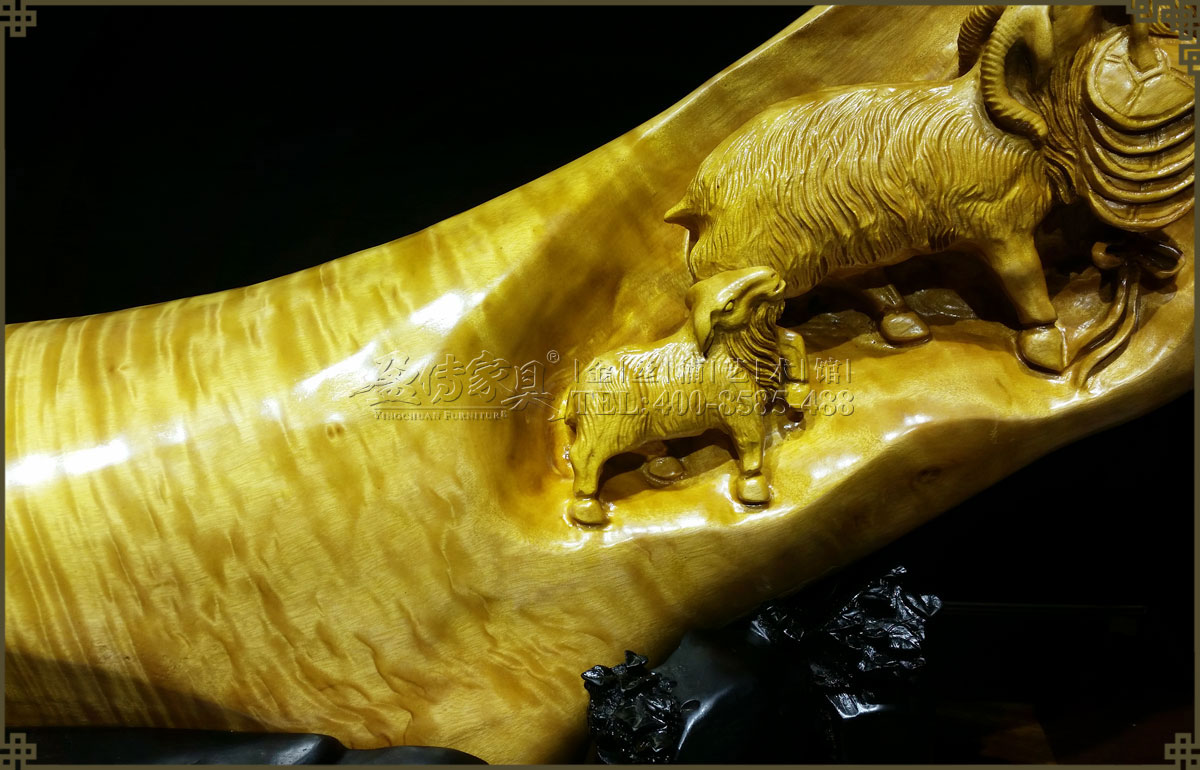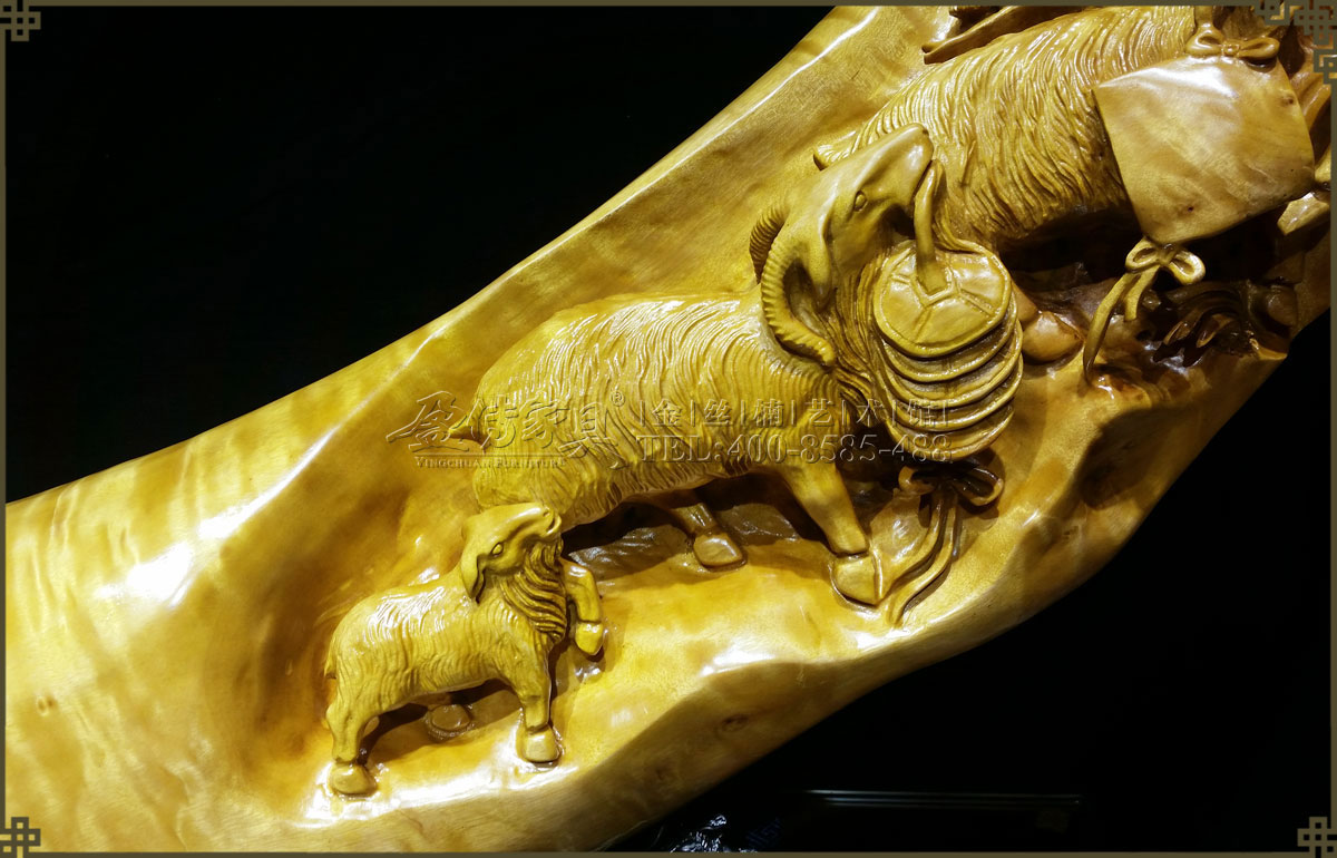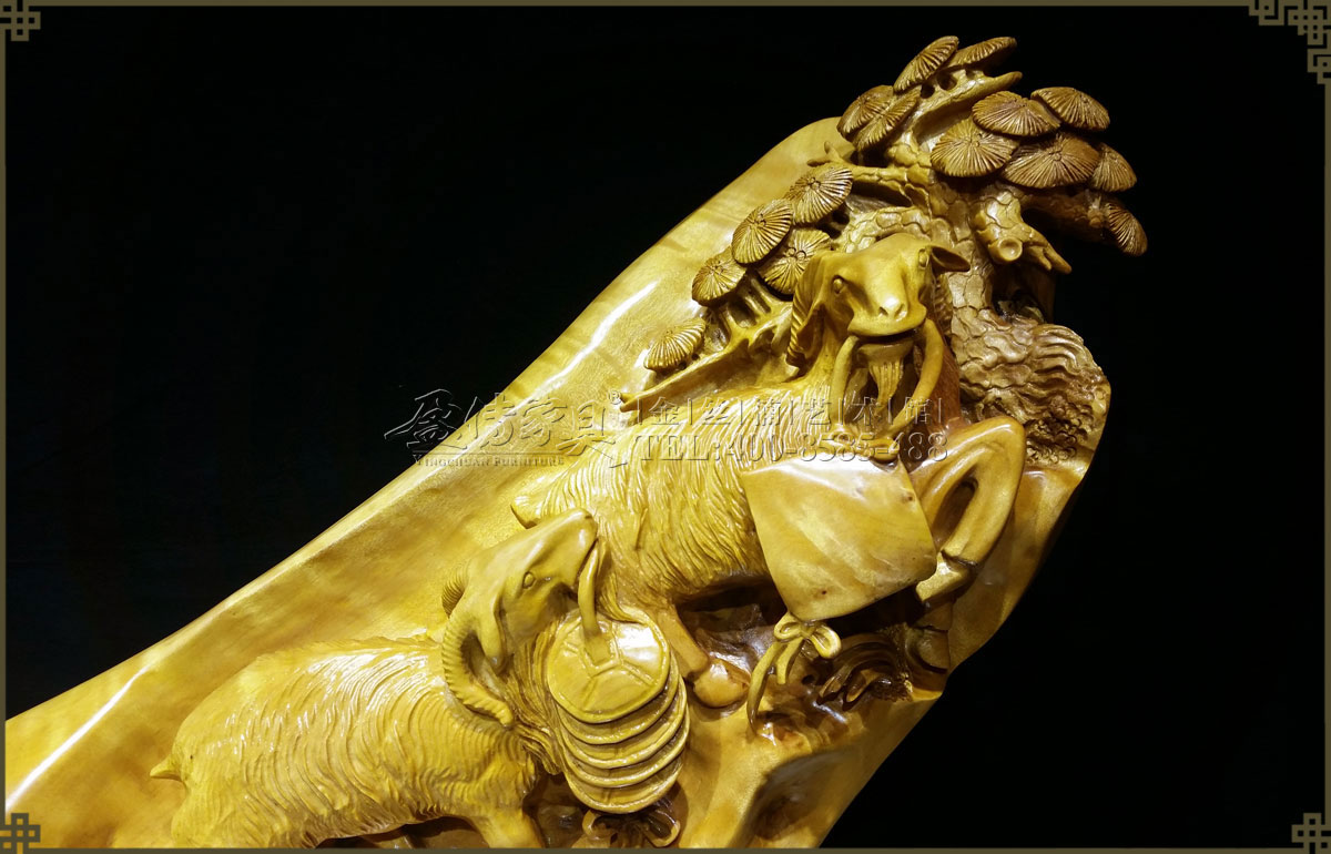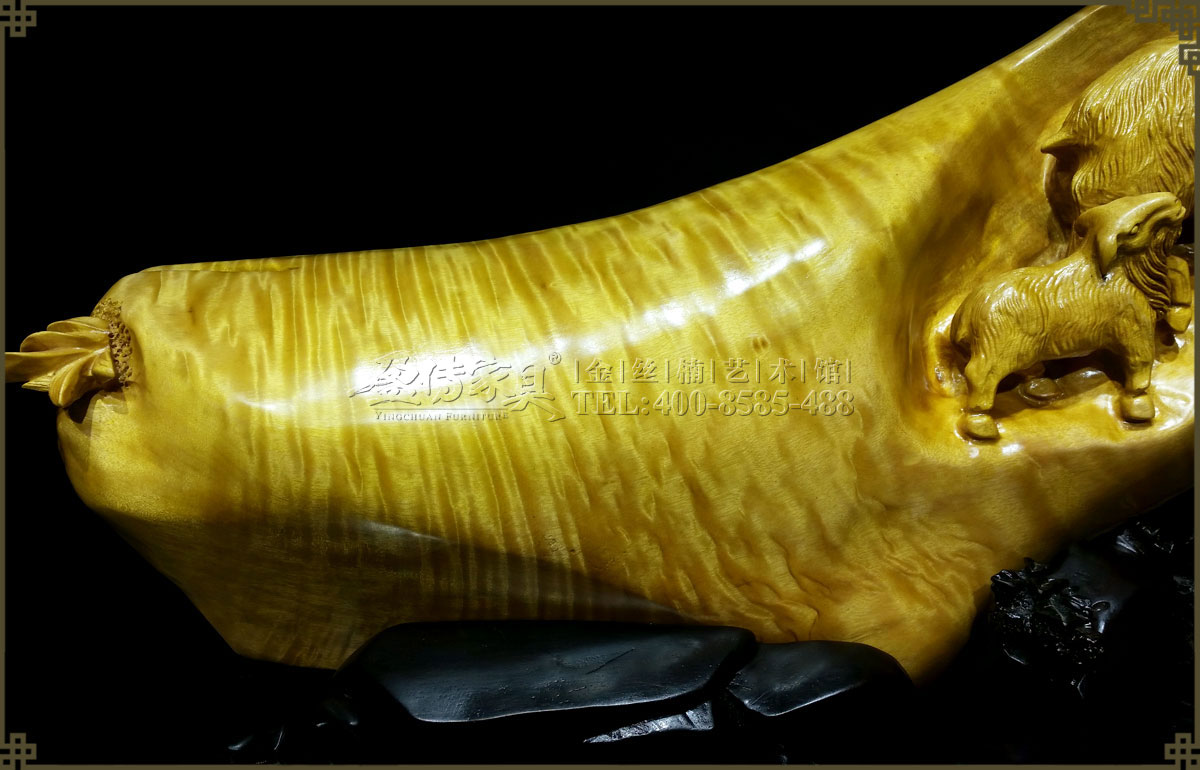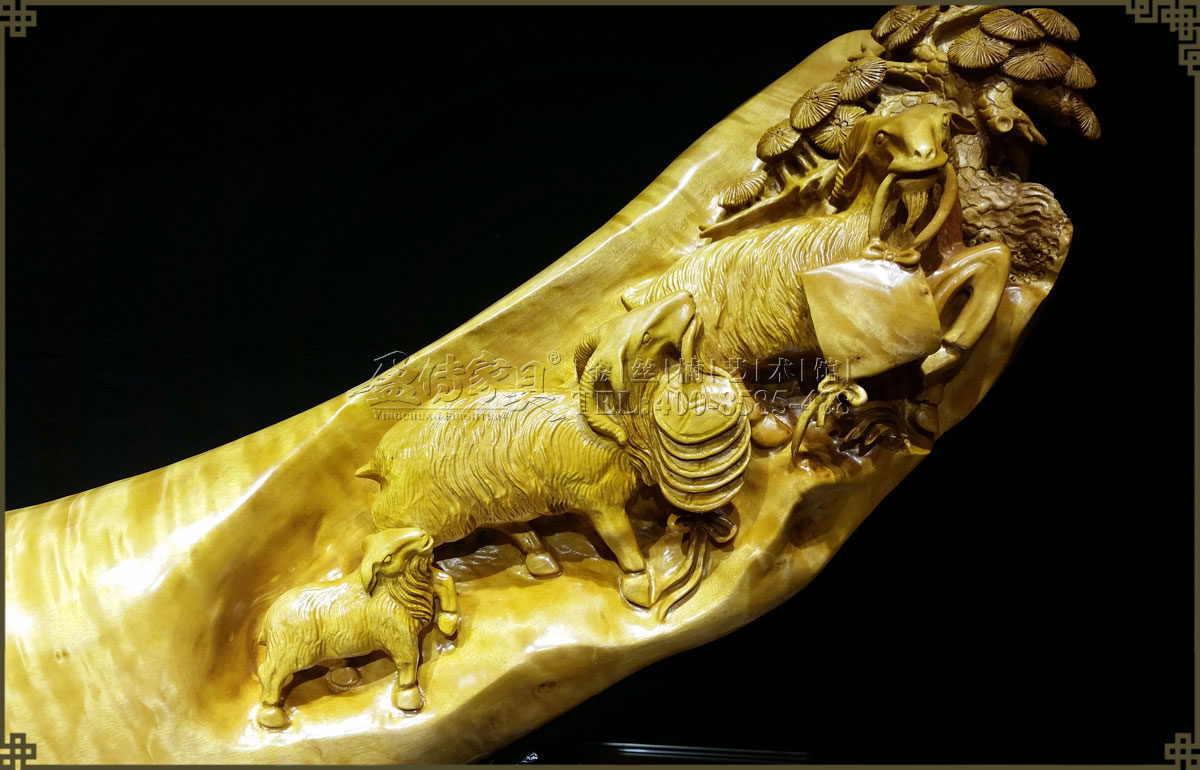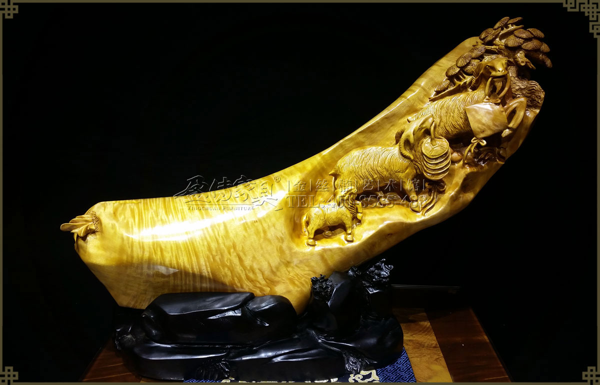“三羊”諧音“三陽”,表示春天的開始,而“開泰”則是“大開財路”的意思,也寓意吉祥如意。此金絲楠“三羊開泰”做工考究,雕工細膩,尤其是松樹和羊毛非常精細、逼真。三只羊都抬頭挺胸,矯健地并立在懸崖峭壁上,給人感覺超強的忍耐力和高昂的斗志。選料精,有金絲萬縷,光亮絢麗,富麗堂皇。密集清晰的水波紋更是魅力四射,攝人心魄,堪稱極品,具有很高的收藏價值。