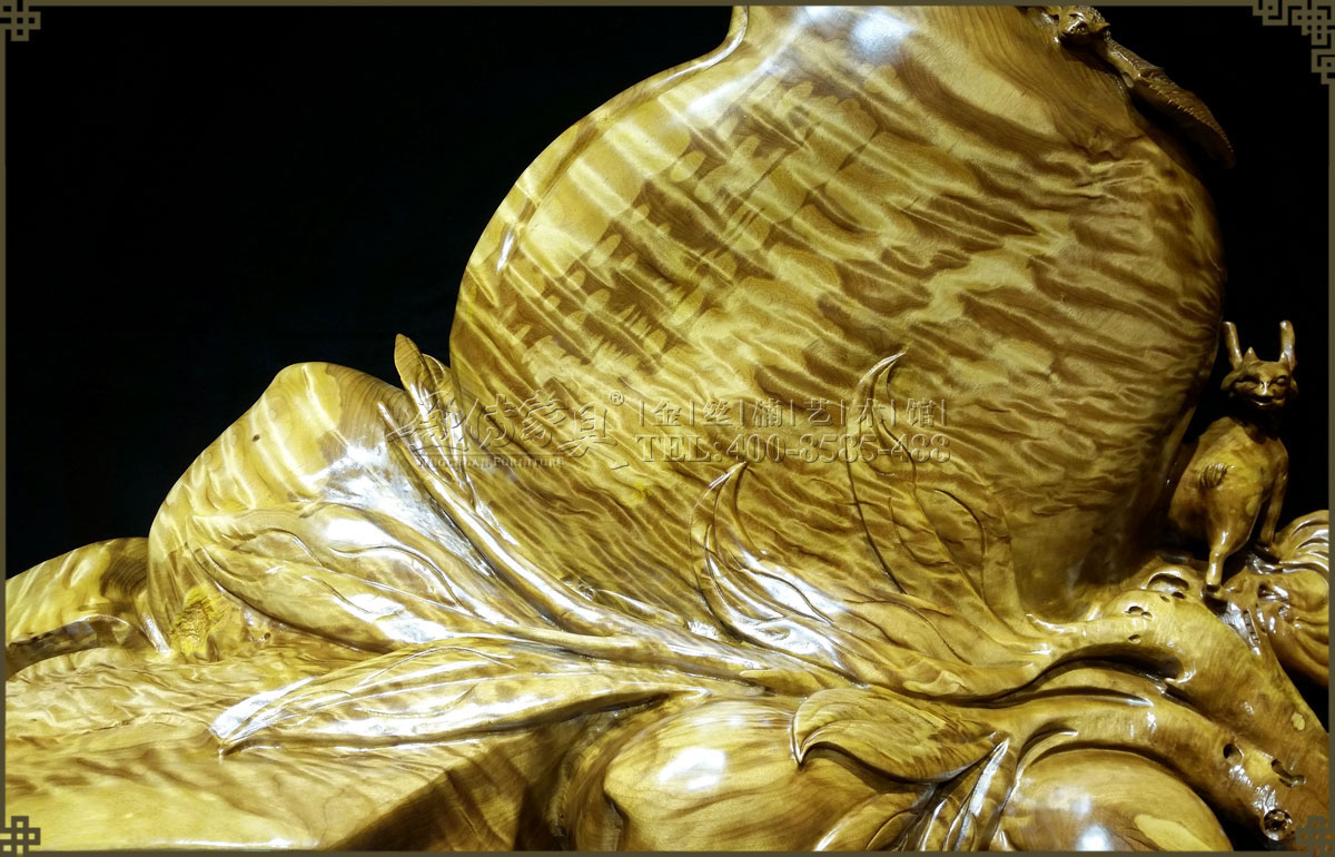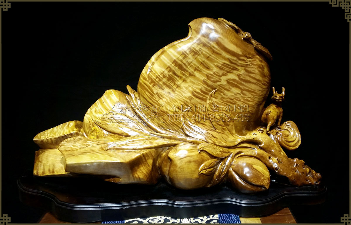 自古以來,壽桃是祝壽文化中必不可少的元素。蝙蝠的“蝠”諧音“福”,鹿諧音“祿”,桃、蝙蝠和鹿的組合寓意“福祿壽皆存”。 而且,此金絲楠壽桃藝術(shù)擺件極為漂亮,枝葉、果實疏密相間、錯落有致,造型厚重結(jié)實,形態(tài)飽滿大氣,表現(xiàn)出旺盛的生命力。層次分明的水波紋有很強的立體感,清晰獨特,不同的光線下有著千變?nèi)f化的光影效果,魅力四射。光滑柔潤的手感,讓人愛不釋手,是送親人、送老前輩、送老領導的最佳禮物.