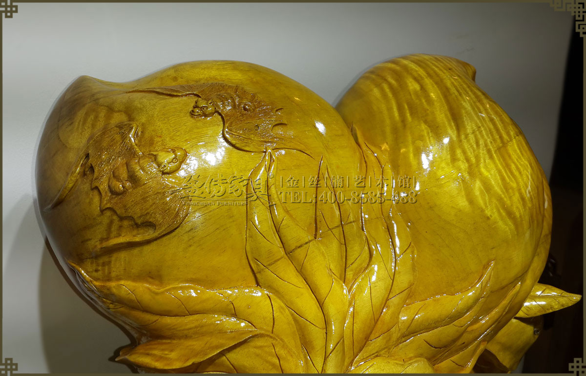 送壽桃是中國傳統習俗之一,象征著晚輩對老前輩的孝敬,每當老年人過生日時,做兒女的都要送壽桃給老人,以祝老人健康、長壽,幸福。此藝術擺件更雕有兩只蝙蝠伏于壽桃之上,寓意“多福多壽”,是送親人、送老前輩、送老領導的最佳禮物。