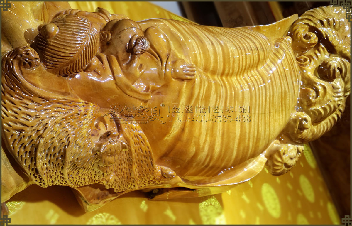人們常用“福如東海,壽比南山”祝愿長輩幸福長壽,此金絲楠擺件傳遞著人們的這個美好心愿。福,小孩兒表示五福臨門;祿,如意造型寓意高官厚祿;壽,壽桃意為長命百歲。