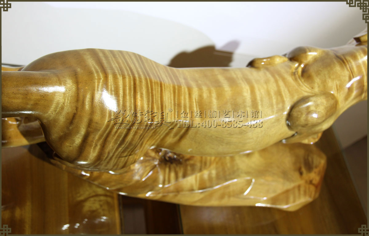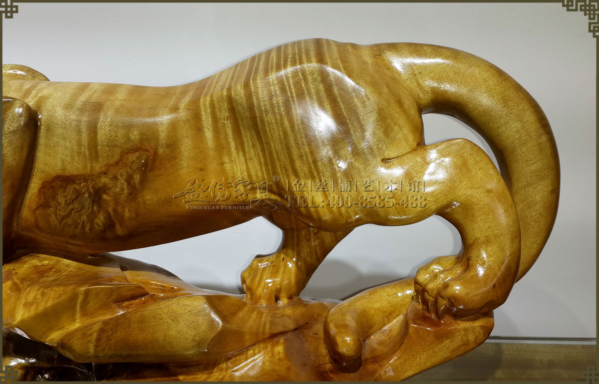 此金絲楠老虎藝術擺件手感極其光滑細膩,天然水波紋路清晰整齊,猶如真的虎皮呈現眼前,獨特又瑰麗,美不勝收。雕刻工藝精湛,百獸之王回首長嘯,姿態無比威猛,虎嘯山河,氣勢無可抵擋,讓人能夠強烈感受到那股自然的野性,無論是自己欣賞、收藏或送禮都是極品之選。