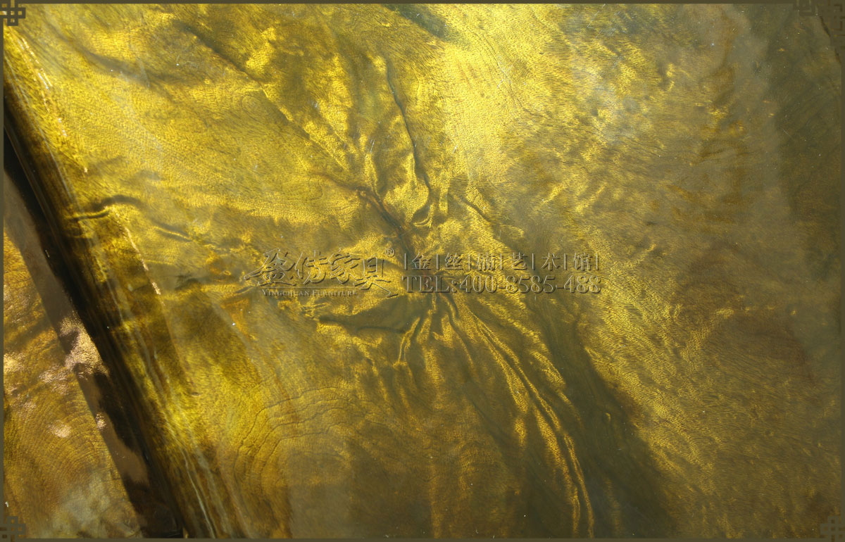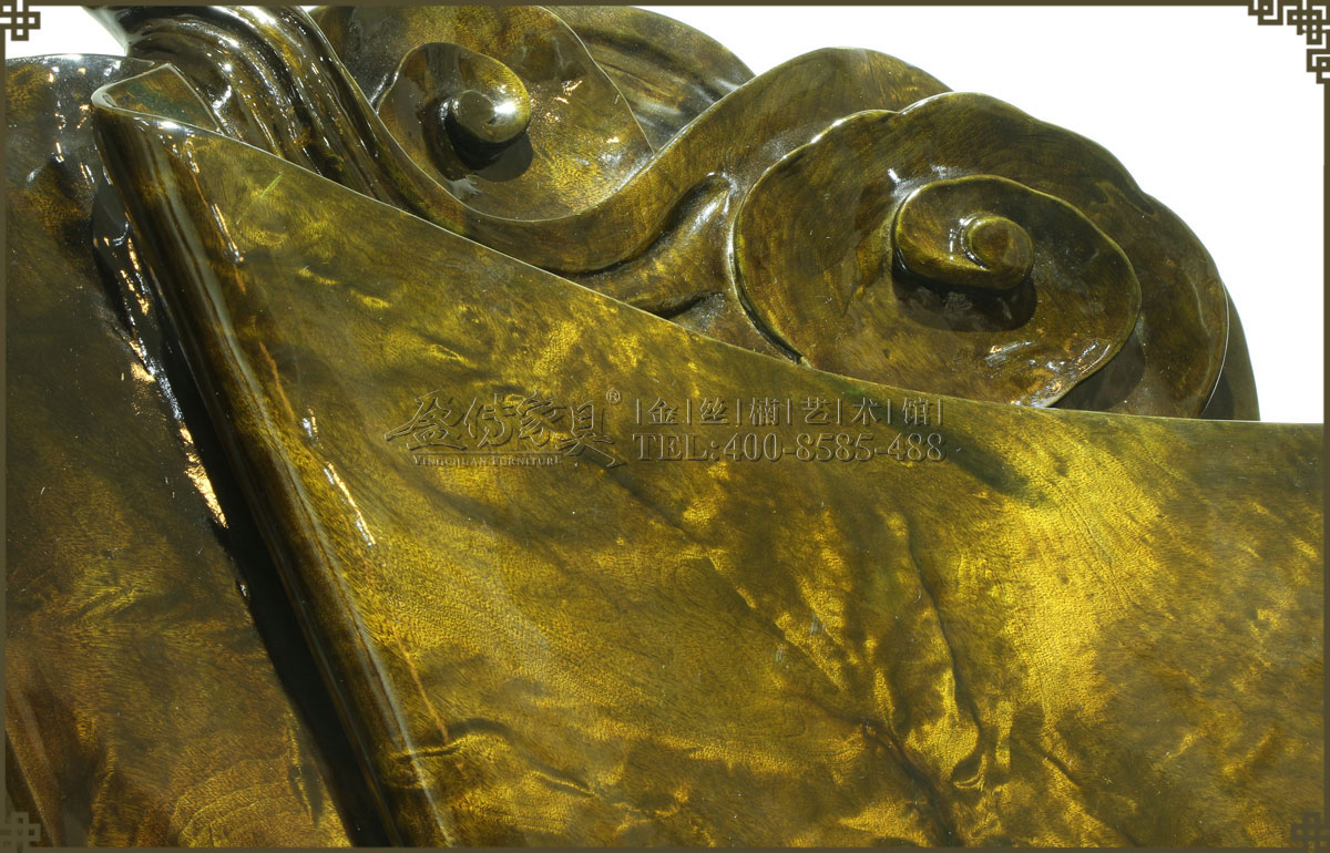 此金絲楠陰沉木手感細膩,光照下質地晶瑩,金絲成色很高,紋路眩美,像霞光、像波瀾……有步移景換的奇幻效果,讓人欲罷不能。
