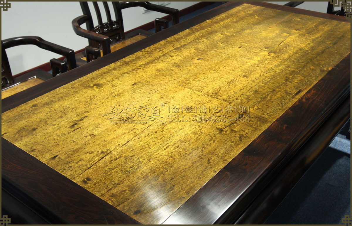 黑檀鑲金絲楠陰沉木水滴紋長方桌7件套,大亮點是餐桌和椅子的面板均是金絲楠陰沉木(烏木)獨板大料,這樣大的陰沉面板已經稀有,而面板上居然還是滿水滴紋,奇特美麗,實在罕見,可謂千金難求的極品、上品。