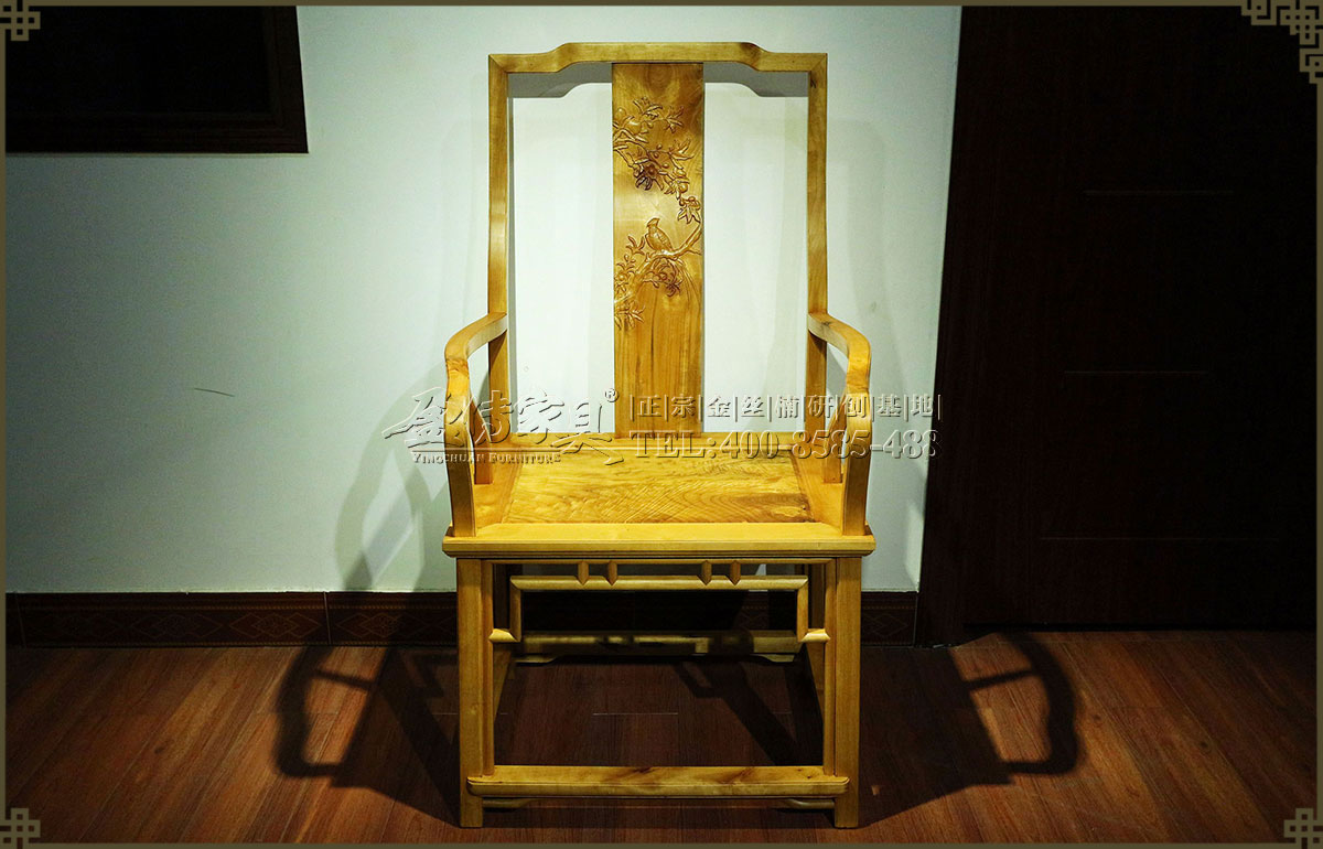 桌面中央嵌圓形金絲楠木面心,桌面側沿下起陽線,有束腰,腰下周身浮雕卷草紋,簡約大方;圓臺底座外圍簡易,底面圖案與裙邊圖案相映成趣,在視覺上避免了“頭重腳輕”,足見穩重而美觀;配以金絲楠餐椅,背板輔以的雕花,兩者擺放在一起,相得益彰,融為一體。