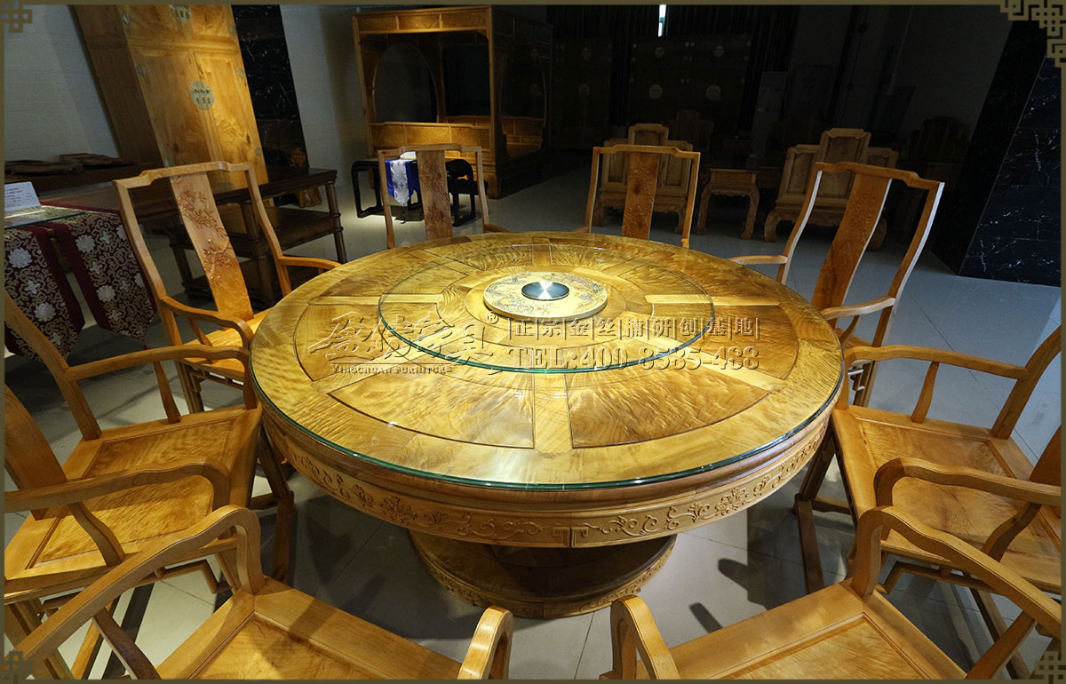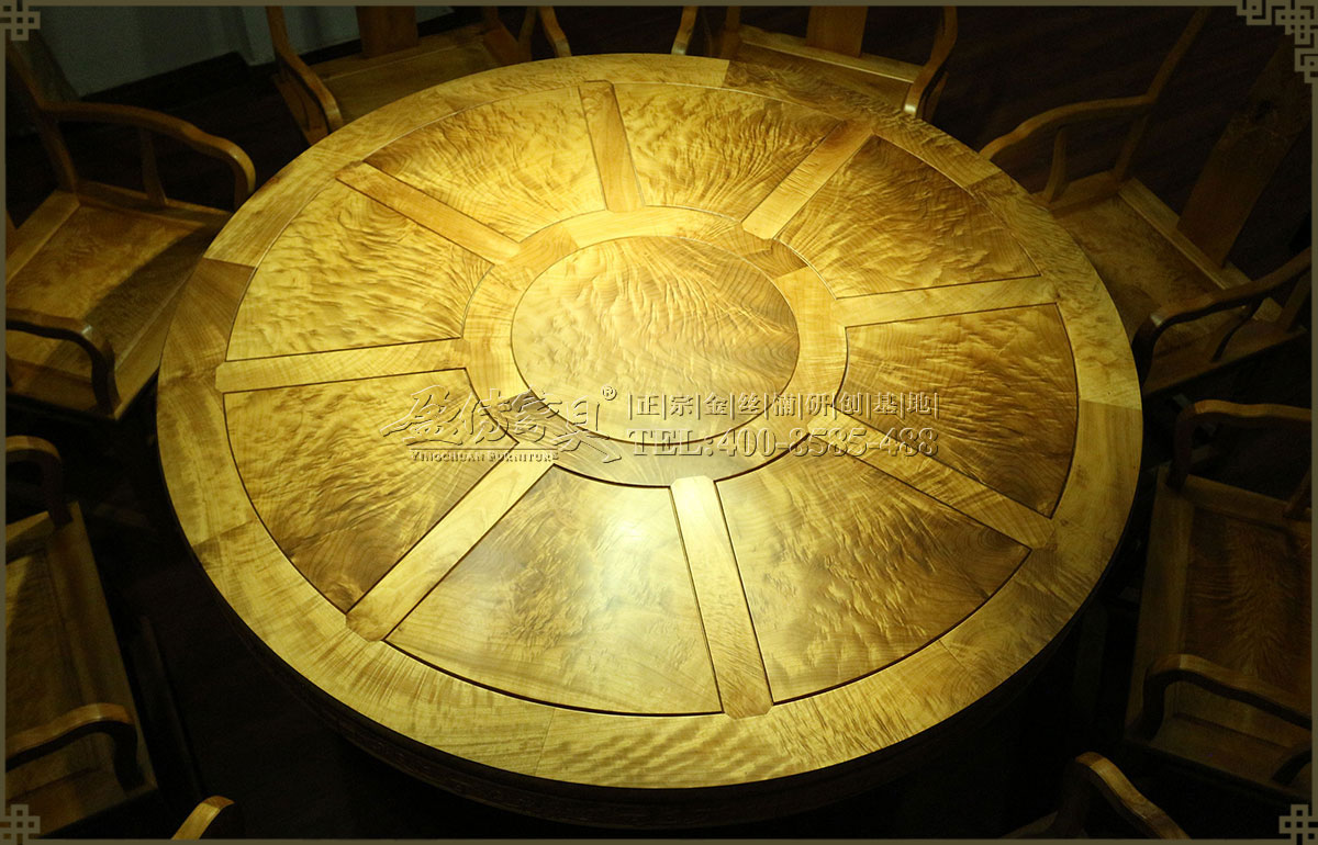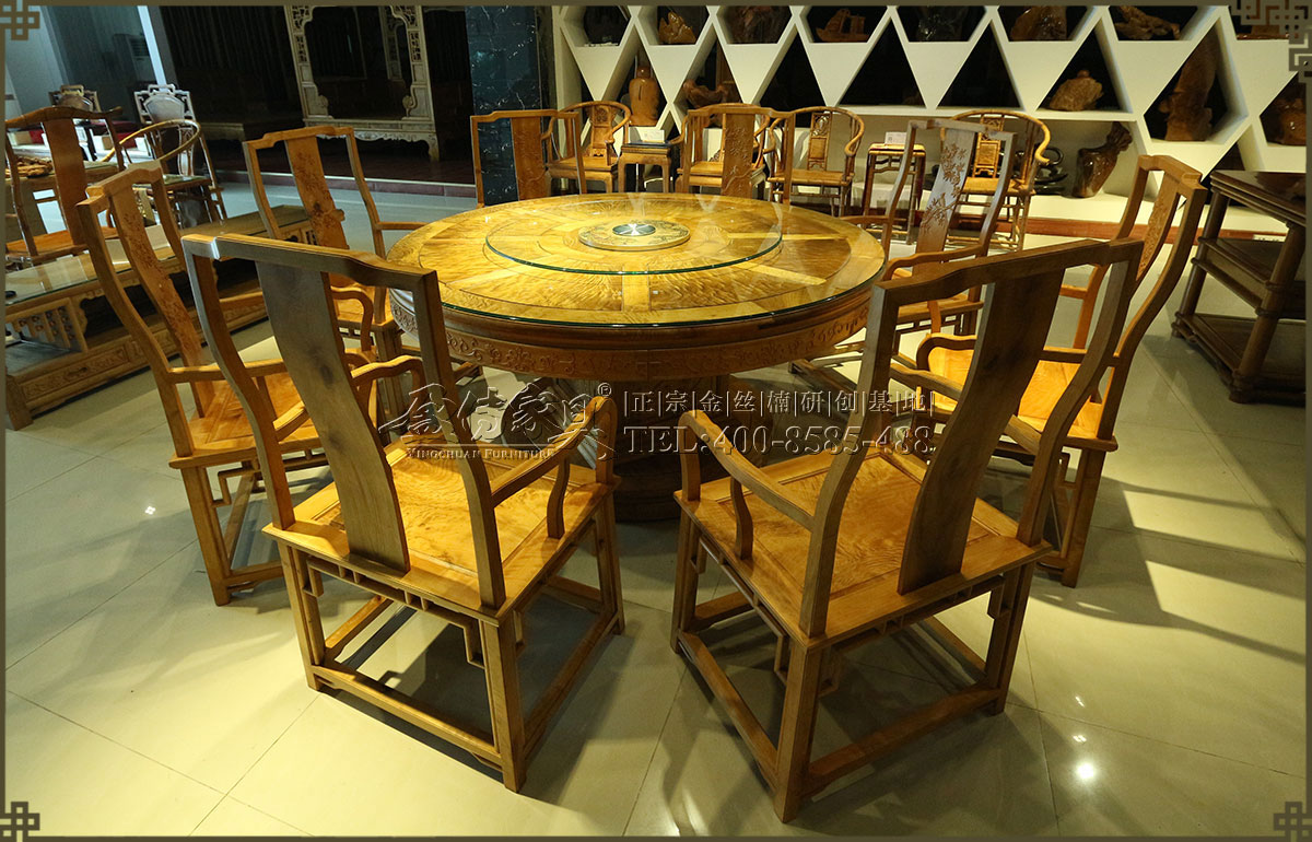 此金絲楠木大圓餐桌桌面紋理絢麗、波光粼粼,牙條寬厚、面板統一,其整體外形展示出莊重、大氣、富貴、祥和的大家風范。