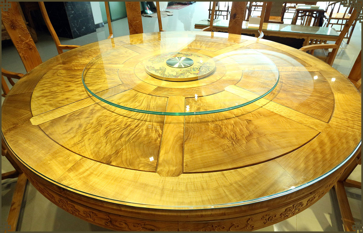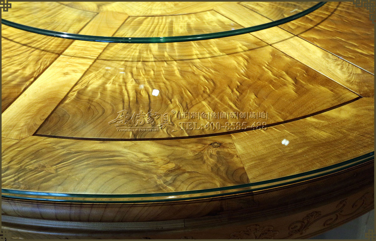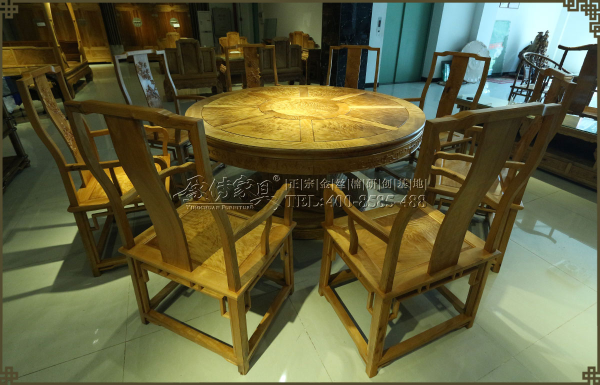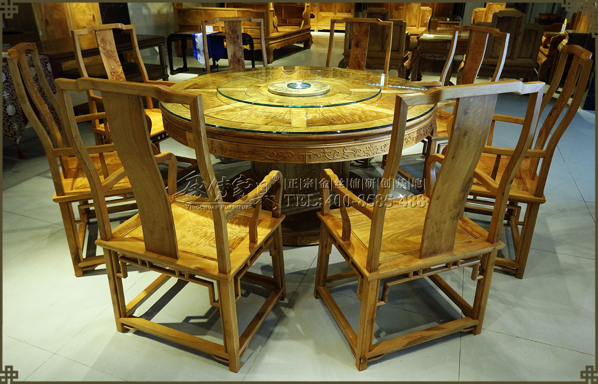 此金絲楠木大圓餐桌桌面紋理絢麗、波光粼粼,牙條寬厚、面板統一,其整體外形展示出莊重、大氣、富貴、祥和的大家風范。