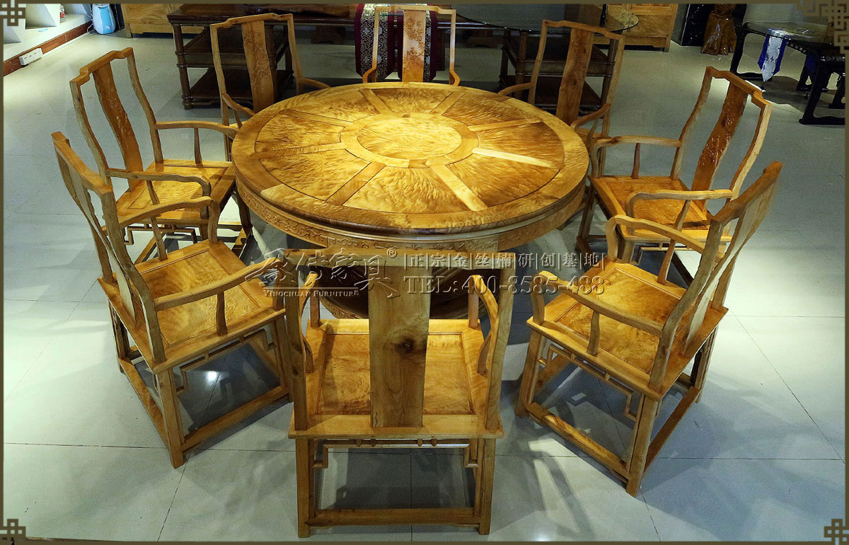 圓餐桌古時候就深受高階層人士的喜歡,這套家具是九件一起,圓形的餐桌和餐椅的組合。都是精品金絲楠材料制成。圖片上就能很明顯的看出這套金絲楠木家具做工非常精細,不管是外形還是上面的雕刻都圓潤細致,形體非常美麗。
