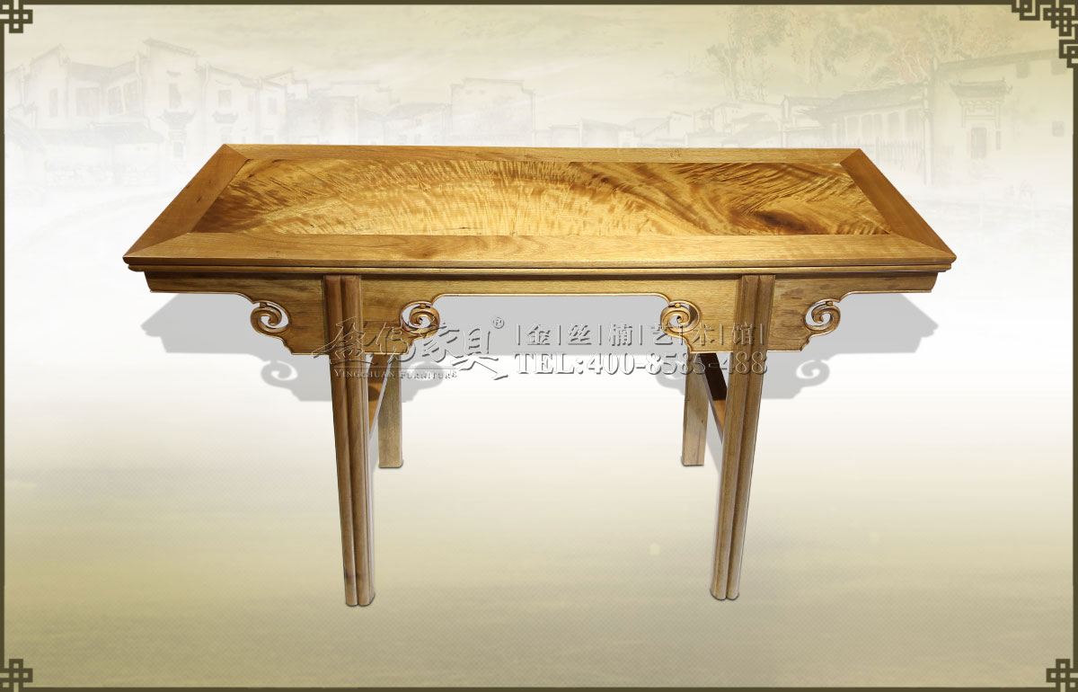 此條案面板是獨(dú)板,非拼接,帶有清晰的金絲楠獨(dú)有的虎皮紋和水波紋,珍稀罕有,金絲閃爍,精美異常,富麗堂皇,絢麗華貴。美輪美奐的木紋看起來既像王中之王的老虎,又像層巒疊嶂的...