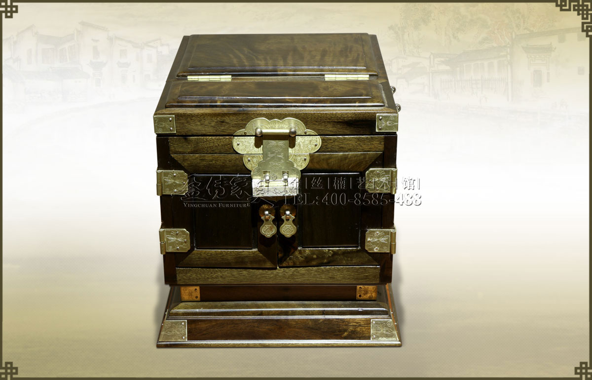此金絲楠首飾盒與其說它是一個首飾盒,不如說它是一件藝術品。金絲楠面板上有著密集清晰的水波紋,華麗高貴,眩美靈動,褶褶生輝,美不勝收。小葉紫檀低調穩重、淳厚含蓄,既能更突...