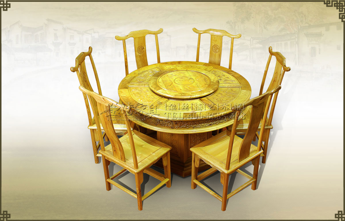 一大圓餐臺,配八張椅子。此圓餐臺乃豪華餐廳的高雅之物,極具中國古典特色,線條優(yōu)美,做工精細,整個臺面、束腰都精雕細刻了美麗的吉祥花紋,高貴、氣派、細膩,雍容絢麗,魅力四...