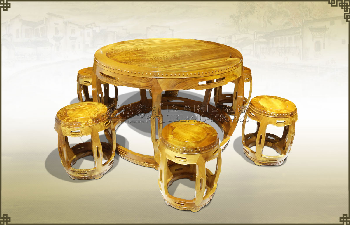 圓桌的面板由兩大塊金絲楠根料獨板制作而成,最長處分別為53cm和48cm,如此大的根料獨板極其少見。上面布滿天然水波紋,眩美獨特,猶如一幅藝術(shù)畫,震撼人心。5張鼓凳也是使用金...
