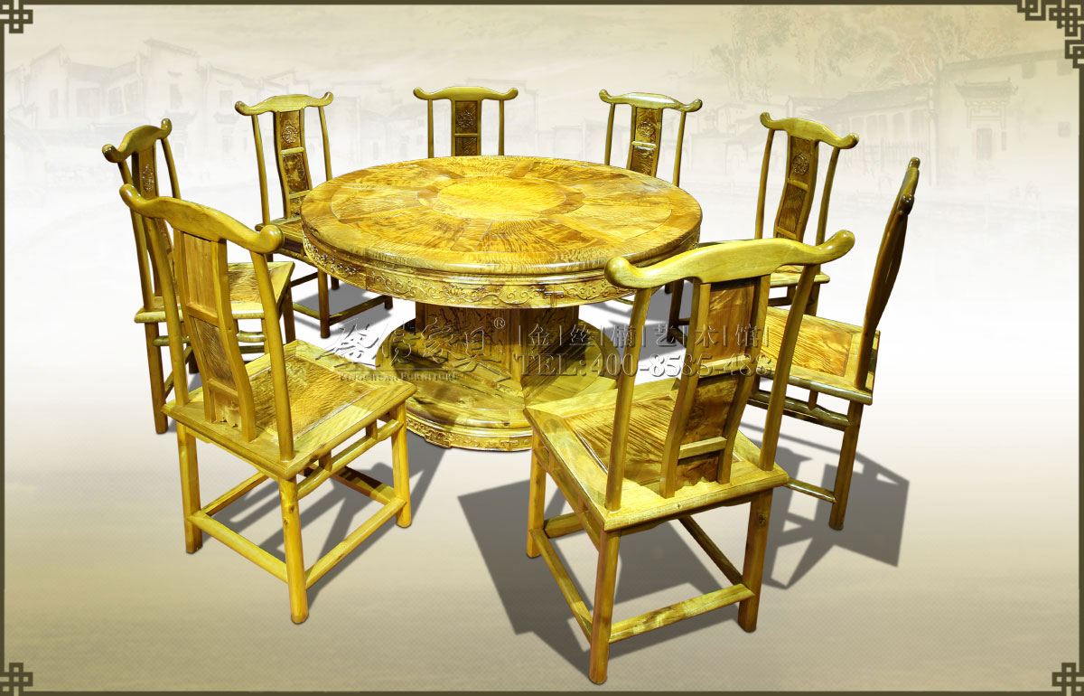 氣派、豪華的滿波紋路金絲楠大圓餐臺9件套。整個桌面和所有的椅面都布滿密集、立體、清晰的水波紋,熠熠生輝,金碧輝煌,讓你用餐前先享受視覺盛宴,美得驚人,具有極高的收藏價值...