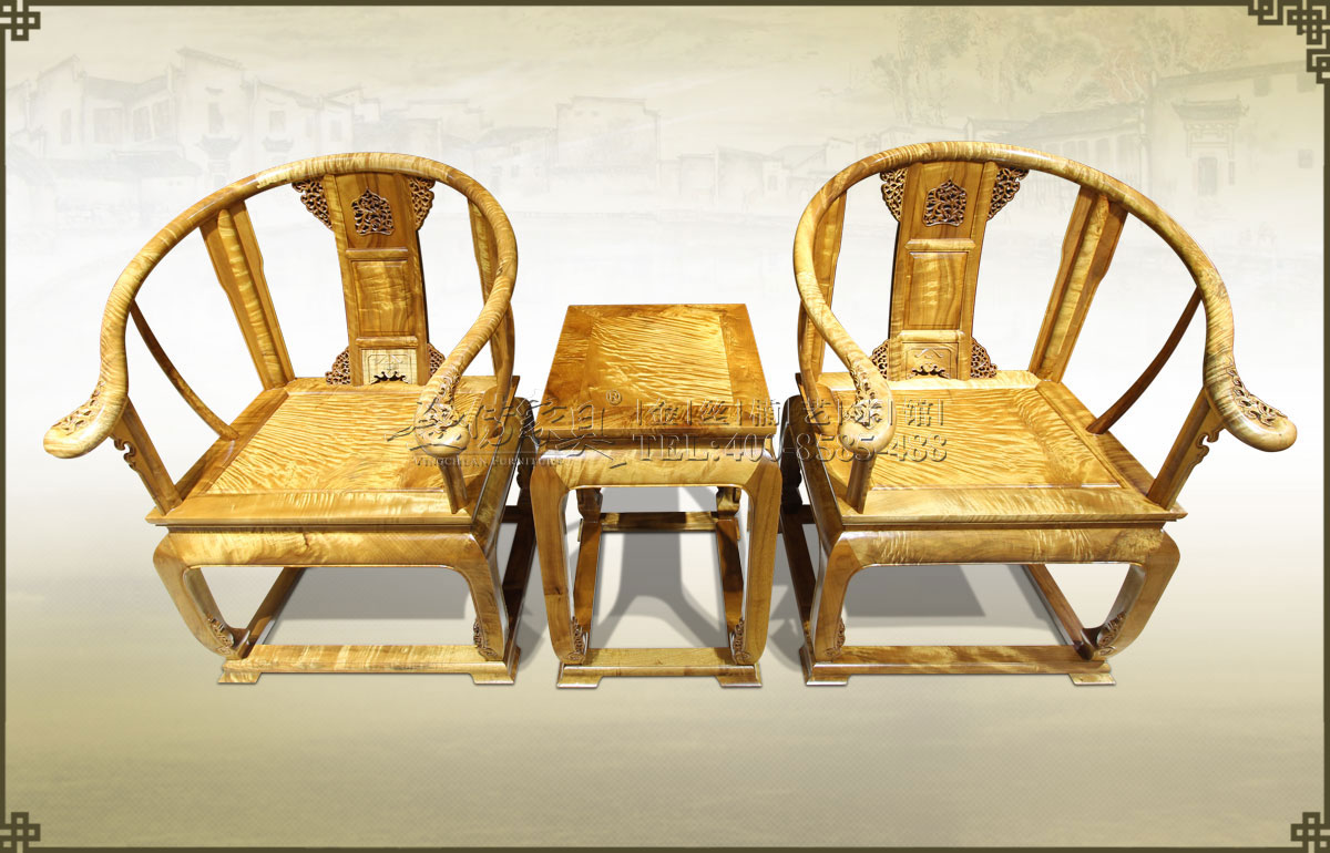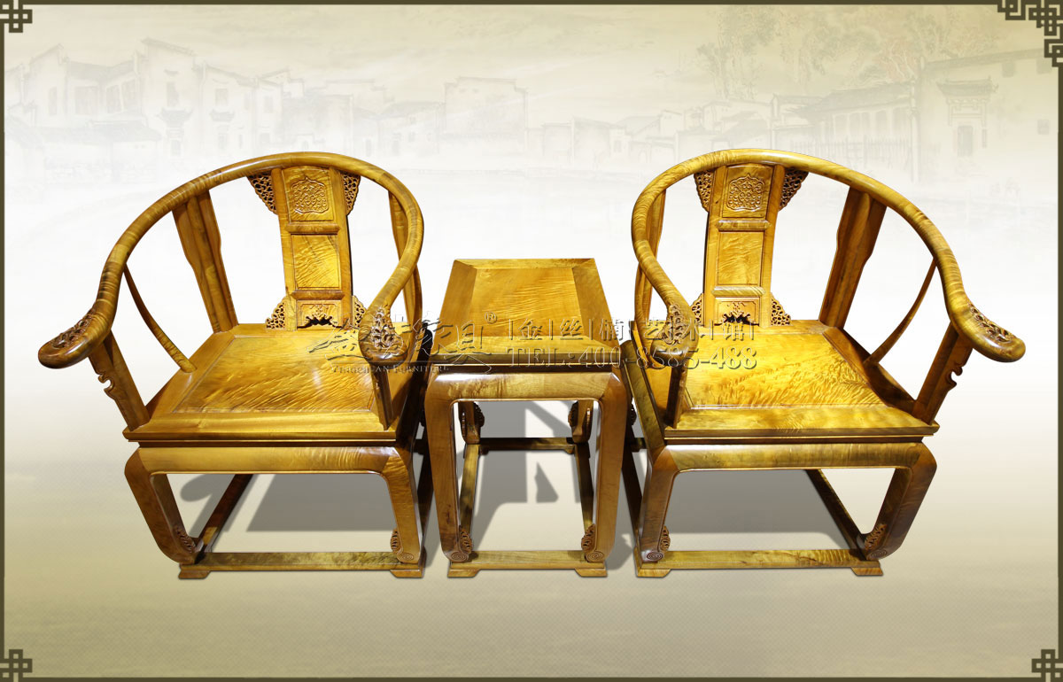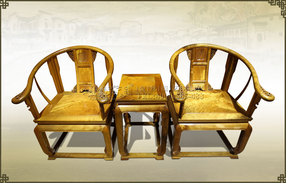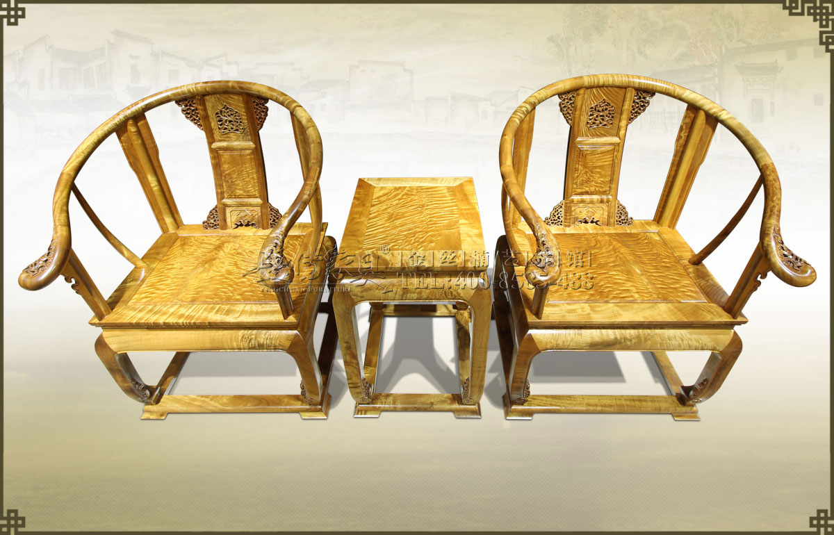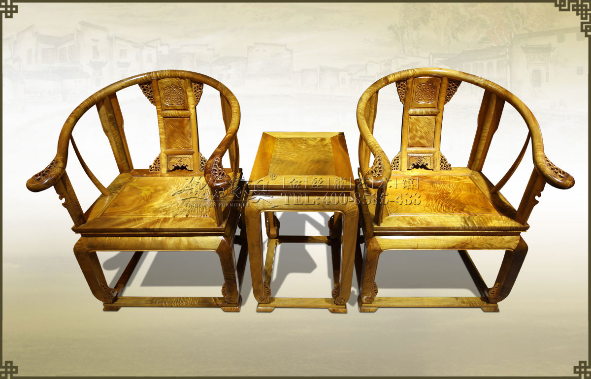 介紹:此皇宮椅三件套精選上好的金絲楠制作而成,金絲飽滿,紋理瑰麗眩美,猶如行云流水一般,既奪人眼球,又令人舒心。椅圈連著扶手,內抱外挑,坐體寬圓,開口曲鉤,雕花精致漂...