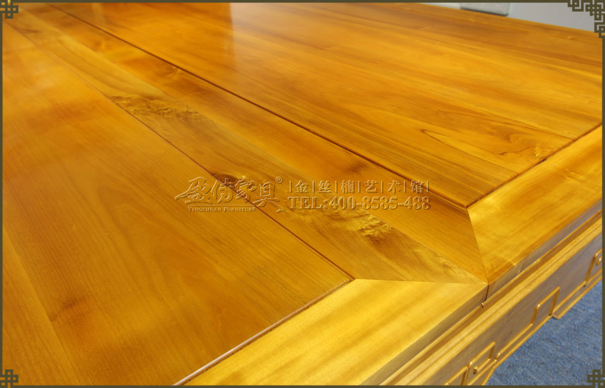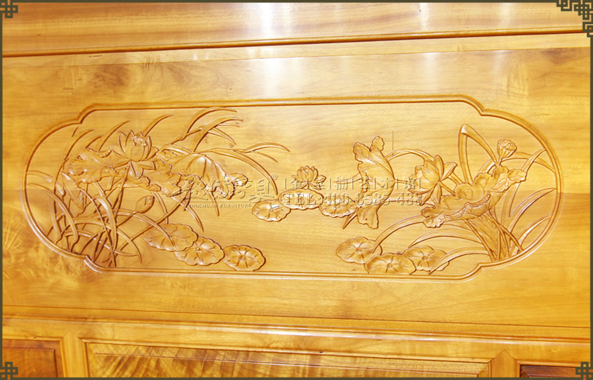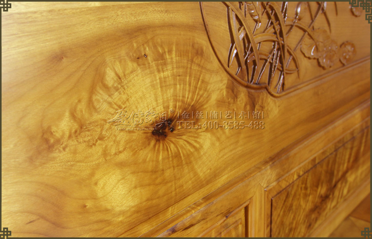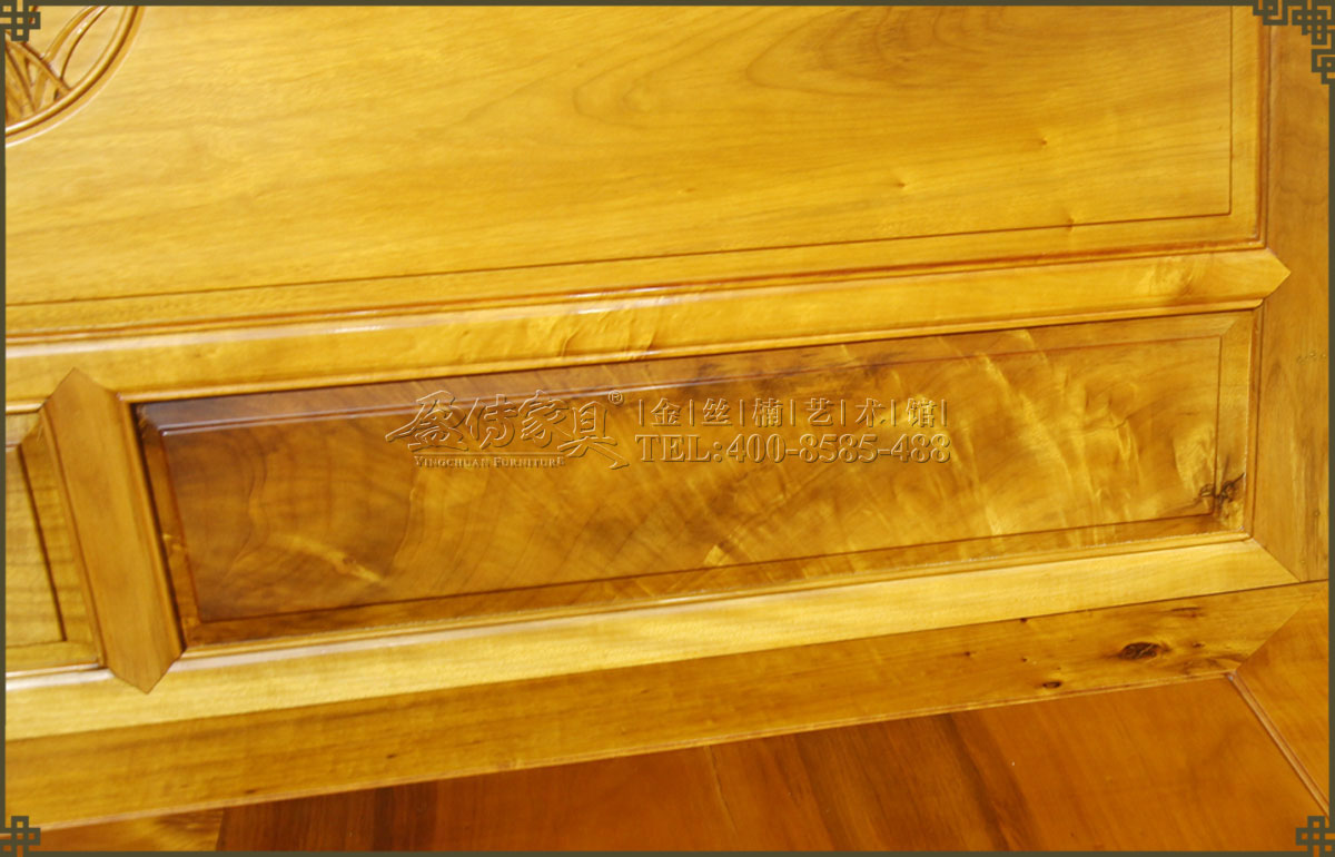 床頭正面板心雕飾荷花圖案,寓意百年好合,床配有兩個床頭柜,拉手處雕飾蝙蝠圖案,象征福壽雙全,床面整潔平整,表面在燈光的照射下金光閃閃,金絲浮現,有一種至尊至貴的高雅氣息,床體下帶束腰,洼堂肚牙板與腿相連,直腿內翻馬蹄,做工十分講究。