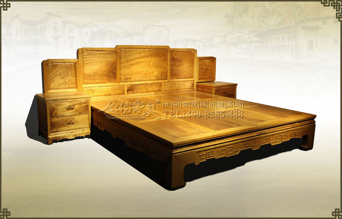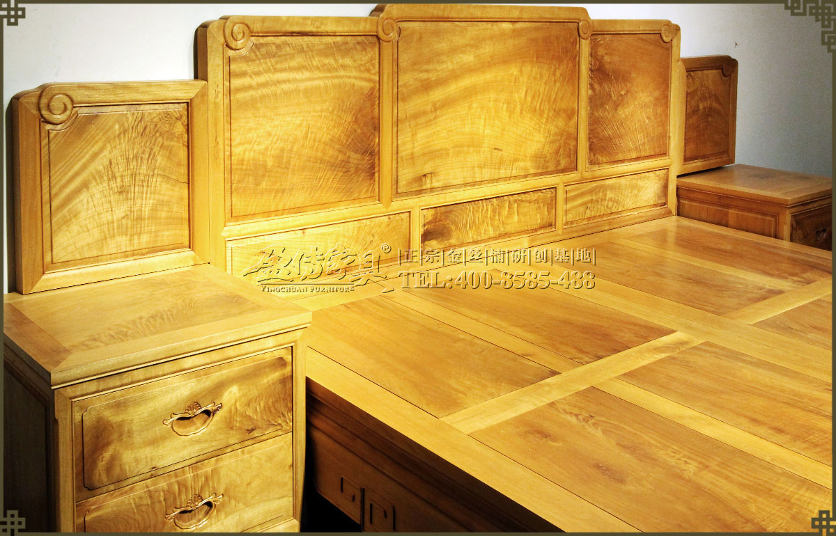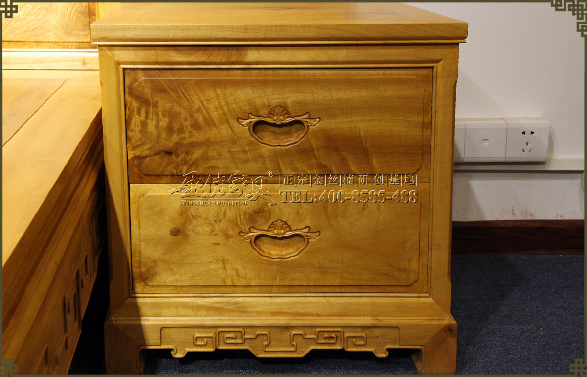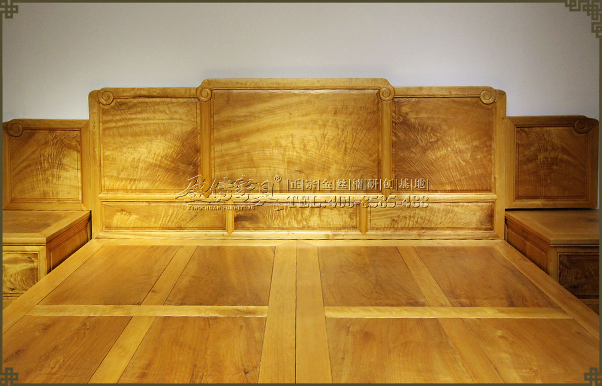 兩個床頭柜,拉手處雕飾蝙蝠圖案,象征福壽雙全,床面整潔平整,表面在燈光的照射下金光閃閃,金絲浮現,有一種至尊至貴的高雅氣息,床體下帶束腰,洼堂肚牙板與腿相連,直腿內翻馬蹄,做工十分講究。