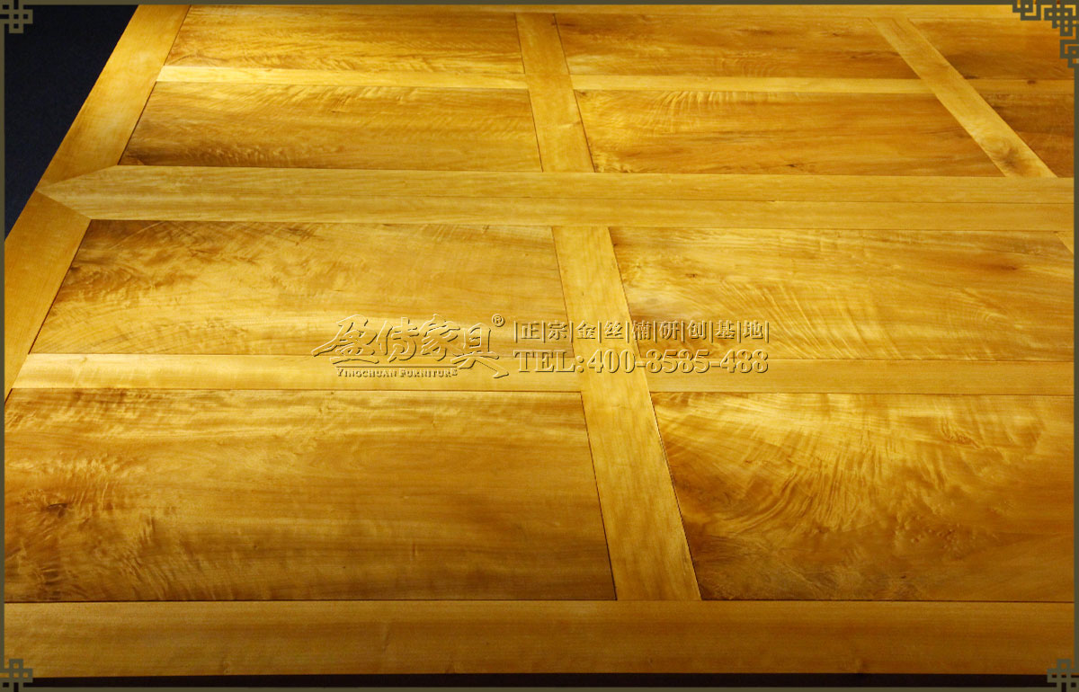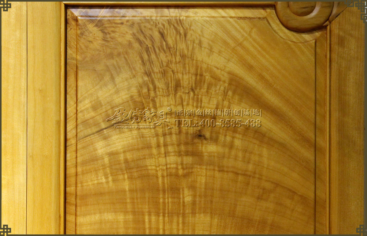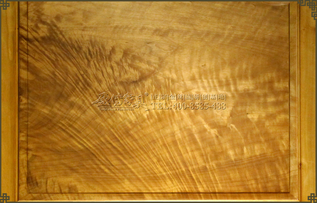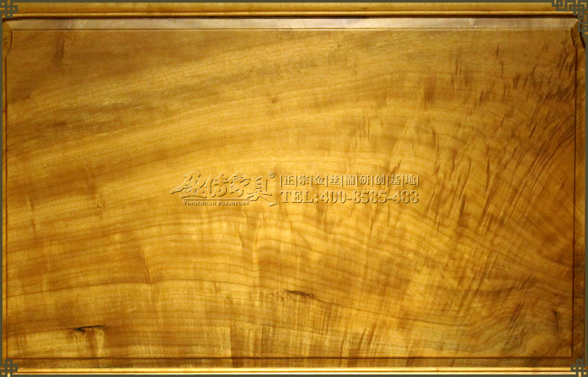 兩個床頭柜,拉手處雕飾蝙蝠圖案,象征福壽雙全,床面整潔平整,表面在燈光的照射下金光閃閃,金絲浮現,有一種至尊至貴的高雅氣息,床體下帶束腰,洼堂肚牙板與腿相連,直腿內翻馬蹄,做工十分講究。