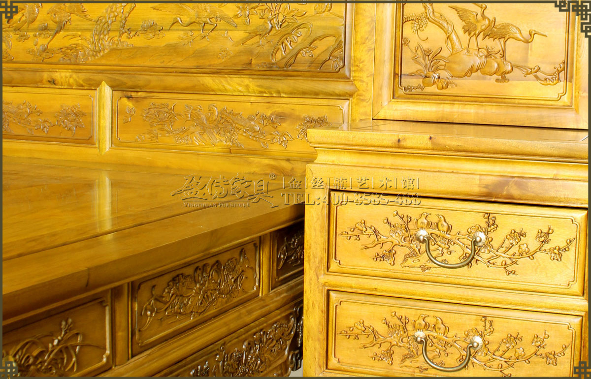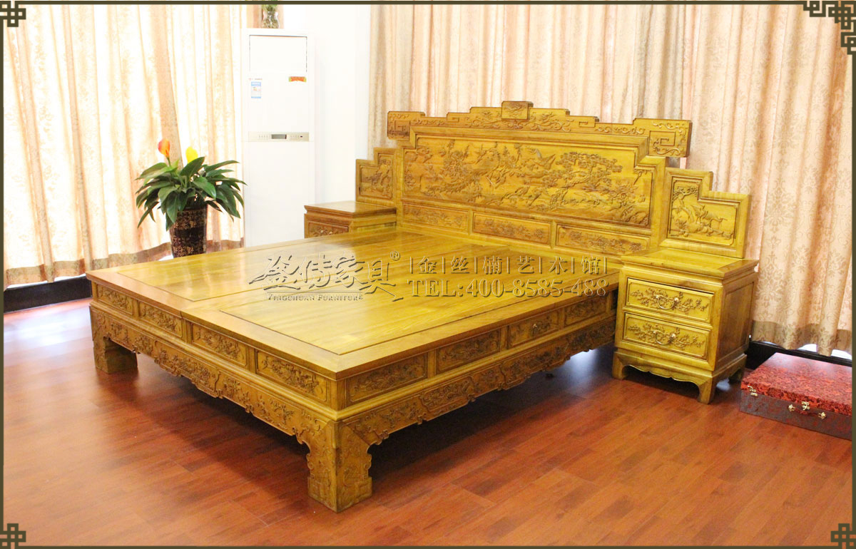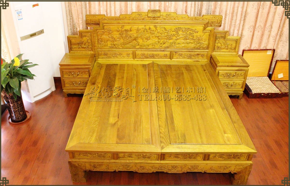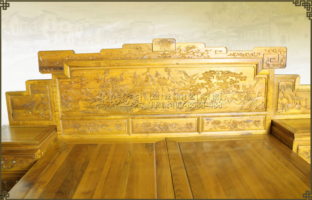雕刻工藝精湛,大小床頭均有精雕細刻的花鳥圖案,生動活潑,美不勝收。當中的鳳凰是古代傳說中的百鳥之王,和龍一樣為漢族的民族圖騰,象征權力、高貴、幸福。松鶴雕花寓意天長地久,長壽,高潔。