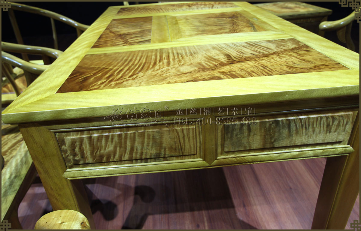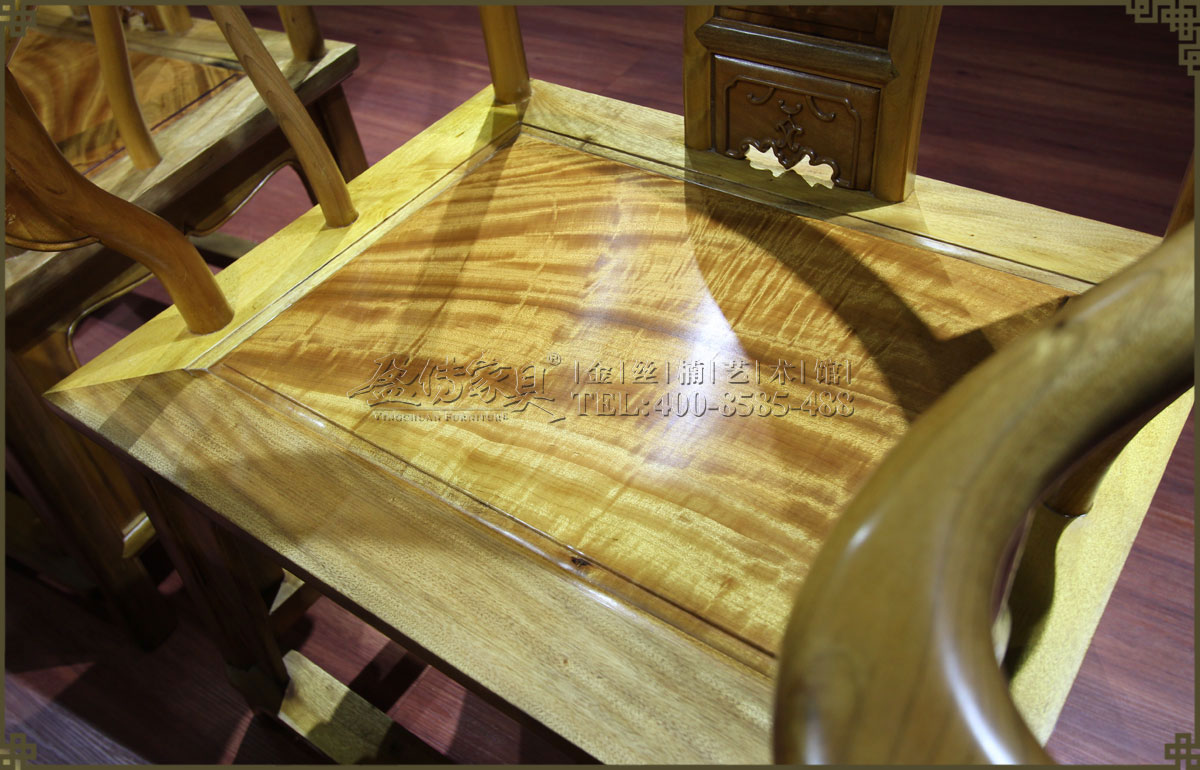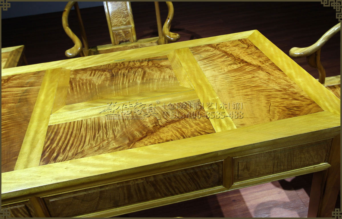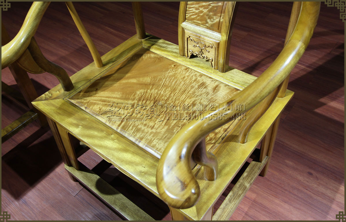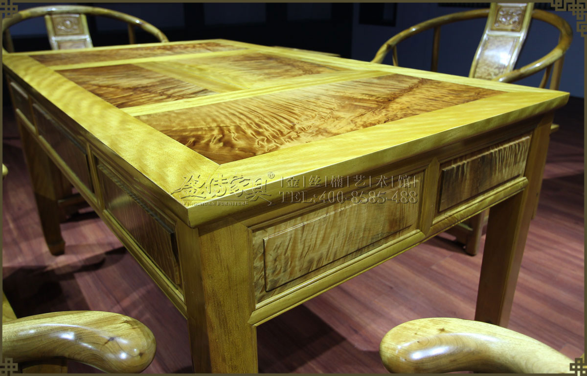 枯木老料金絲楠,紋路更老更顯,具有更高的收藏價值和欣賞價值。整個桌面和椅面都滿是水波紋,非常清晰和有立體感,富麗堂皇,金光閃閃,移步換景,每換一個角度看都是不同的感受,像水波、像霞光、像山巒,像綢緞……美得驚人。