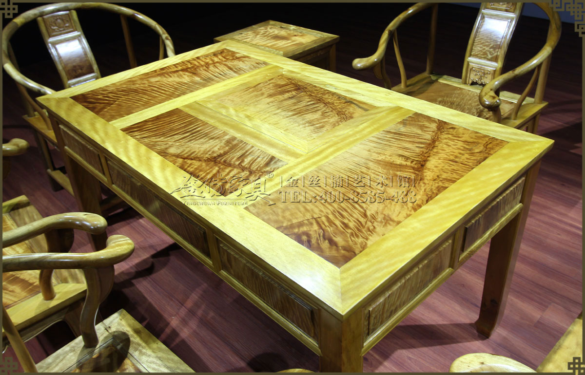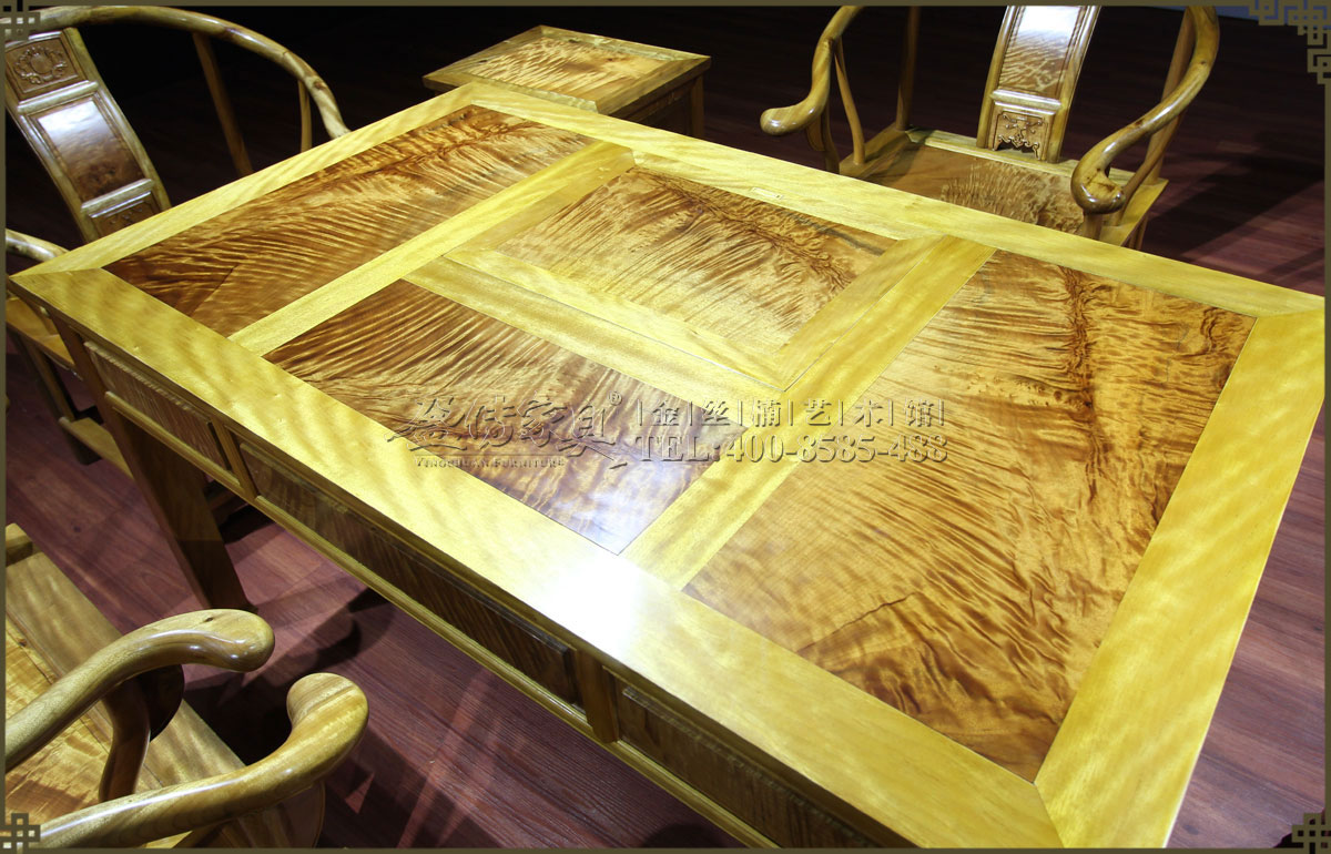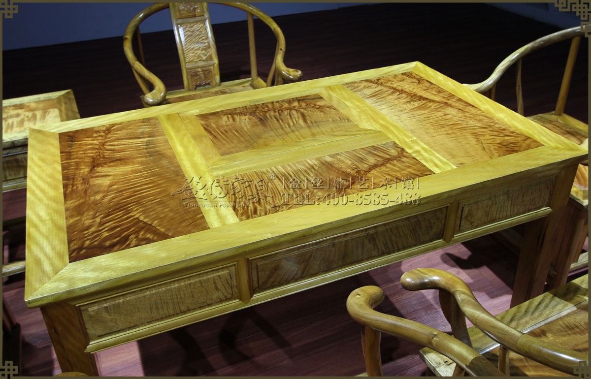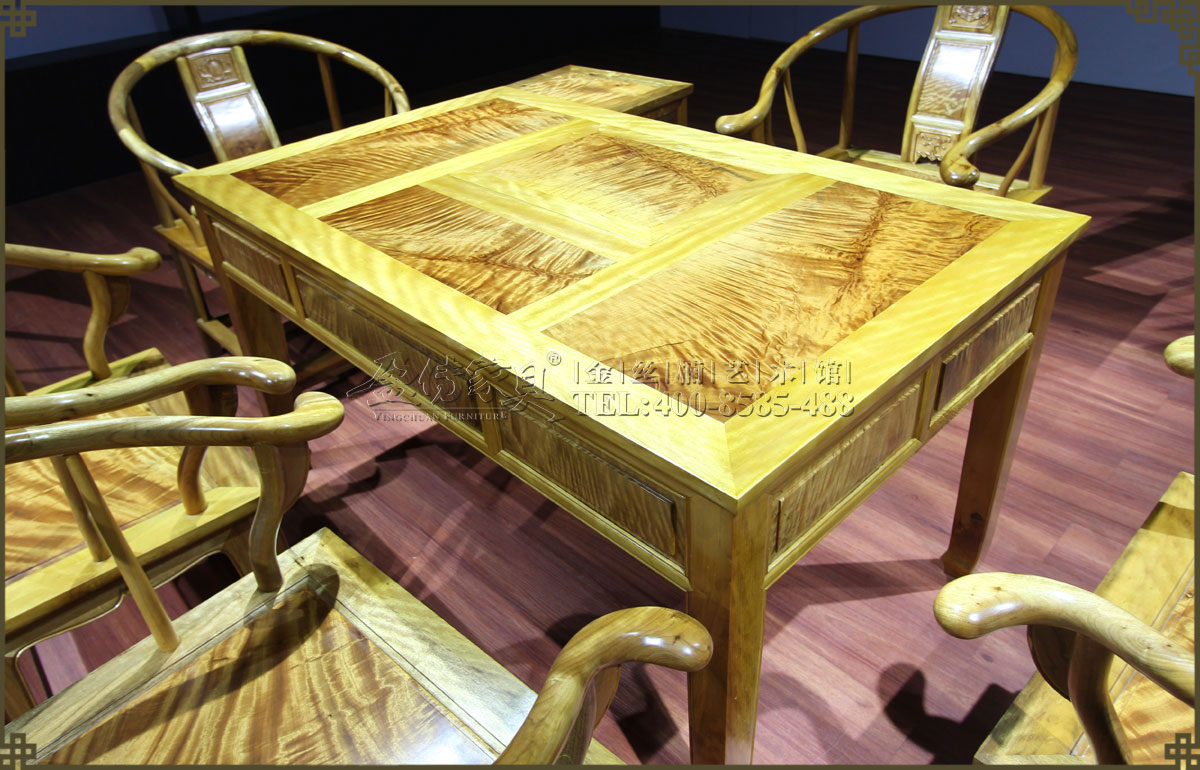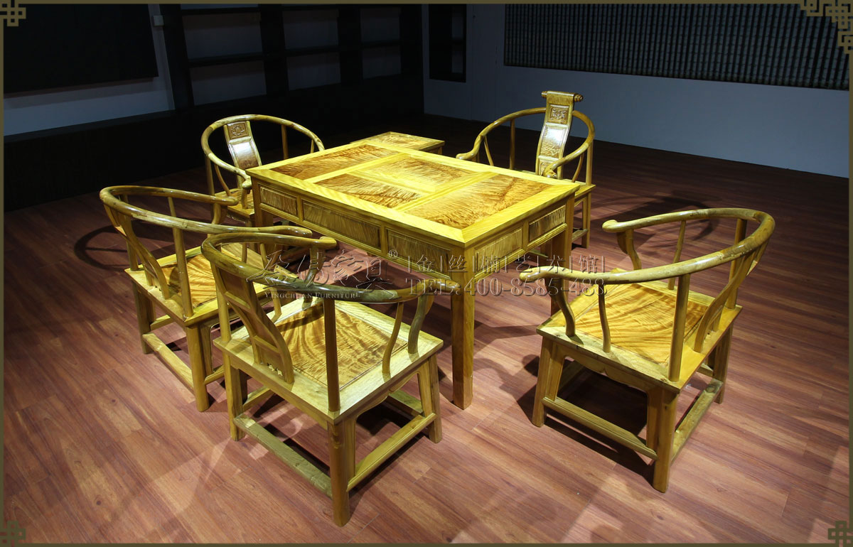 枯木老料金絲楠,紋路更老更顯,具有更高的收藏價值和欣賞價值。整個桌面和椅面都滿是水波紋,非常清晰和有立體感,富麗堂皇,金光閃閃,移步換景,每換一個角度看都是不同的感受,像水波、像霞光、像山巒,像綢緞……美得驚人。