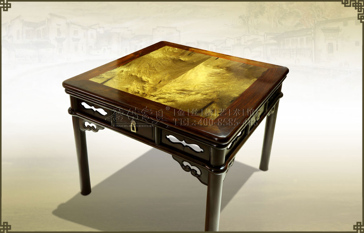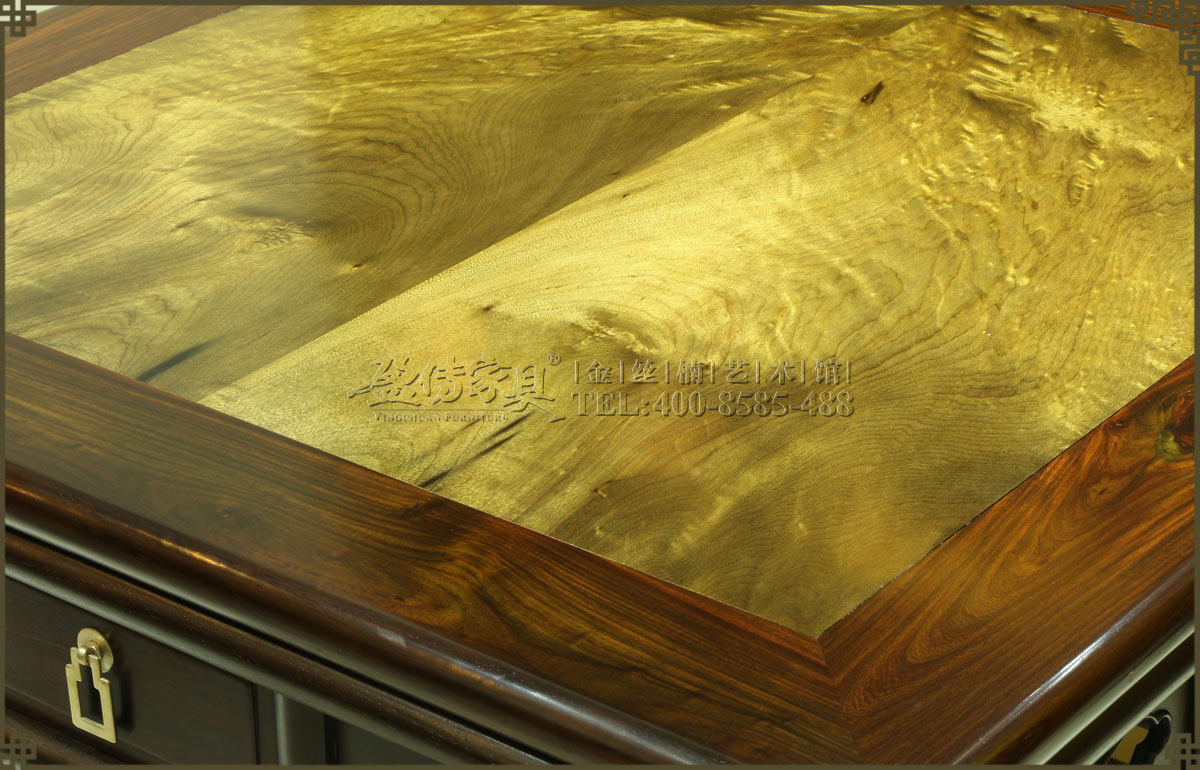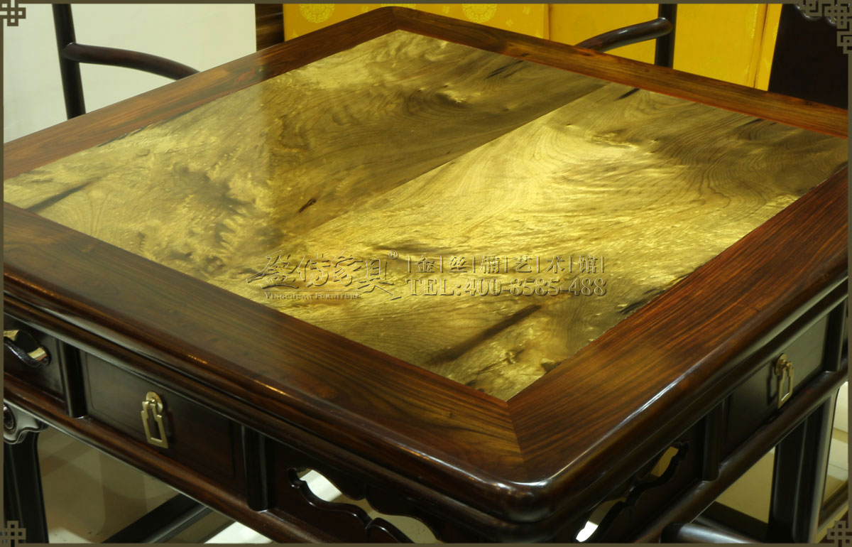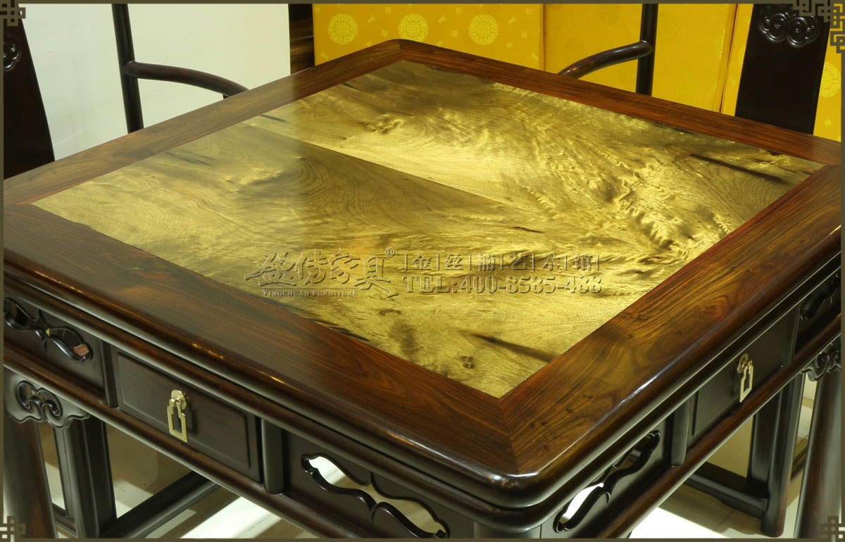 陰沉木因經過炭化,一般只做小件工藝品,少有大件家具流傳。此金絲楠茶幾5件套采用現代新技術,使其面板、椅子面板均可使用整塊金絲楠陰沉木大料。茶幾面板的天然花紋形成孔雀羽毛圖案,眩美獨特,讓人稱奇。椅子面板帶有清晰生動、極其少見的水滴紋,可謂是極品。