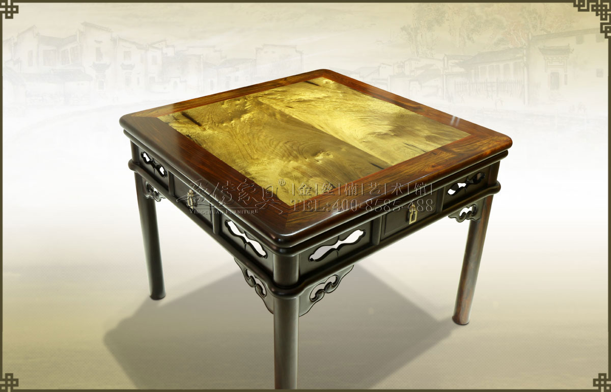 另,此套茶幾使用黑酸枝做框架,金絲楠板心,相得益彰,黑黃成趣,是金絲楠家具中的創新精品。根據陰沉金絲楠穩定性好、手感好、防腐好、視覺悅目而耐磨性相對較弱的特點,把金絲楠和堅固耐用、歷經百年而不變形的黑酸枝搭配使用,這種做法講究揚長避短,很有智慧。