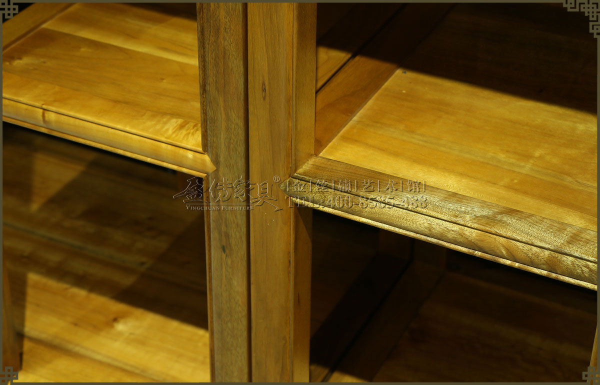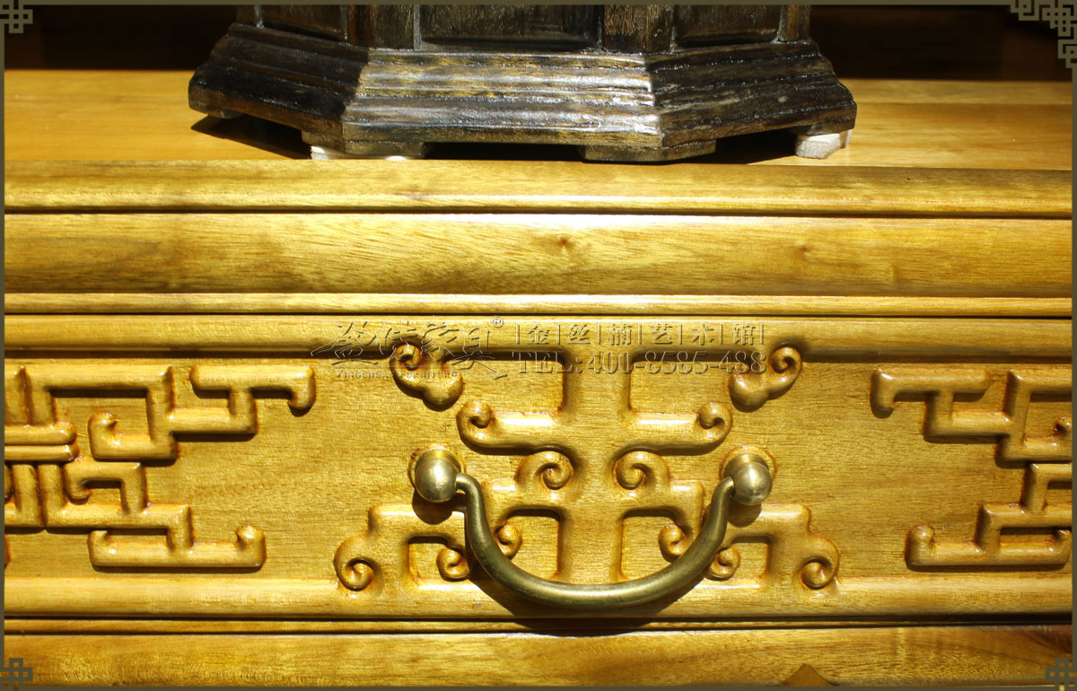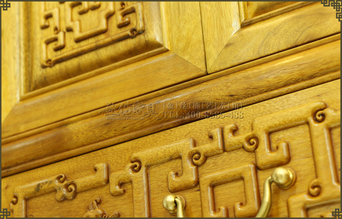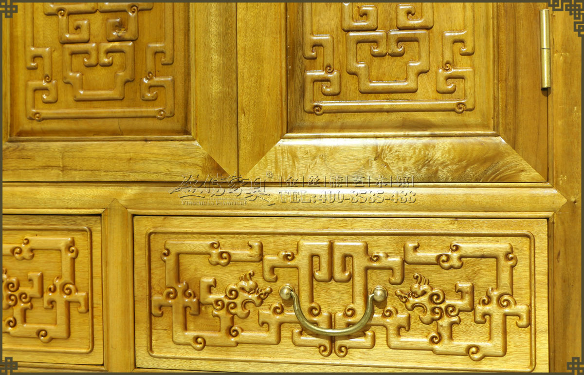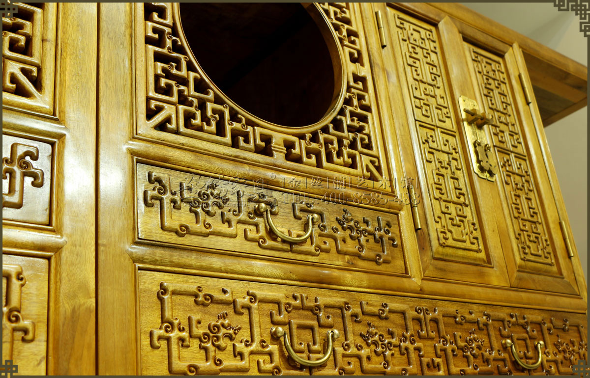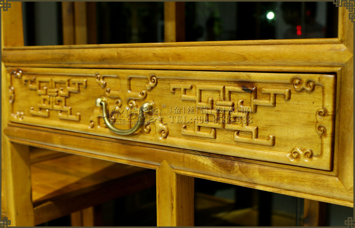 紋飾考究,能工巧匠在博古架的上下左右柜門都浮雕了精致、經典的逥紋,耐人欣賞,百看不厭。在此博古架展示珍寶,擺放大堂中,可以使滿堂生輝。