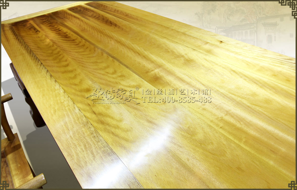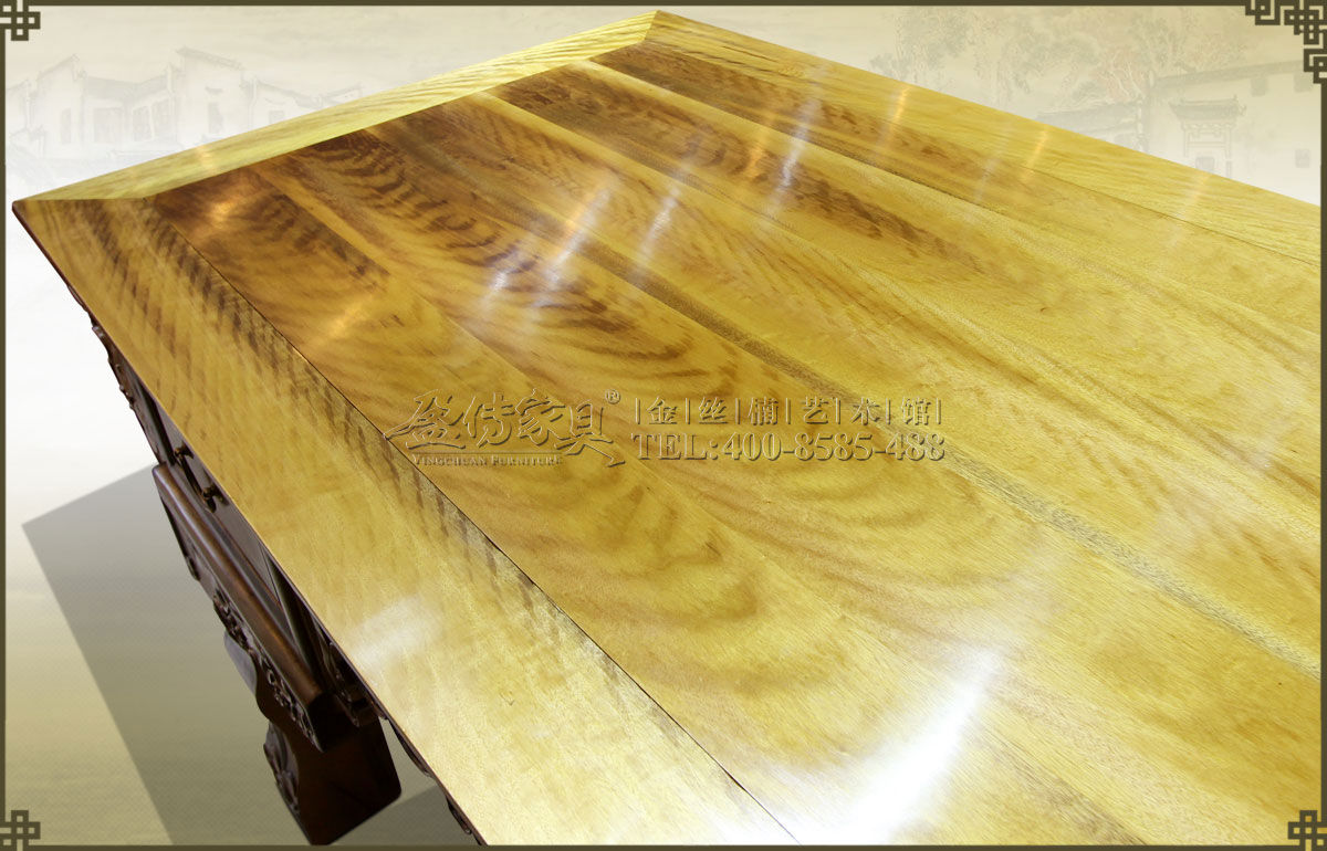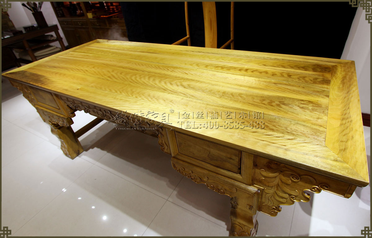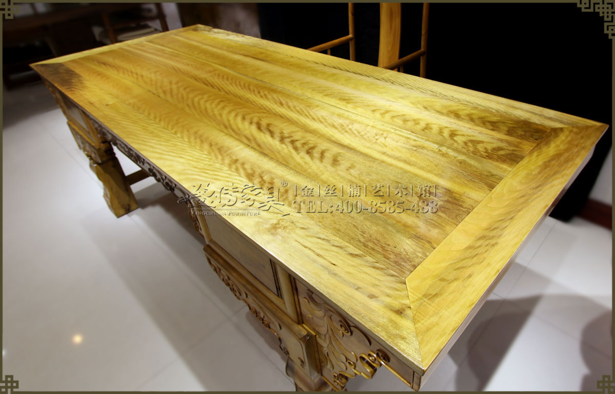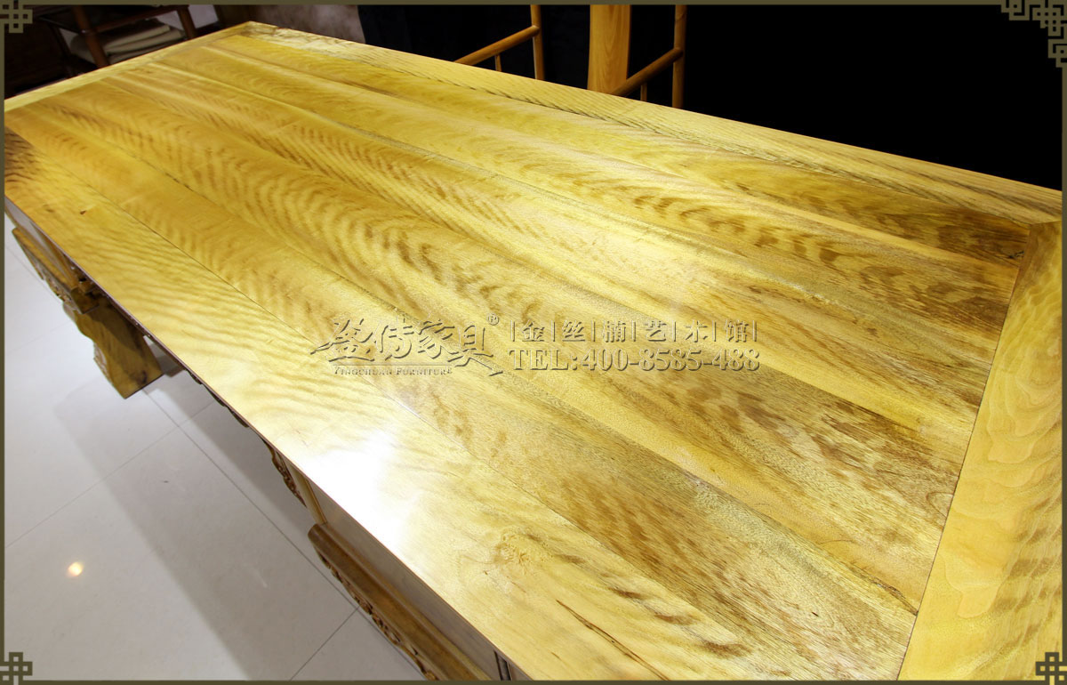 介紹:此金絲楠畫案面板有著稀有的、受人追捧的虎皮紋,獨特而霸氣。壓板和臺腳浮雕精美的花紋,精致大方,匠心獨運。通體呈現出一種簡約與富麗堂皇交輝相映的風格,尊貴高雅,大氣大派,雅致華麗不單調,堪稱經典之作。