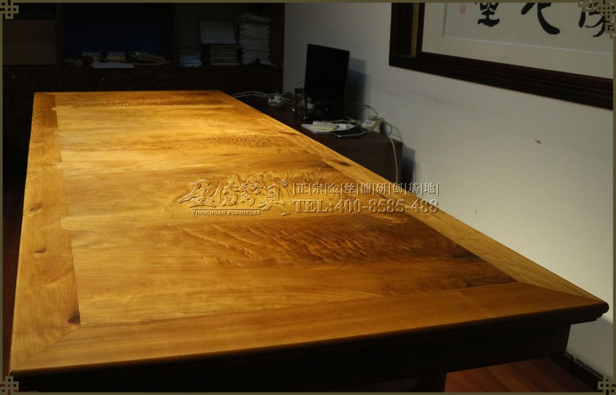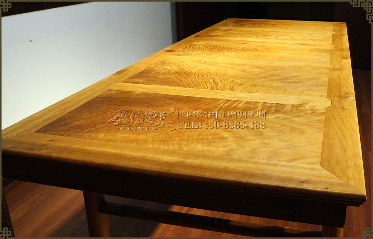 使用金絲楠優質木料,精制明式畫案,造型簡約大氣,凝重沉穩,紋理清晰漂亮,金絲閃耀。雖無雕刻裝飾,但倍感書香畫意、高雅大氣。面板魁麗,線條流暢,打磨精細,而且足夠大,方便書畫,乃文人墨客的喜愛之物,值得收藏和擁有。