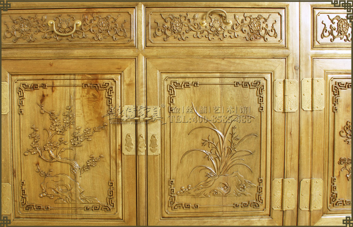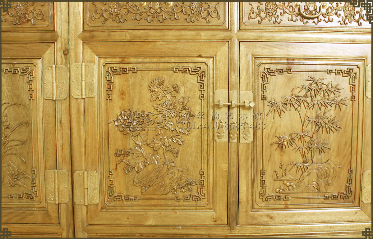 此金絲楠書(shū)柜分上下兩部分,上部分是對(duì)開(kāi)的玻璃門(mén),中間是兩個(gè)雕刻了卷草紋的抽斗,把上下兩部分分隔,下部分柜門(mén)精雕梅、蘭、竹、菊四君子圖,清雅淡泊,顯示文人清高的氣質(zhì)。可為一對(duì)組合排放,也可拆分為左右各一。既實(shí)用,又美觀,最大特點(diǎn)是具有典雅清高的書(shū)香氣,深受文人雅士、書(shū)香門(mén)第喜愛(ài)。