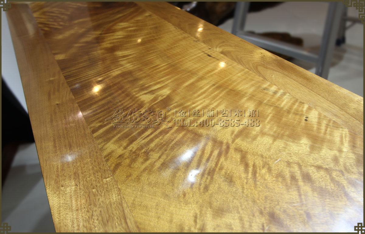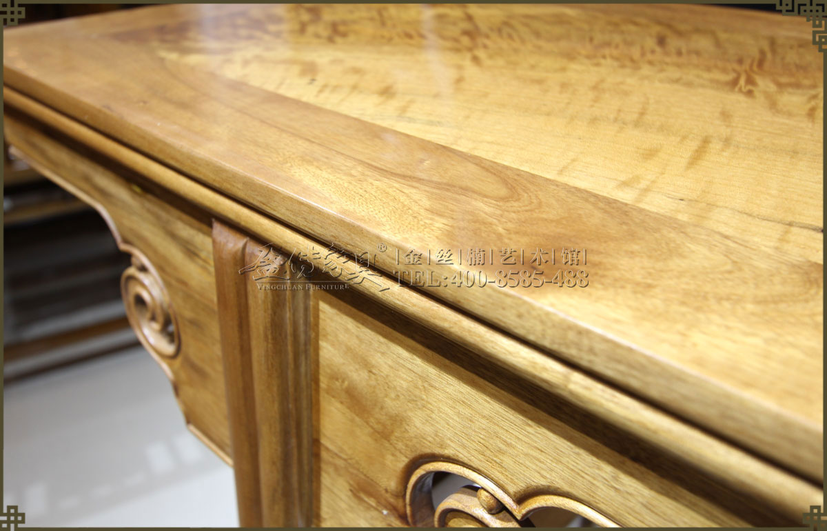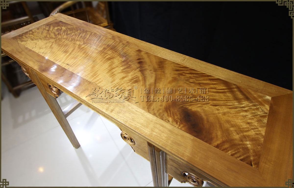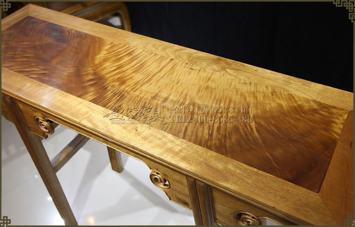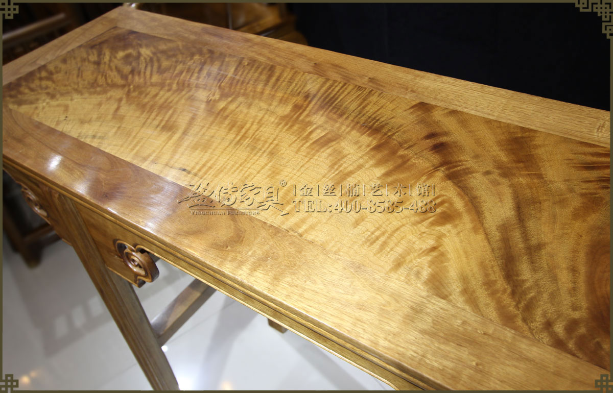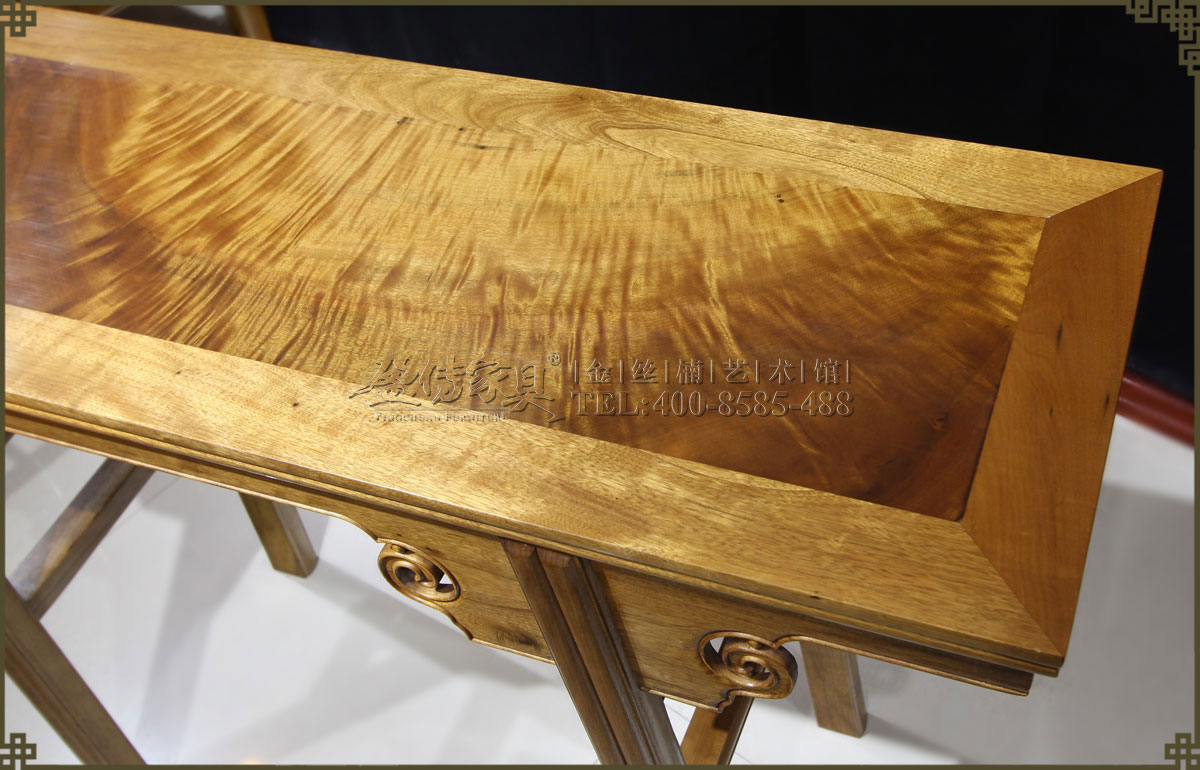 此金絲楠平頭案繼承了明式家具的風(fēng)格,造型明快,線條流暢,簡練大方,典雅優(yōu)美。制作精細(xì),夾頭榫結(jié)構(gòu)堅(jiān)固耐用,卷云紋牙頭。金絲楠獨(dú)板面板,紋路優(yōu)美,褶褶生輝,光線的變化會(huì)導(dǎo)致千變?nèi)f化的光影效果,這也是金絲楠的魅力所在。
