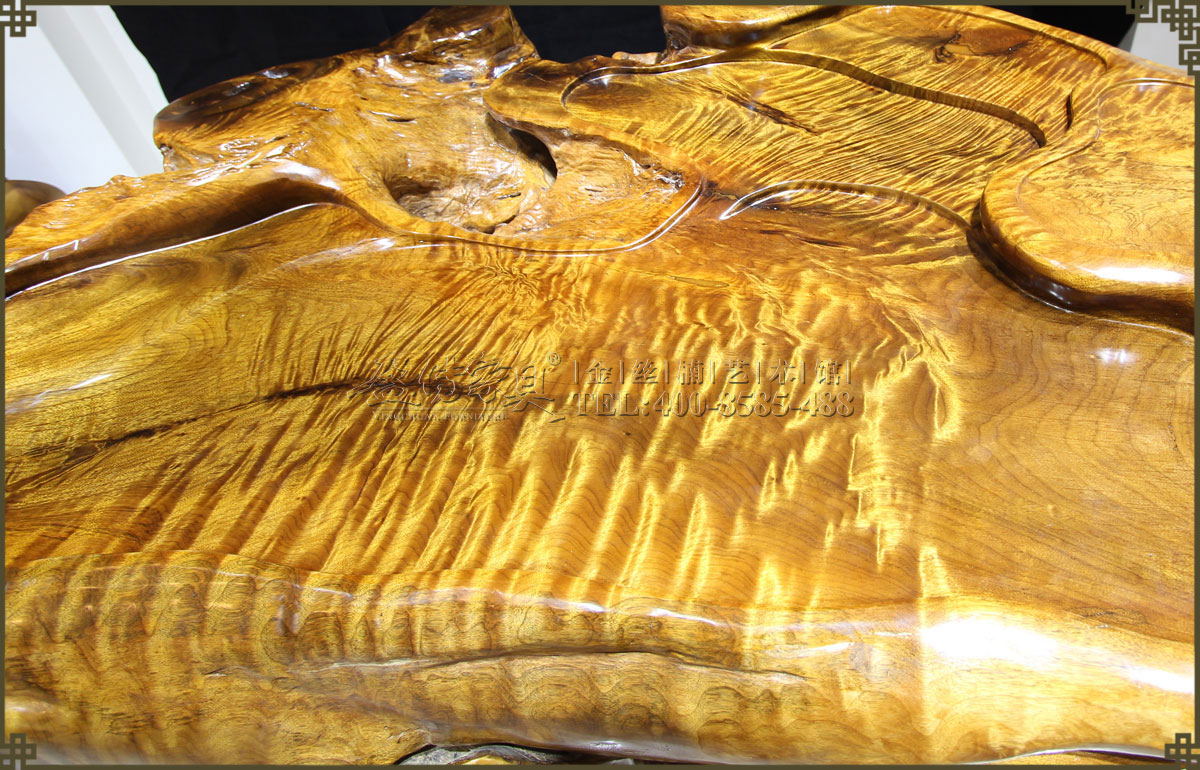 此茶臺結(jié)晶率高,金絲飽滿。紋路密集異常清晰,立體感特別強,層層疊疊,橫看成嶺側(cè)成峰,非常奇特,非常強。樹齡比普通金絲楠大,珍稀罕有,可遇而不可求,升值空間極大,無論觀賞、使用、收藏都是極品。