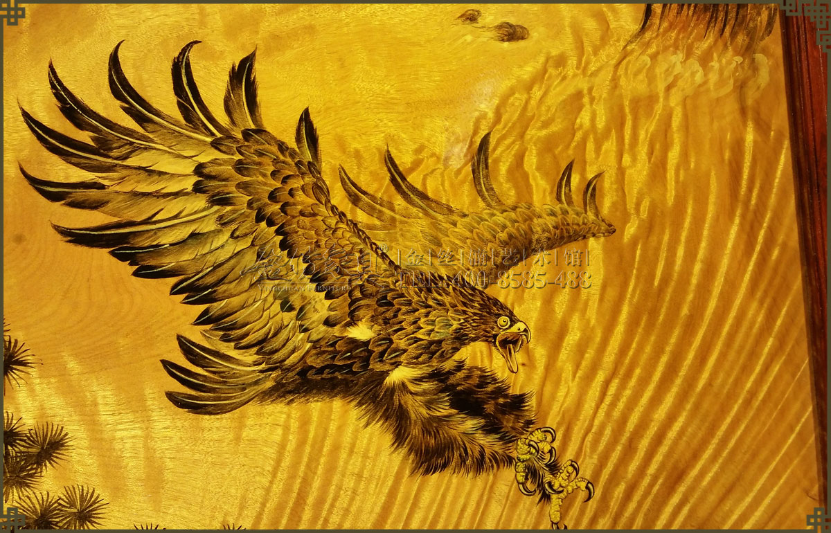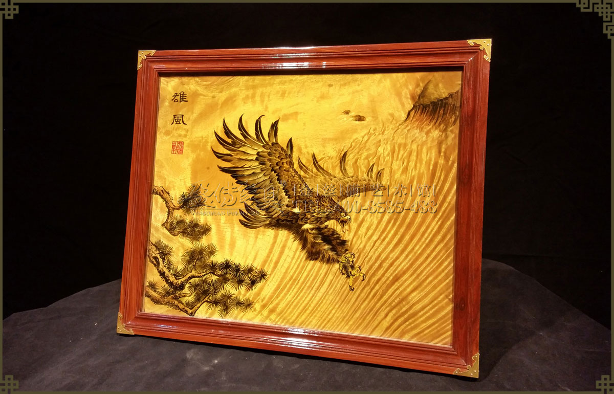 掛屏中的雄鷹一展雄風,振翅飛翔于遼闊的天空,象征雄心壯志的人在廣闊的領域中施展自己的才能,鵬程萬里。松樹蒼勁奇秀、剛毅挺拔,意境深遠。擺放在室內顯得十分大氣、高貴大方,獨特而有品位。