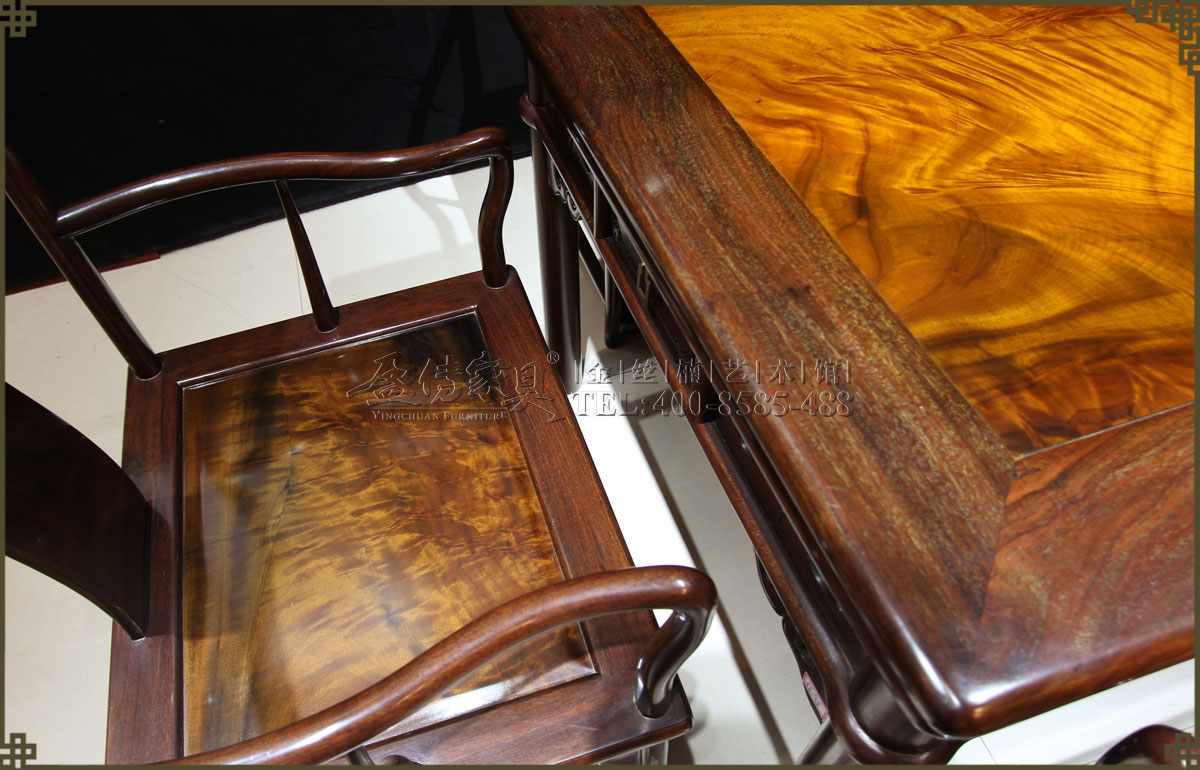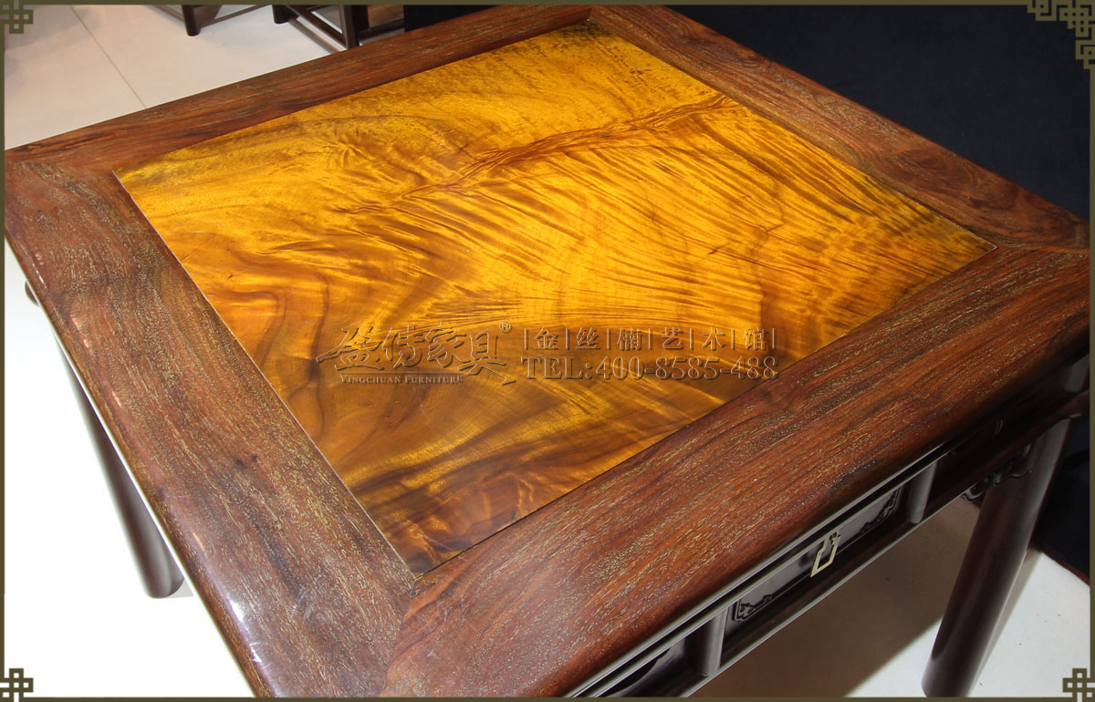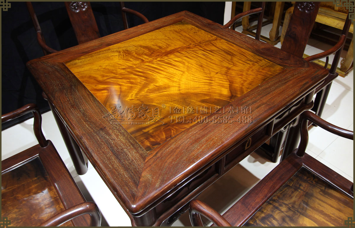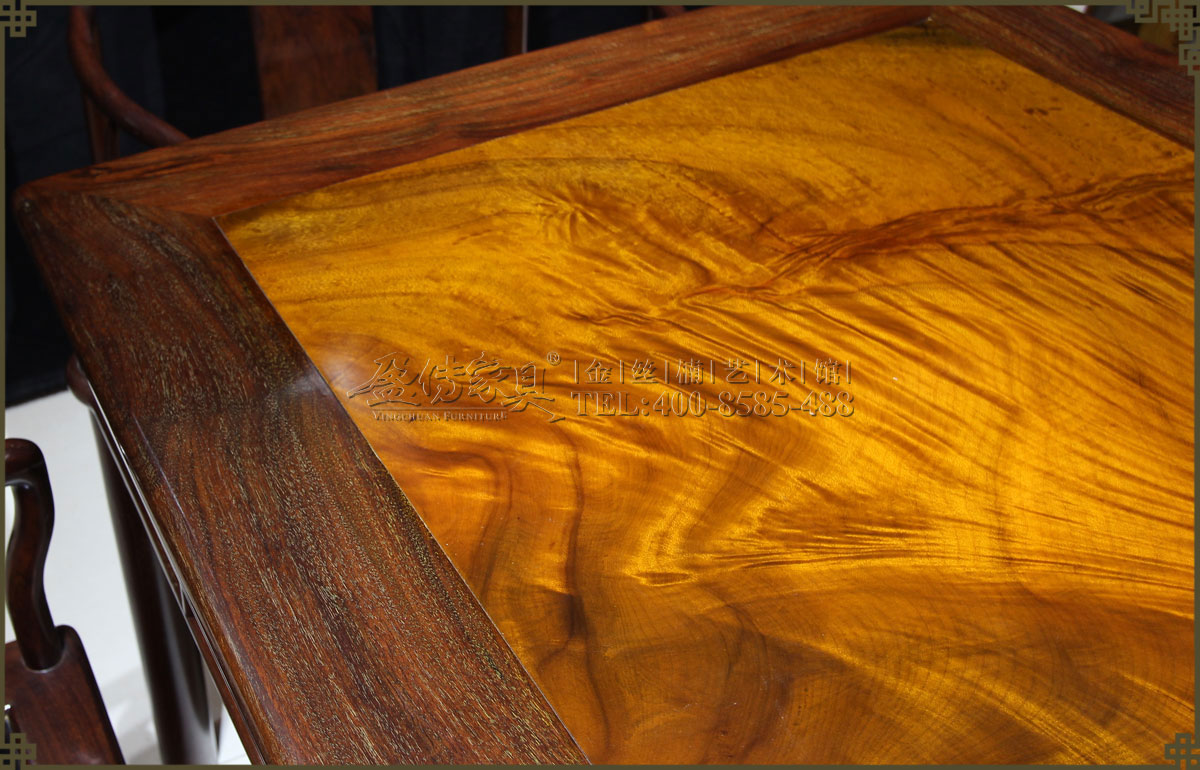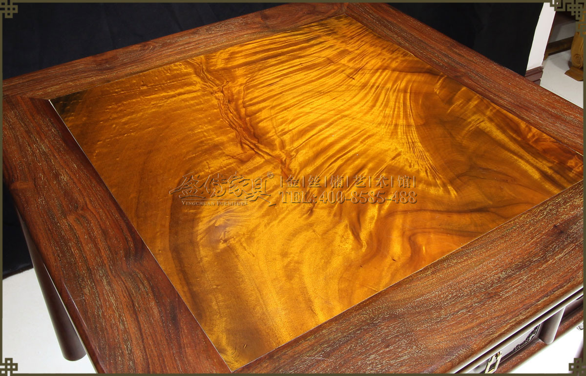 此套茶桌采用周身紅椿加金絲楠陰沉木面板制作而成,是鳳毛麟角的極佳品,可遇而不可求。紅椿古典優(yōu)雅,紋理美觀大方,給整個作品增加了獨特、靜雅的氣韻。陰沉金絲楠面板紋理瑰麗豪華,豐富密集,立體感強,橫看成嶺側成峰,像行云流水、像漫天霞光、像鳳凰羽毛、像水波漣漪,令人目不暇接,驚嘆不已。具有極高的收藏價值和欣賞價值,是金絲楠家具中不可多得的精品。