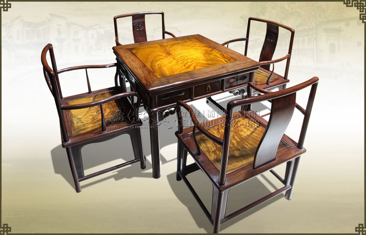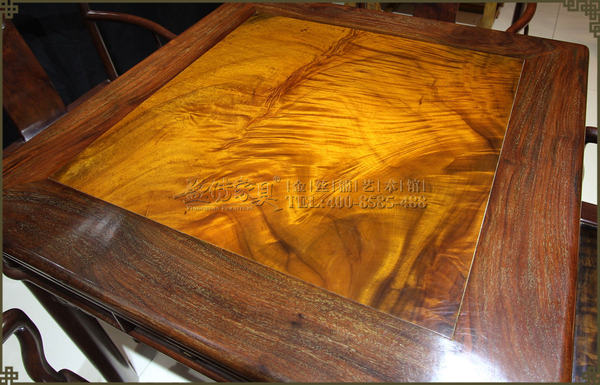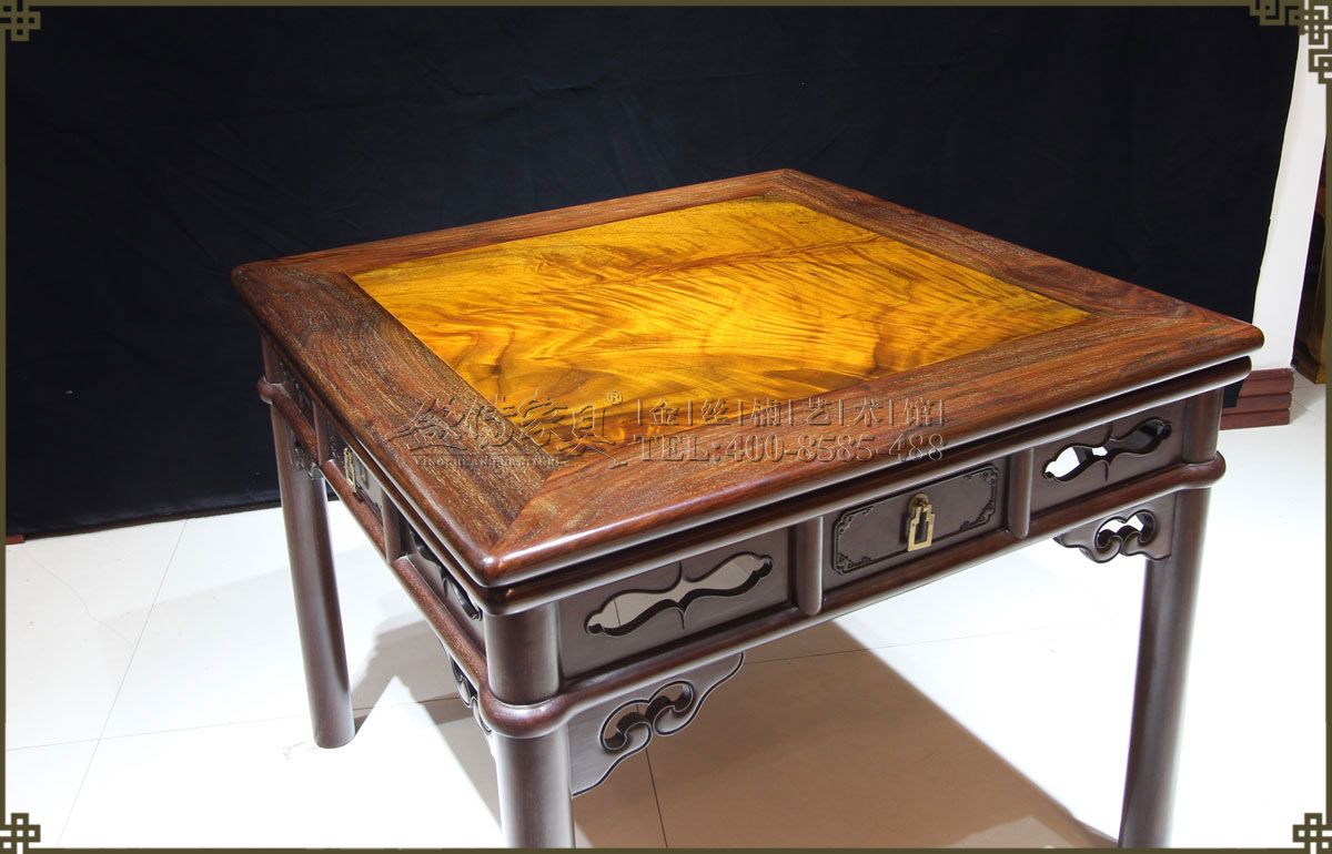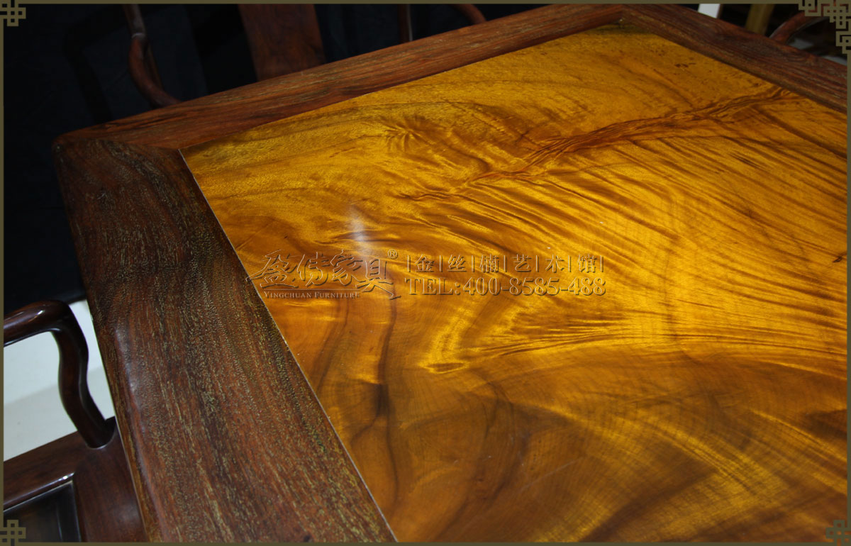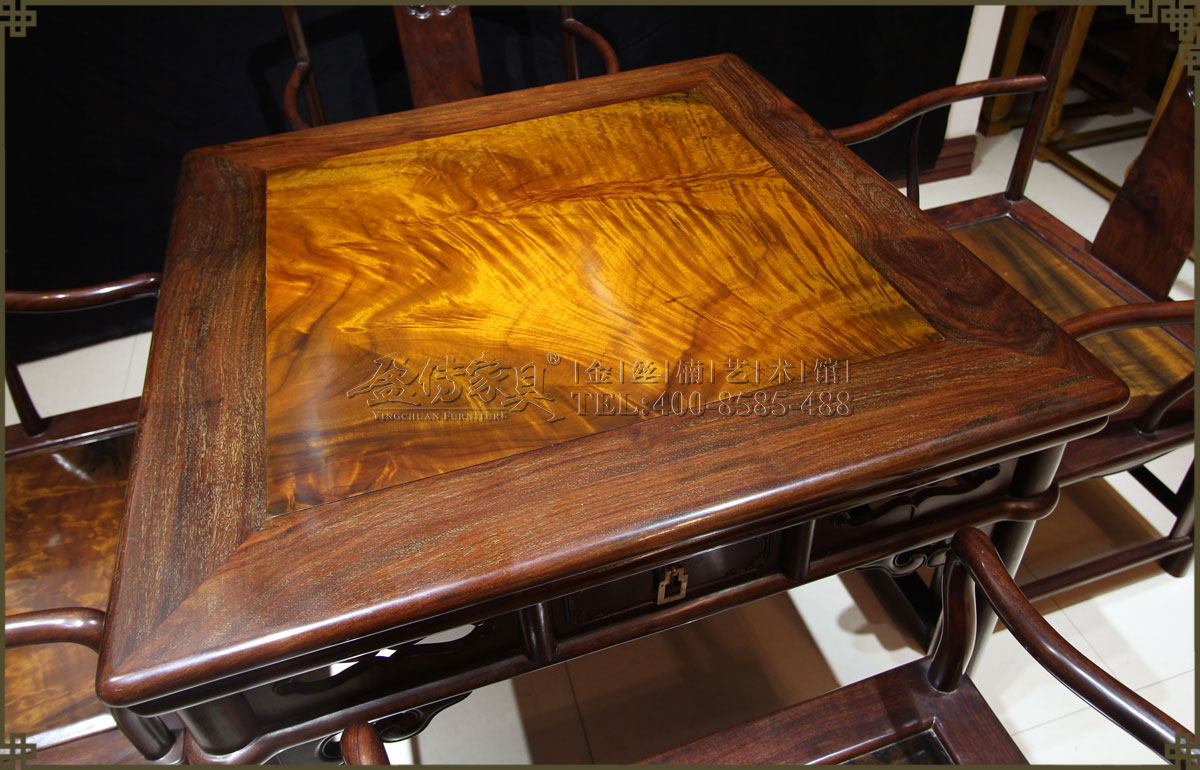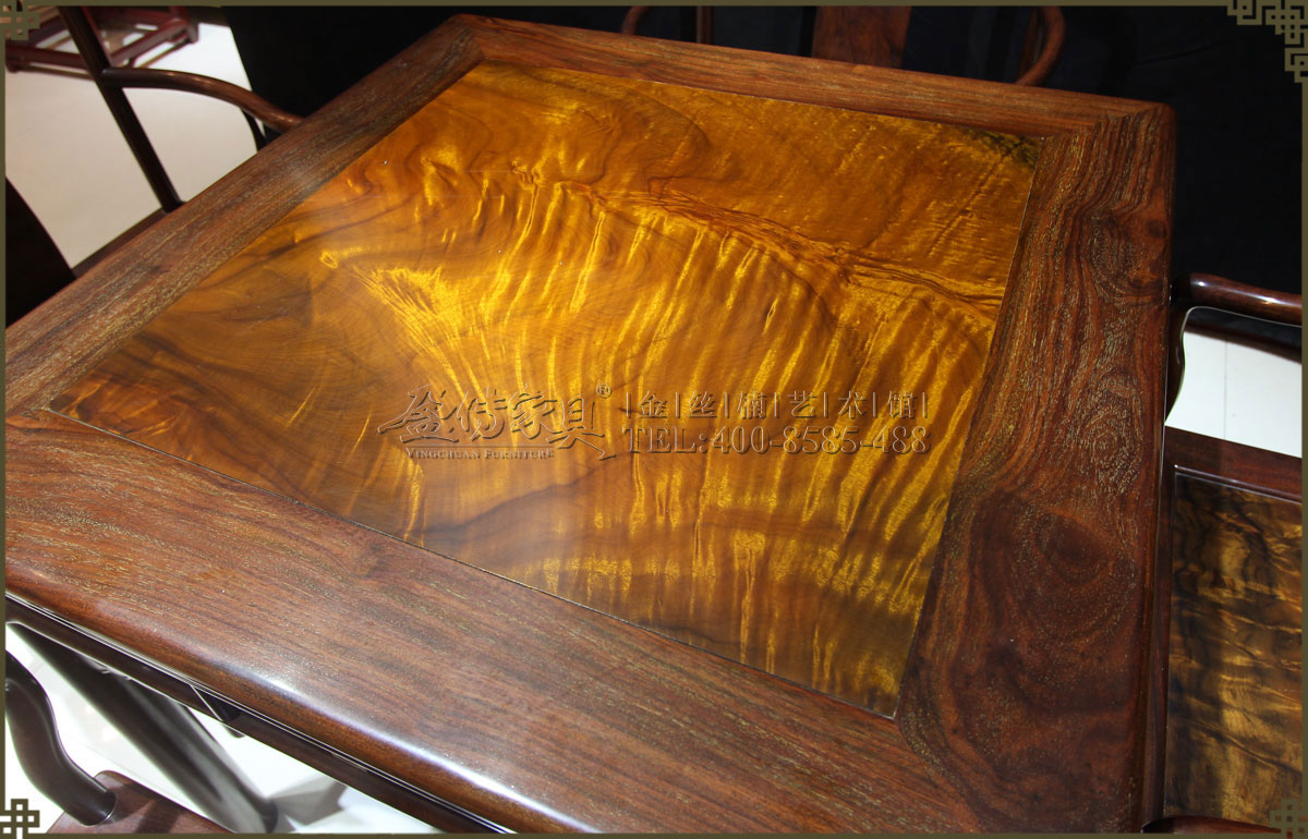 此套茶桌采用周身紅椿加金絲楠陰沉木面板制作而成,是鳳毛麟角的極佳品,可遇而不可求。紅椿古典優(yōu)雅,紋理美觀大方,給整個作品增加了獨特、靜雅的氣韻。陰沉金絲楠面板紋理瑰麗豪華,豐富密集,立體感強,橫看成嶺側成峰,像行云流水、像漫天霞光、像鳳凰羽毛、像水波漣漪,令人目不暇接,驚嘆不已。具有極高的收藏價值和欣賞價值,是金絲楠家具中不可多得的精品。