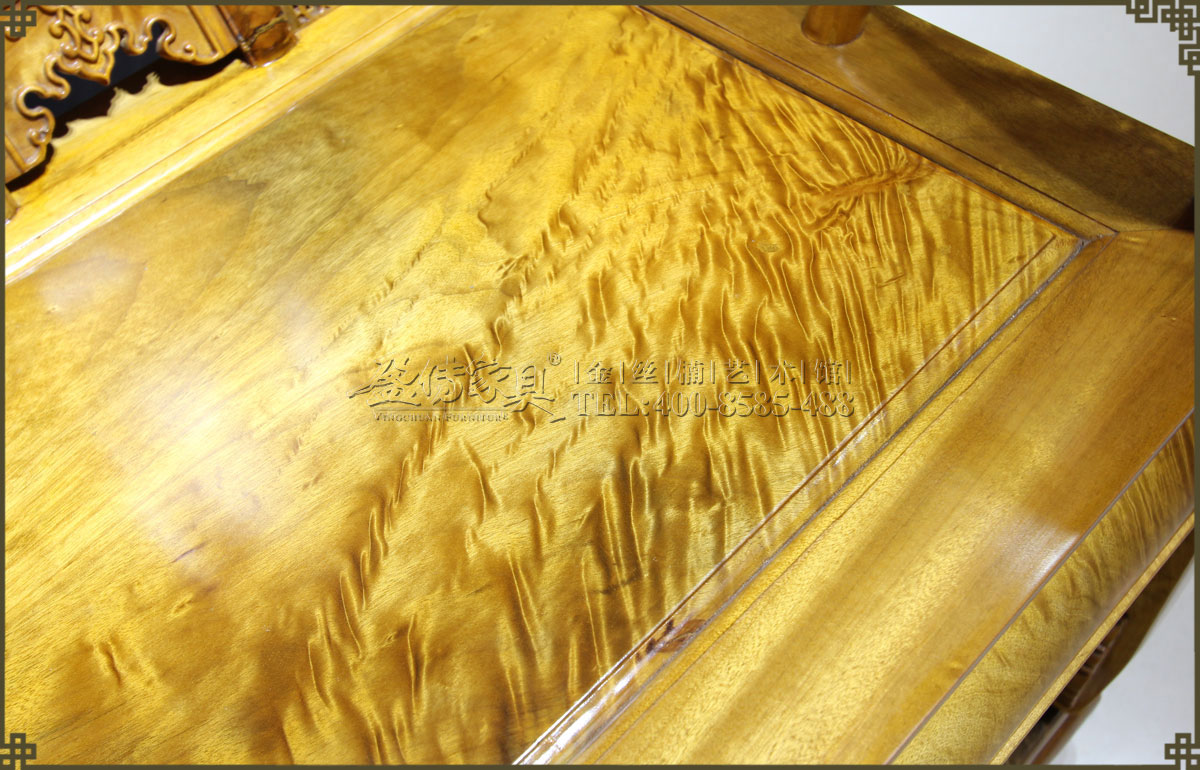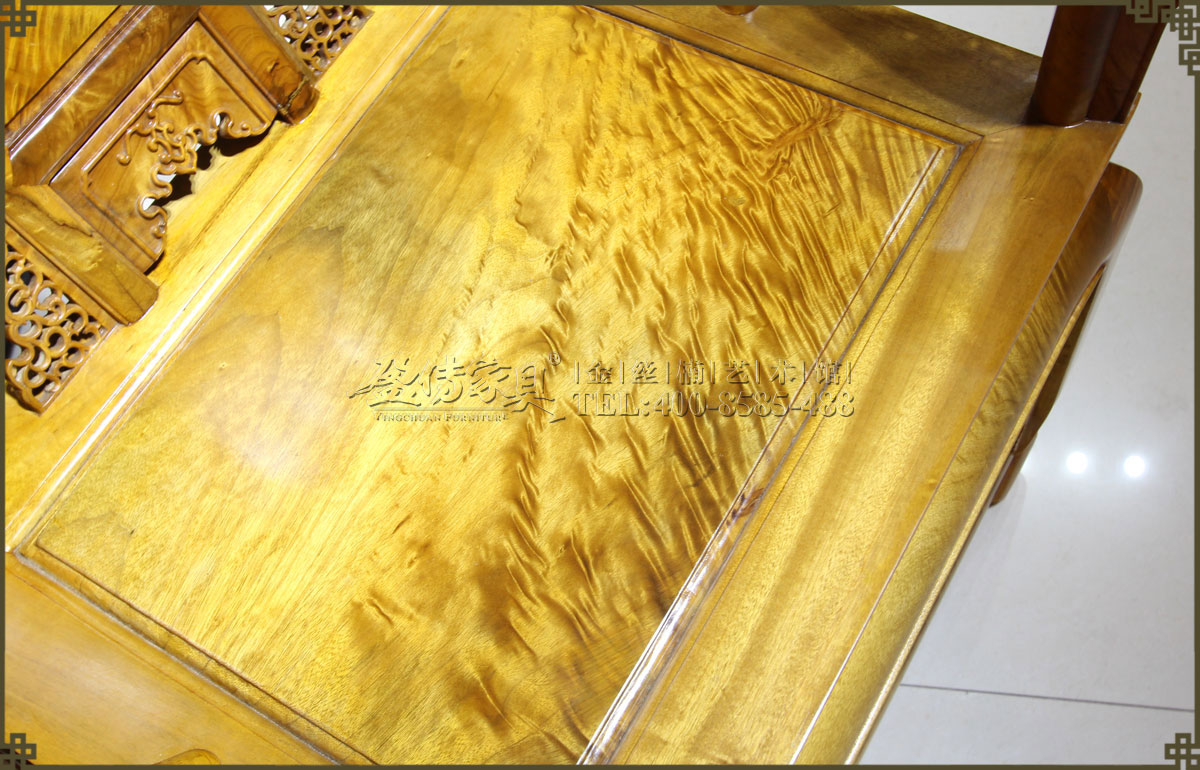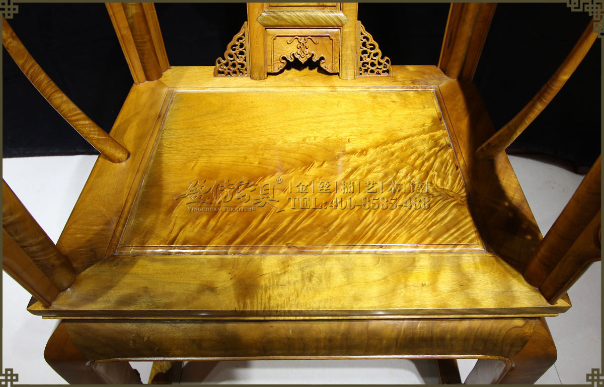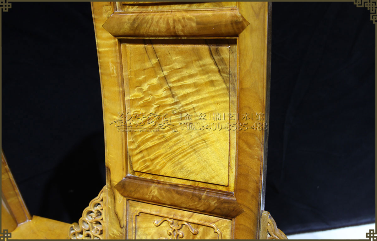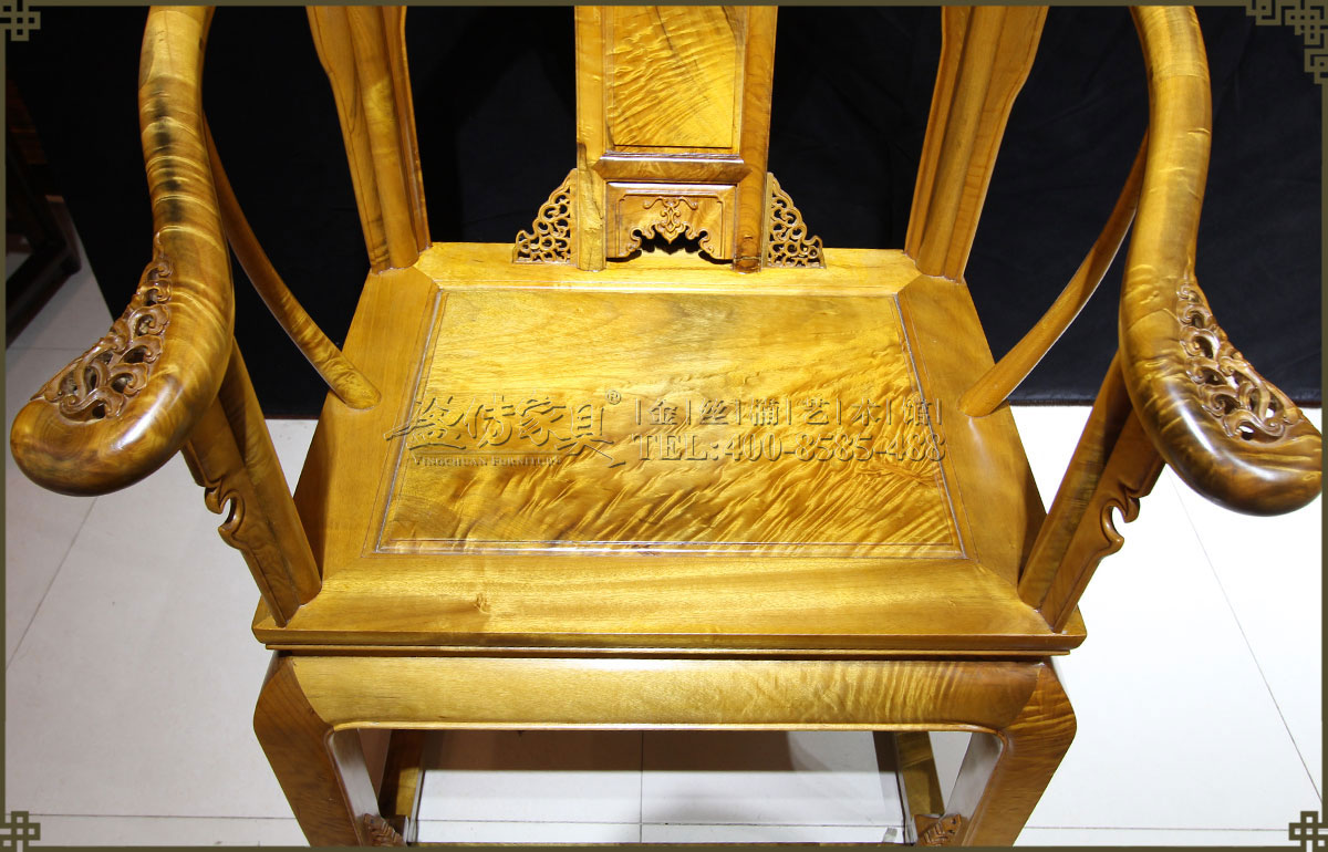 此金絲楠皇宮椅3件套整體大氣大派,高雅華貴。色澤極好,極品水波紋清晰可見,美侖美奐,變化無窮。選料精,做工細,手感極其細膩,撫之猶如嬰兒皮膚。椅背和扶手采用了高難度雕飾,工藝繁瑣,精美漂亮,更添魅力。整體含蓄而不深藏,華麗而不刺眼,越用越有味道,具有很高的藝術欣賞價值和收藏價值。