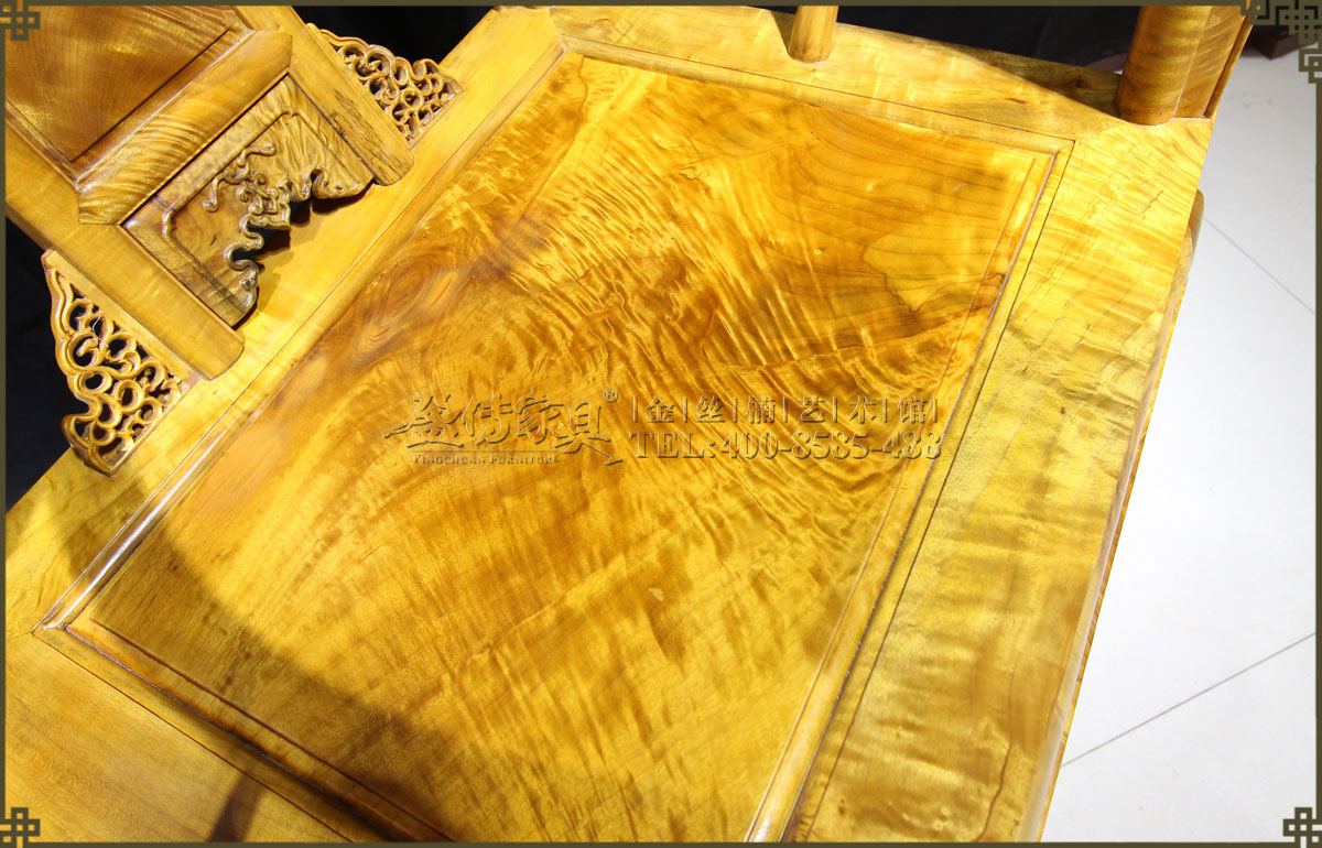 介紹:此皇宮椅選料精,采用上好的金絲楠,金絲成色高,光照下金黃奪目,璀璨眩美,紋理移步換景,如行云流水,又像波濤……做工考究精細,有束腰帶拖泥,靠背和扶手符合人體工程學,線條流暢,不失明式家具之風格。雕飾精美繁多,但不顯得繁瑣,實乃古典家具中的精品。
