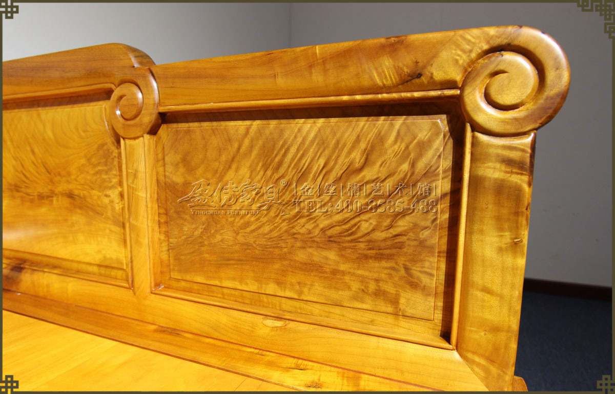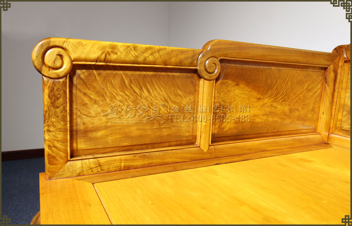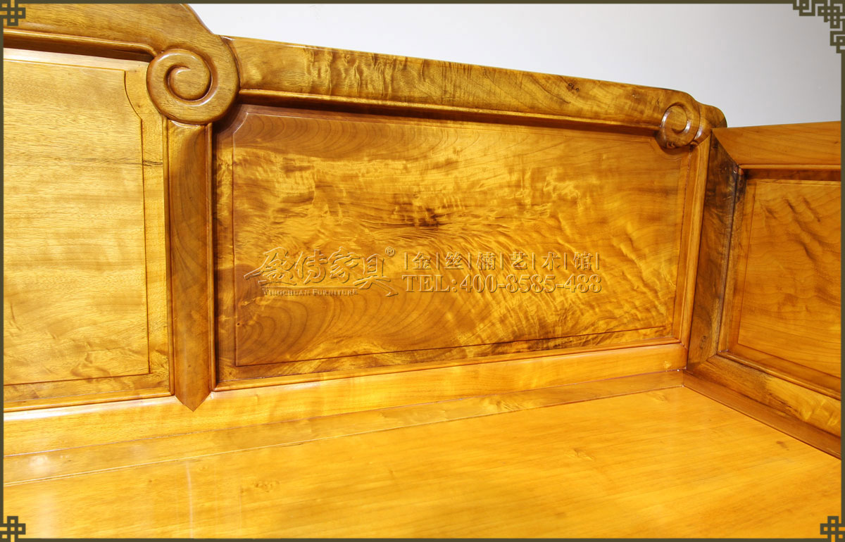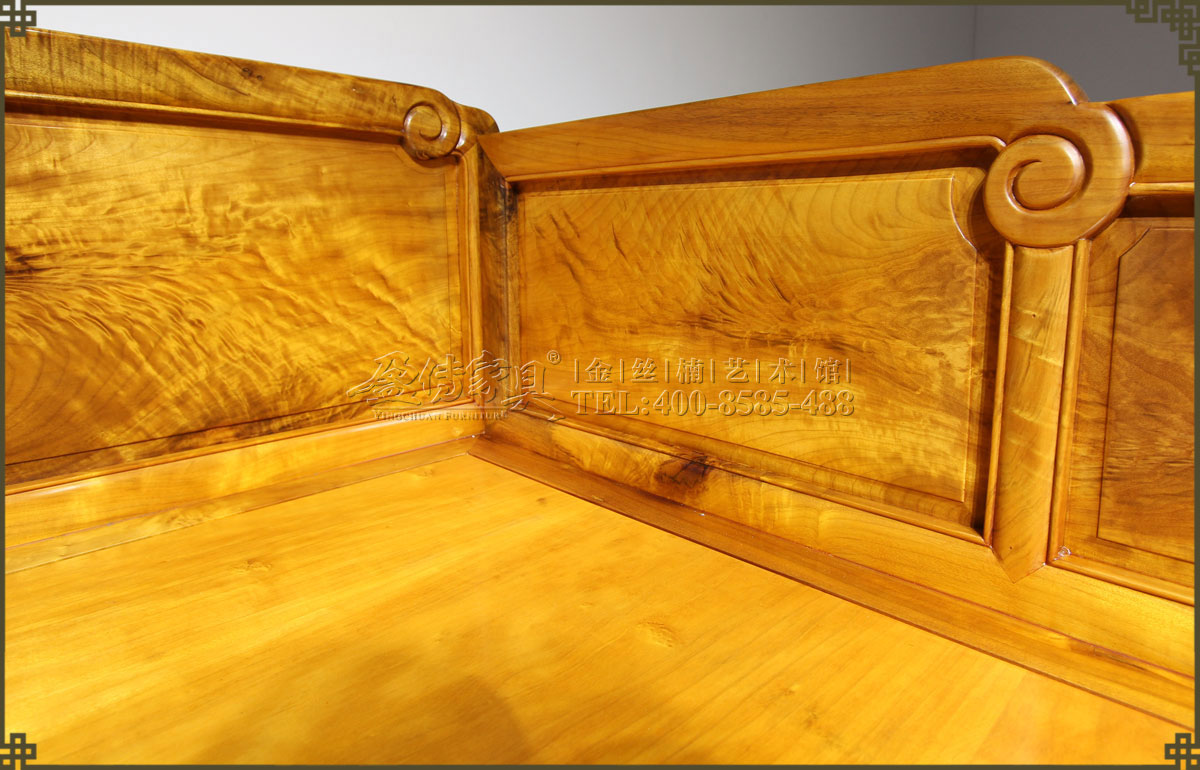 此金絲楠羅漢床最?yuàn)Z目的是七塊圍板都有非常漂亮的水波紋,密集而有立體感,清晰而有層次感,移步換景,各個(gè)角度看都令人震撼,猶如一幅幅天然的藝術(shù)畫,美到極致。更驚奇的是炕幾的面板的天然水波紋形成一條“金龍魚”的圖案,栩栩如生,活靈活現(xiàn),獨(dú)一無二,預(yù)兆著“如意吉祥”,是非常難得的金絲楠精品。