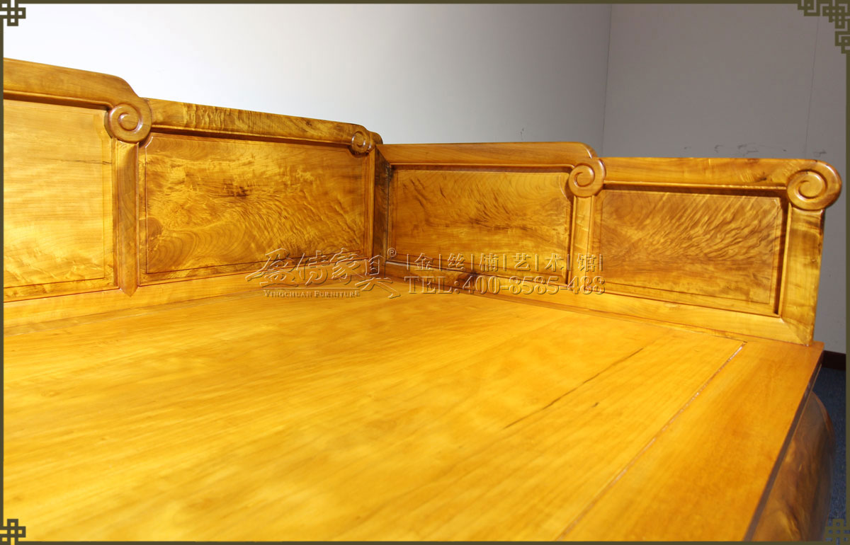 床圍采用七圍式,配置小炕幾,下設(shè)打洼束腰,鼓腿彭牙,內(nèi)翻馬蹄足,腿足用料碩大,沉雄厚實(shí),抓地極穩(wěn)。整體造型穩(wěn)重大氣,渾厚大方,威嚴(yán)端莊,具有極高的收藏價(jià)值。