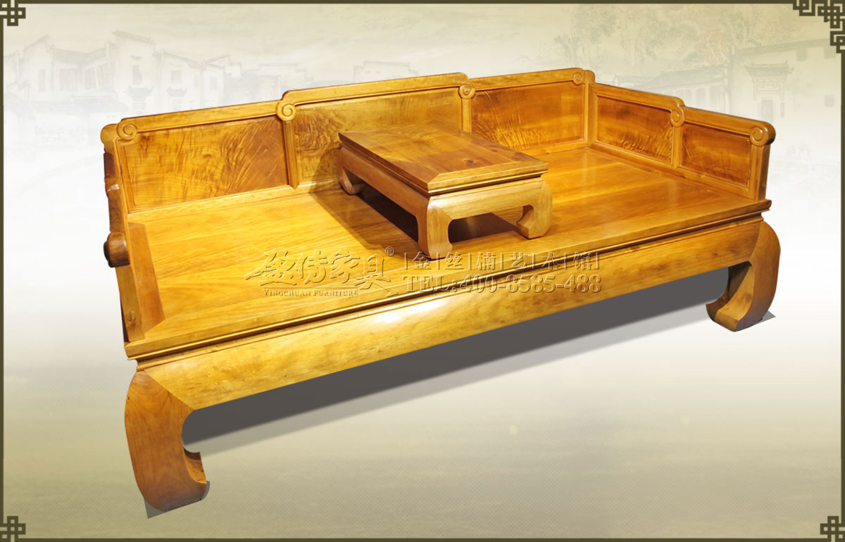 羅漢床床面光滑平整,遍布虎皮紋,大氣威武,扶手靠背部位階梯造型,象征步步高升。四腿采用內(nèi)翻馬蹄足,沉穩(wěn)厚實(shí),雄壯有力。