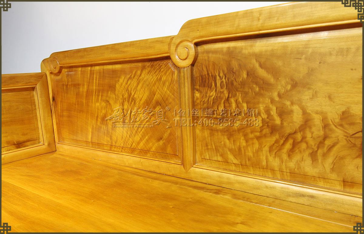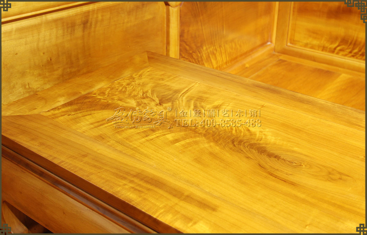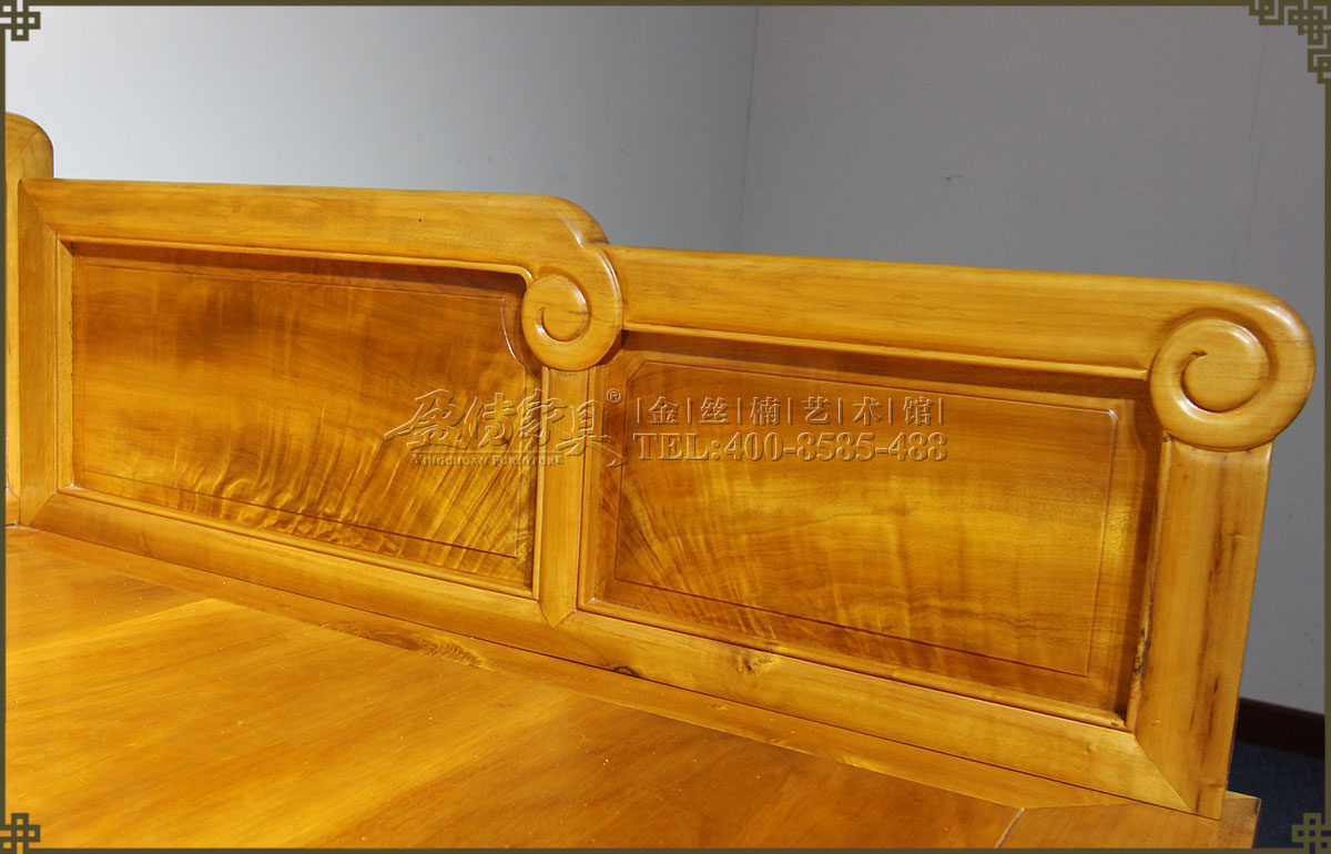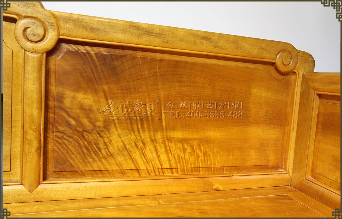 此金絲楠羅漢床最?yuàn)Z目的是七塊圍板都滿布金絲,如水波似云彩,云龍交匯,造型生動(dòng),層次豐富,移步換景,各個(gè)角度看都令人震撼,猶如一幅幅天然的藝術(shù)畫,美輪美奐。