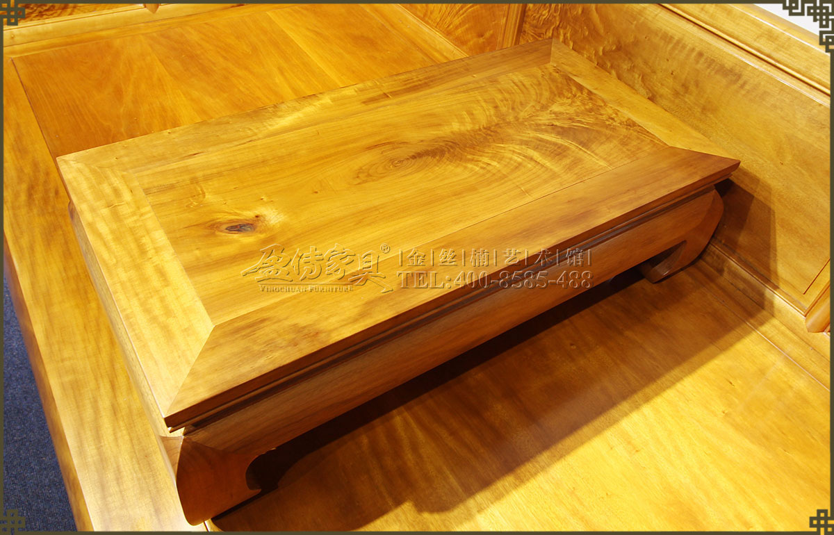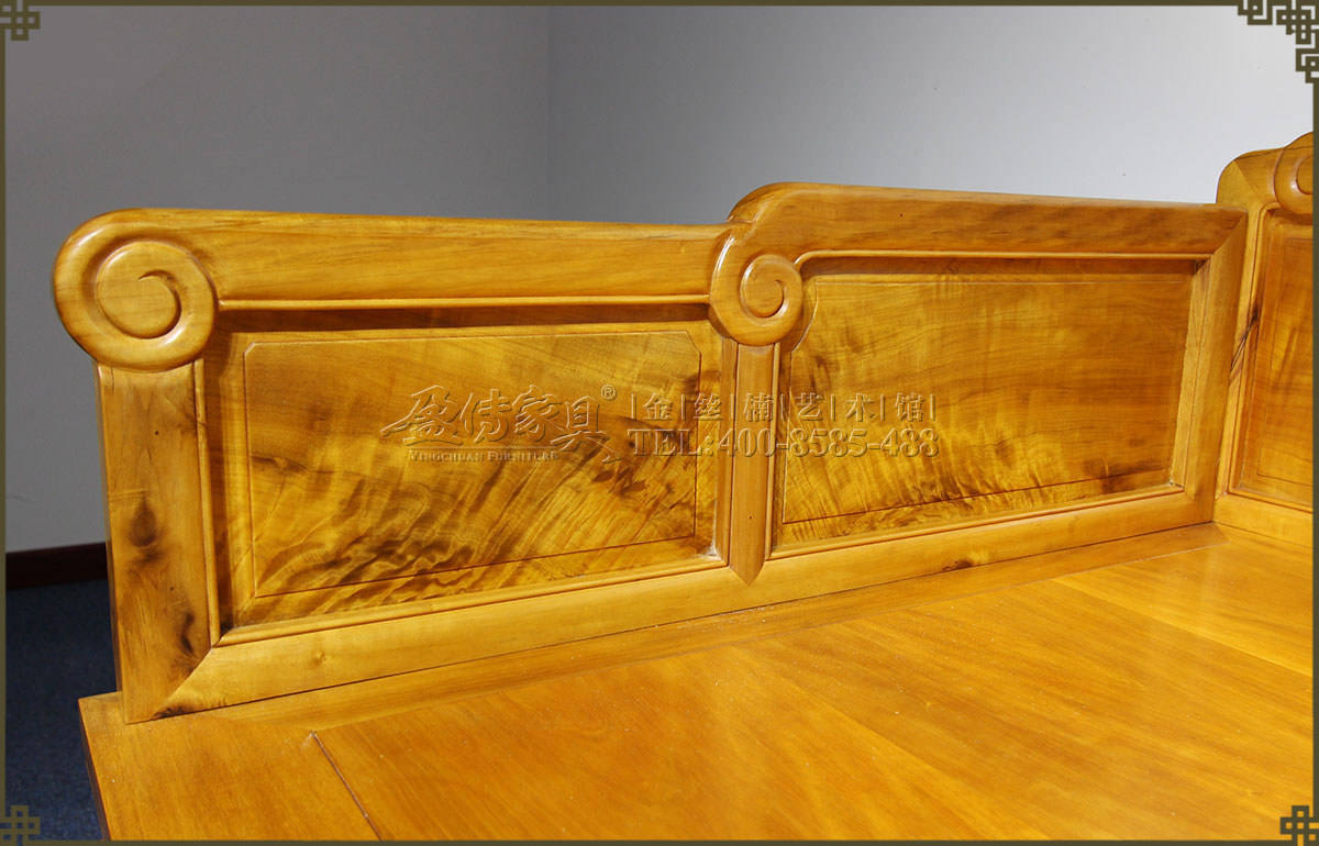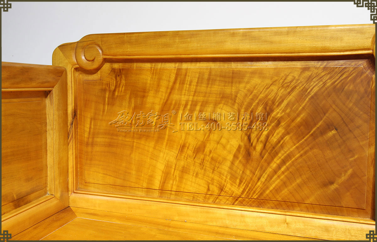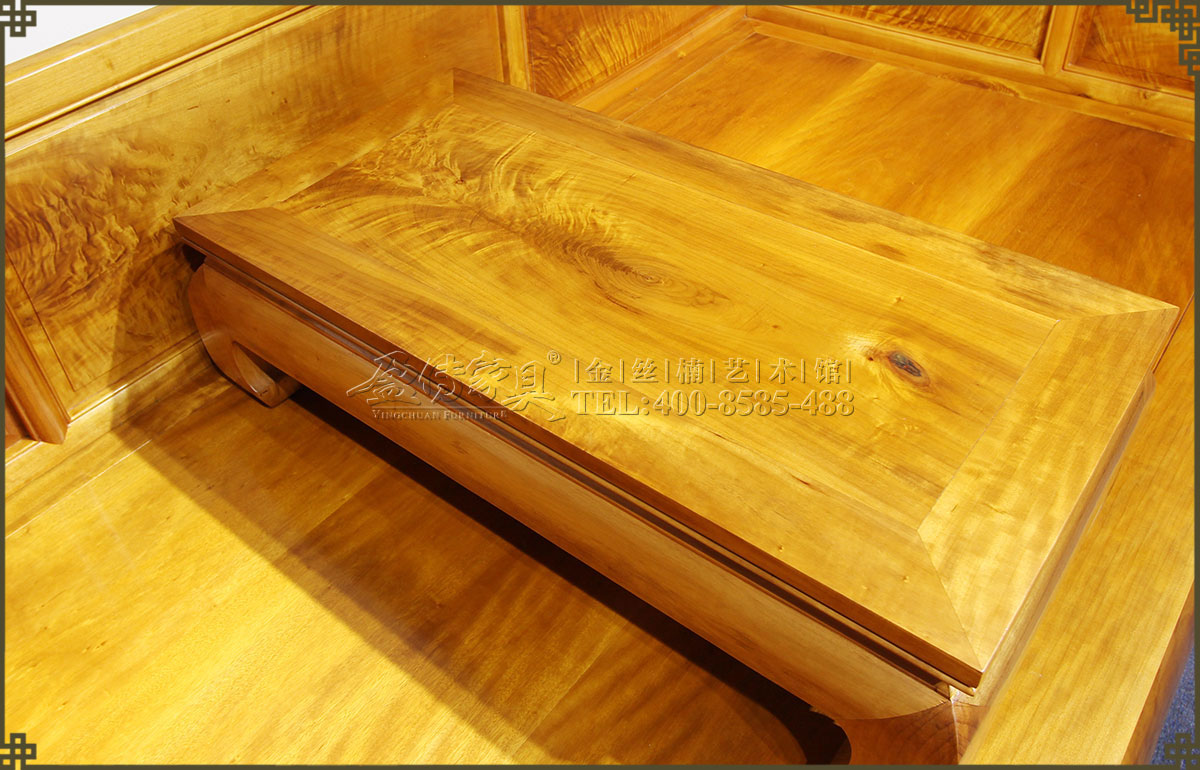 此金絲楠羅漢床最?yuàn)Z目的是七塊圍板都滿布金絲,如水波似云彩,云龍交匯,造型生動(dòng),層次豐富,移步換景,各個(gè)角度看都令人震撼,猶如一幅幅天然的藝術(shù)畫,美輪美奐。