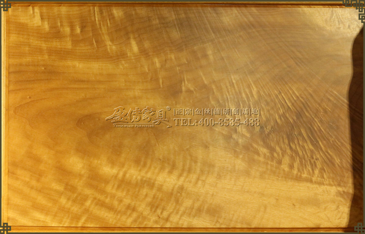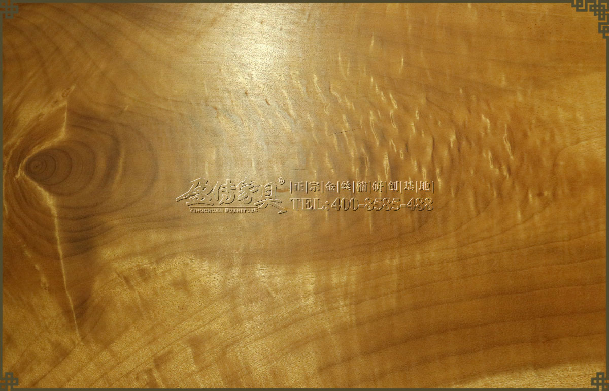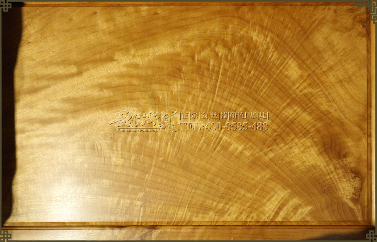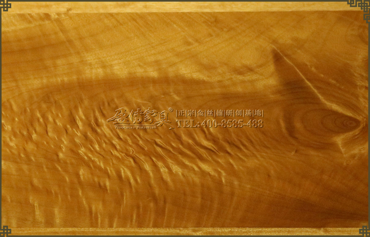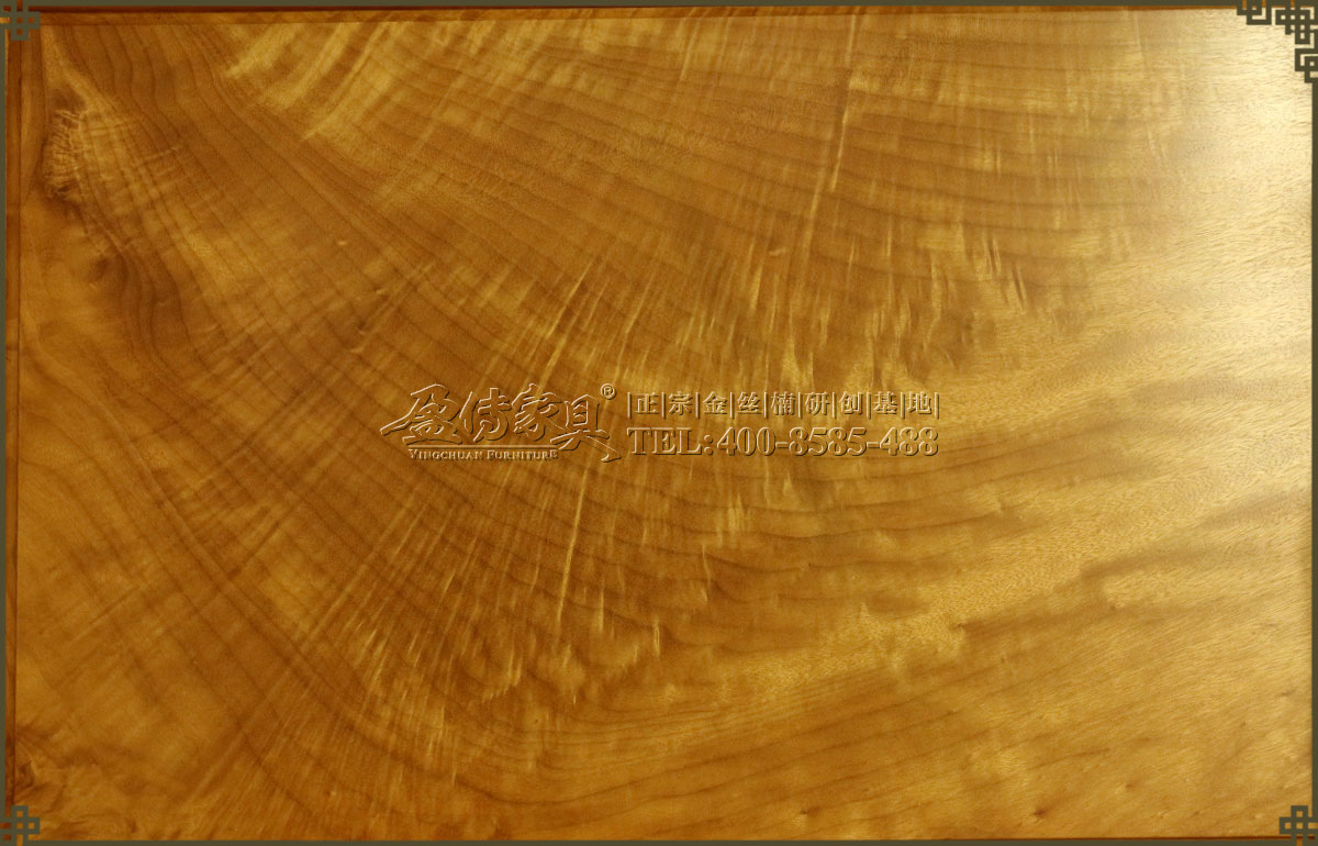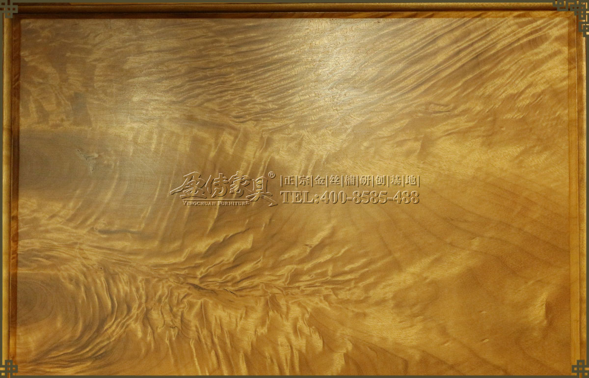 此款金絲楠沙發面板紋理對稱,實為難得的上品之作,其背板天然形成濤濤江水圖案,泛波粼粼,風景迤邐,引人遐想。高花架、方幾、炕幾的面板之中均游弋著一尾金鯉,形態各異,金絲隱隱,更是寓意連年有余。