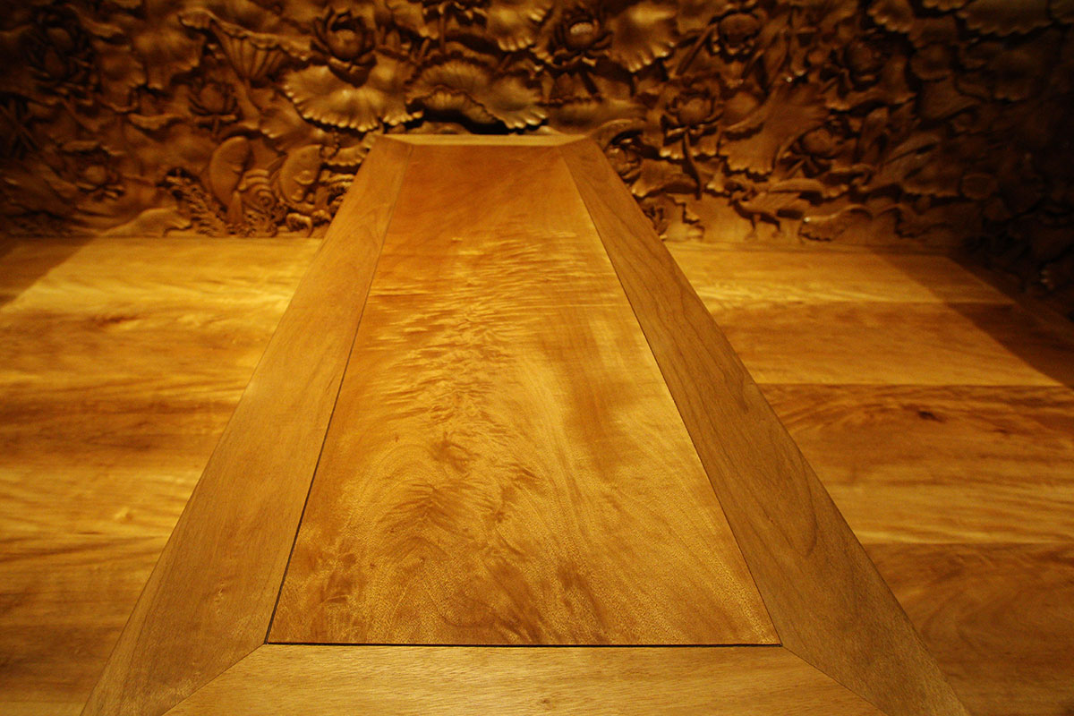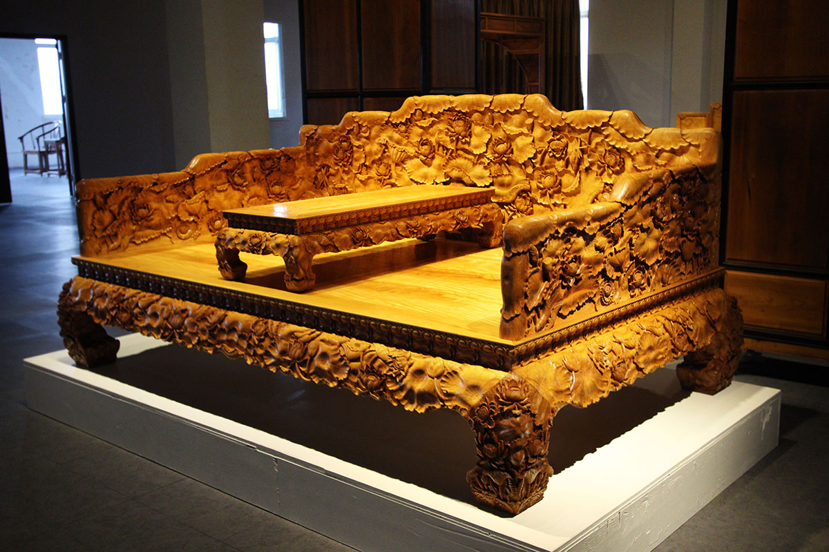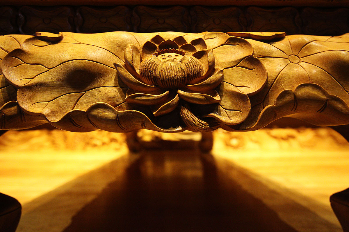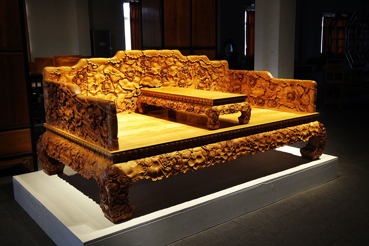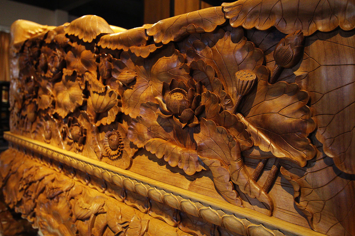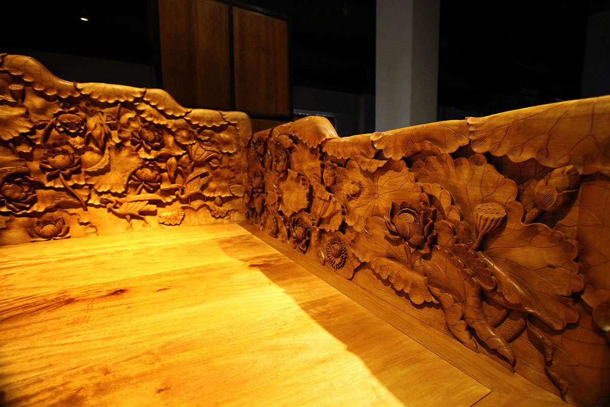 此款金絲楠荷花羅漢床器型碩大,用料厚重,采用純手工雕刻工藝,雕花繁而不亂,舒展有度,具有清新自然的藝術效果,實乃收藏臻品