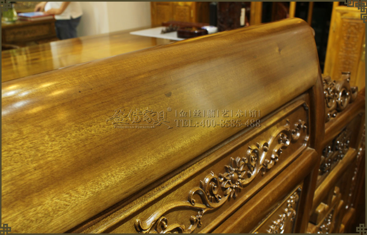 “讀書破萬卷,下筆如有神”。此金絲楠客廳椅的創意是“家藏萬卷書”、“書中自有黃金屋”。能工巧匠使用上等的金絲楠老料,精工制造7件組合式客廳椅,擺在客廳之內,頓覺滿堂書香,既不失文人墨客的儒雅,又顯得富貴大氣。