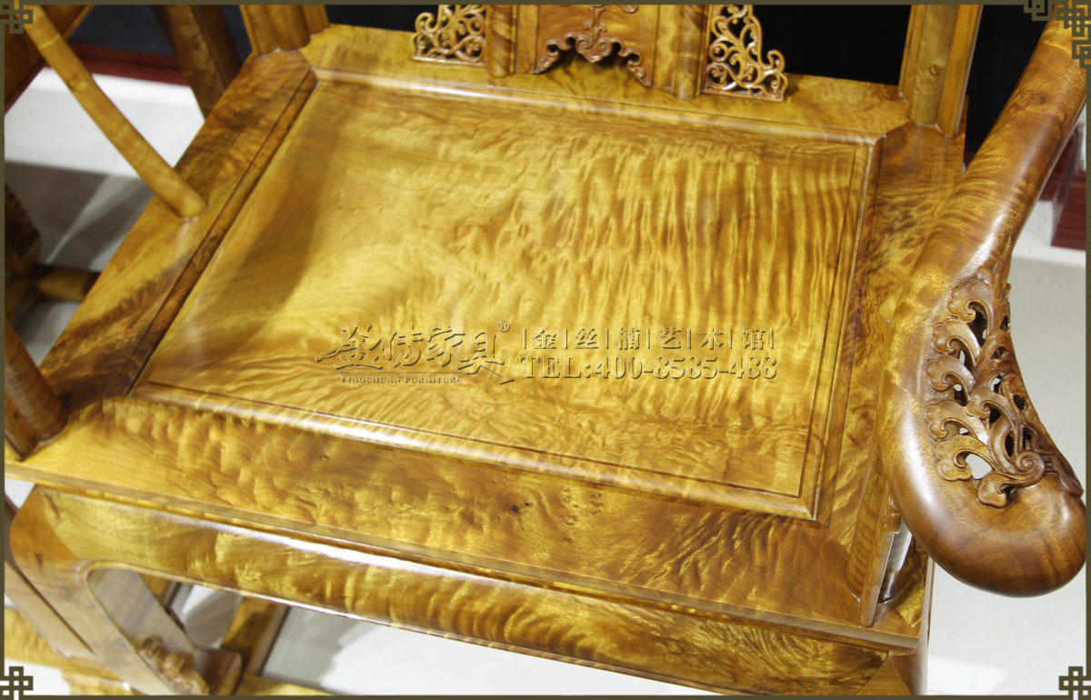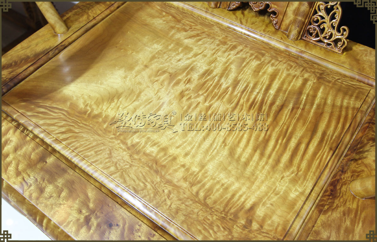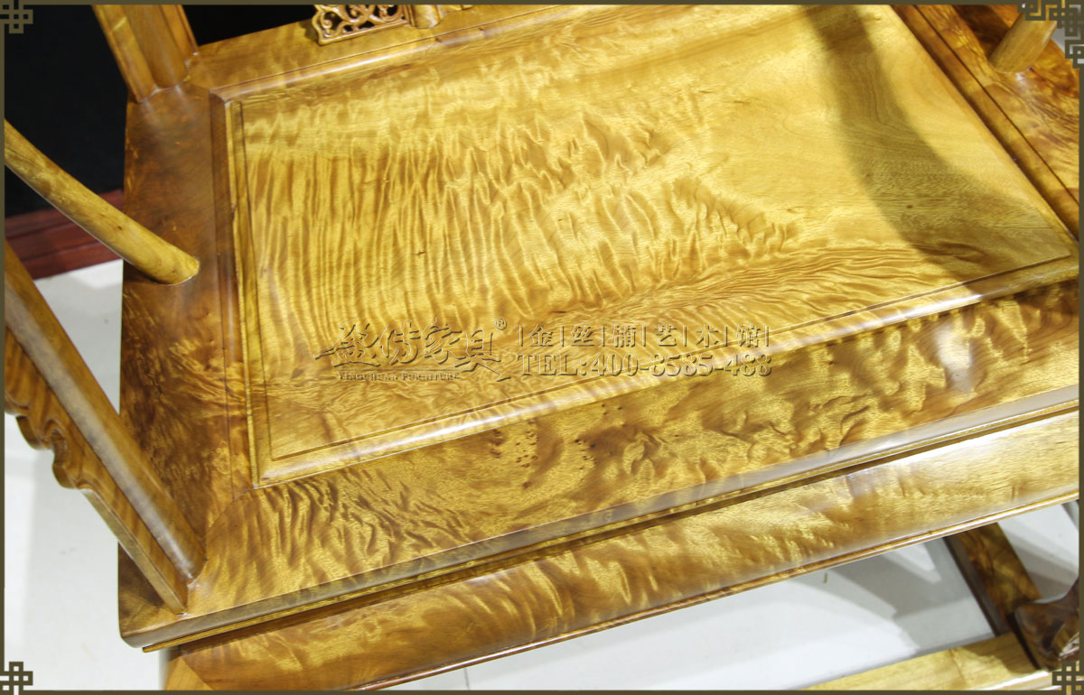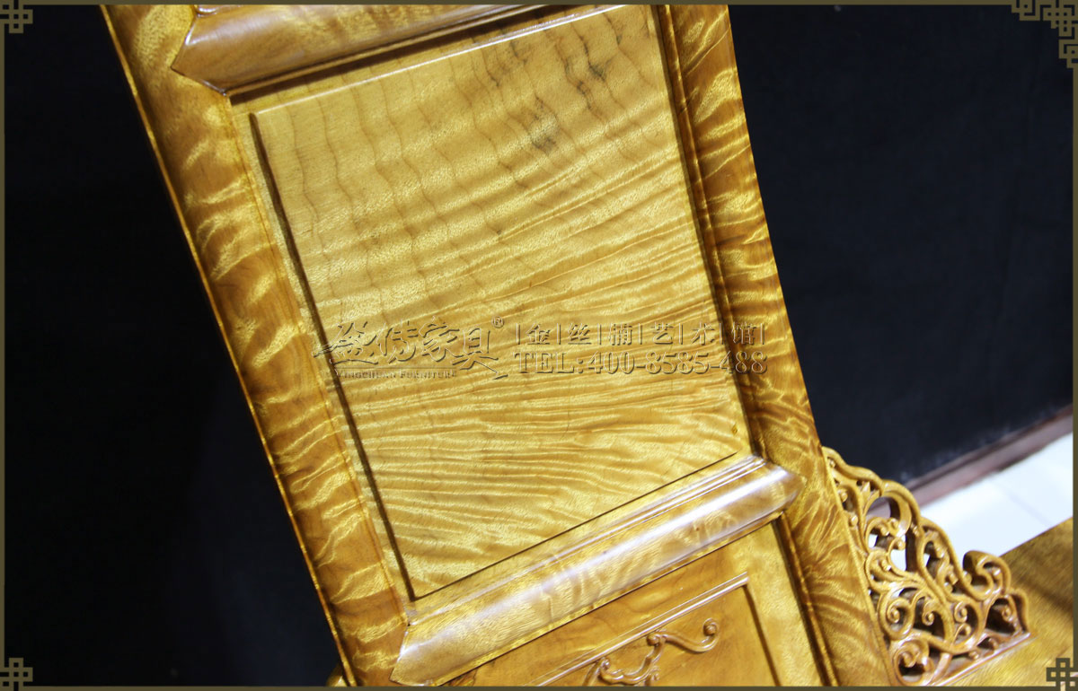 此皇宮椅三件套最大特點是有著震撼人心的滿水波紋路,富麗堂皇,流光溢彩,大氣磅礴,移步換景,像波光粼粼的水浪、像連綿不絕的山峰、像絢爛多變的云彩,縈繞著濃烈的富麗氣質,沿襲皇家風范,彰顯高貴品質,大氣之感撲面而來,讓人心靈完全被深深地折服。