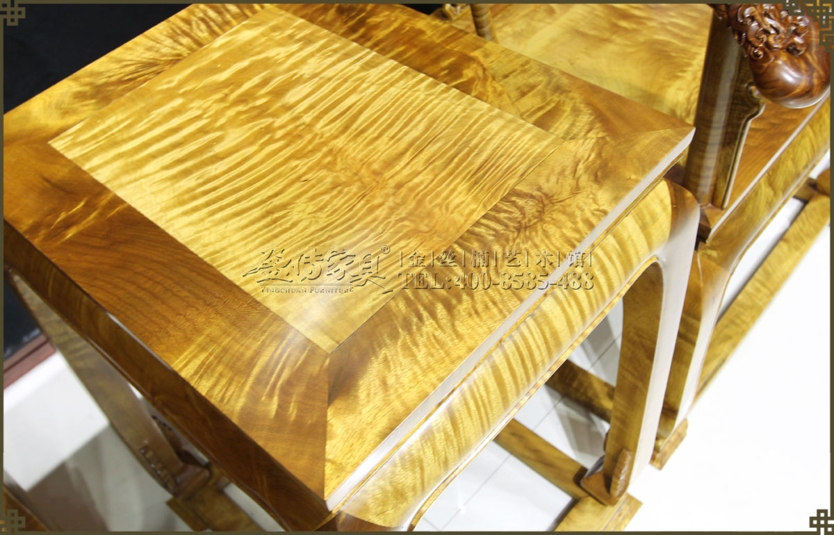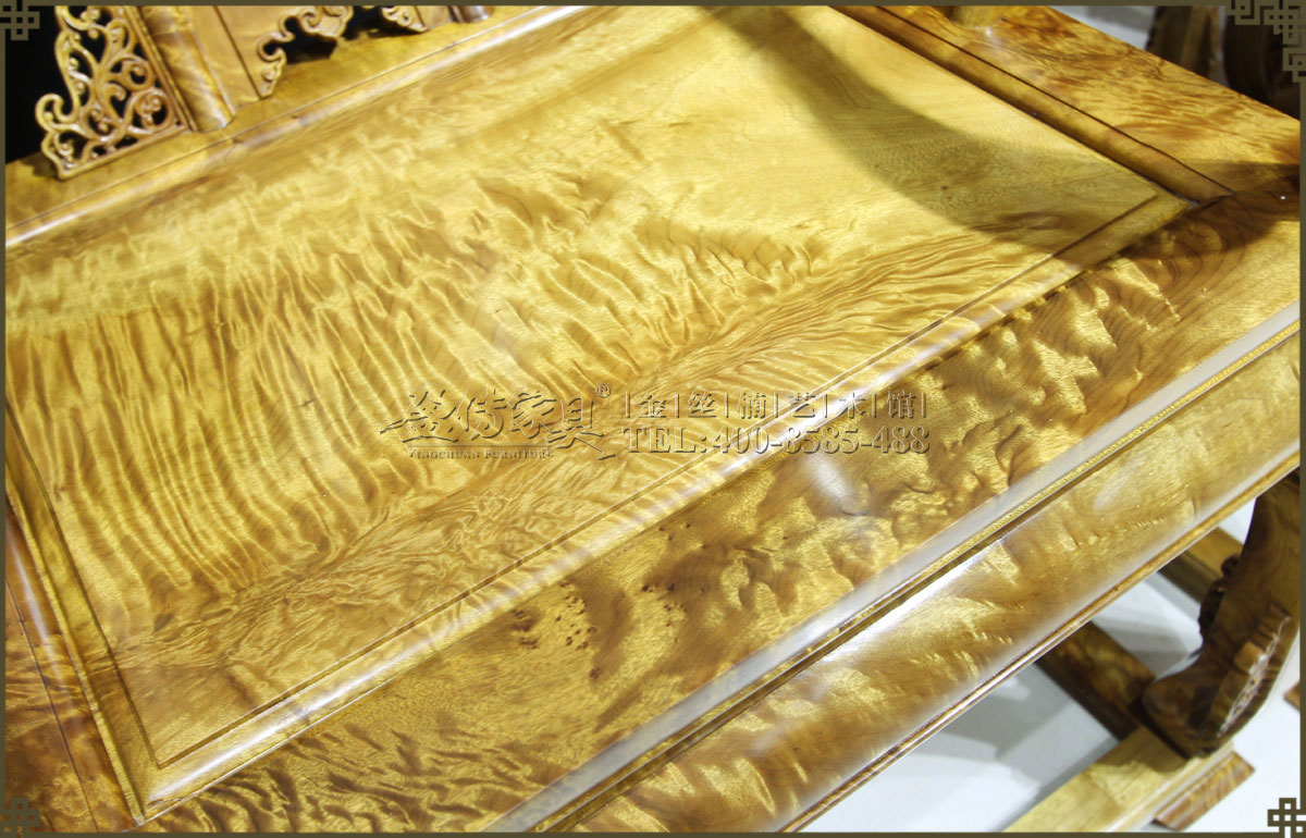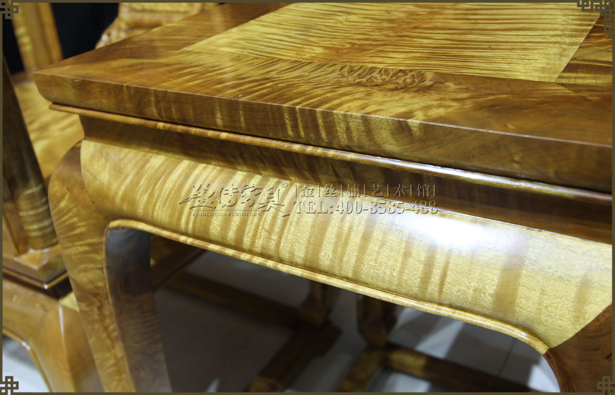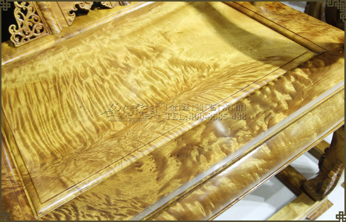 此皇宮椅三件套最大特點是有著震撼人心的滿水波紋路,富麗堂皇,流光溢彩,大氣磅礴,移步換景,像波光粼粼的水浪、像連綿不絕的山峰、像絢爛多變的云彩,縈繞著濃烈的富麗氣質,沿襲皇家風范,彰顯高貴品質,大氣之感撲面而來,讓人心靈完全被深深地折服。