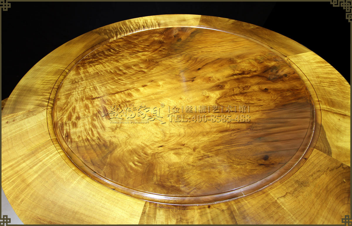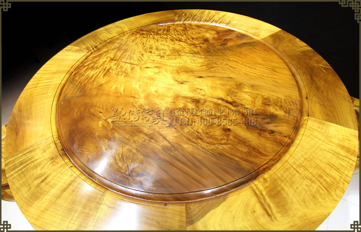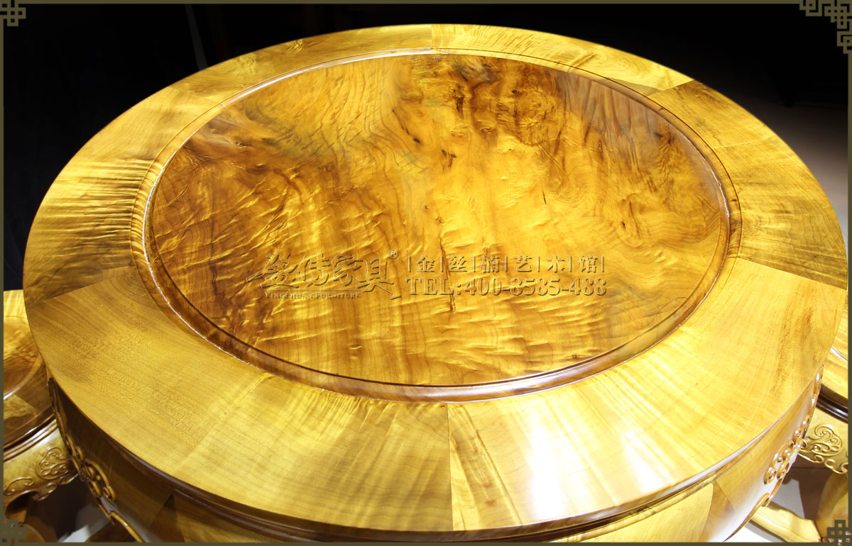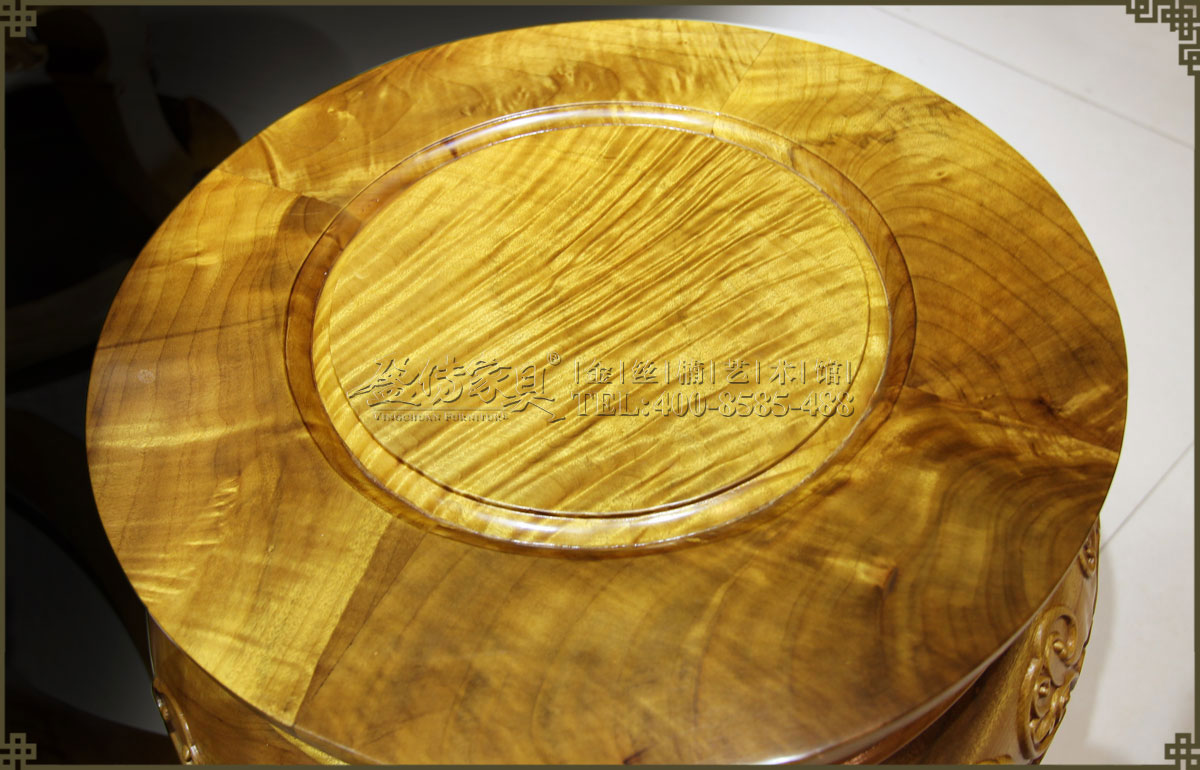 此圓鼓桌最大特點是桌面是獨板金絲楠,如此大而且紋理如此豐富的大金絲楠板實屬難得,可遇而不可求。無論是桌面還是凳面,水波紋都十分清晰立體,瑰麗生動,盡顯壯闊豪華,如夢如幻的美,猶如一幅幅天然的藝術畫,具有很高的欣賞價值,令人驚嘆!